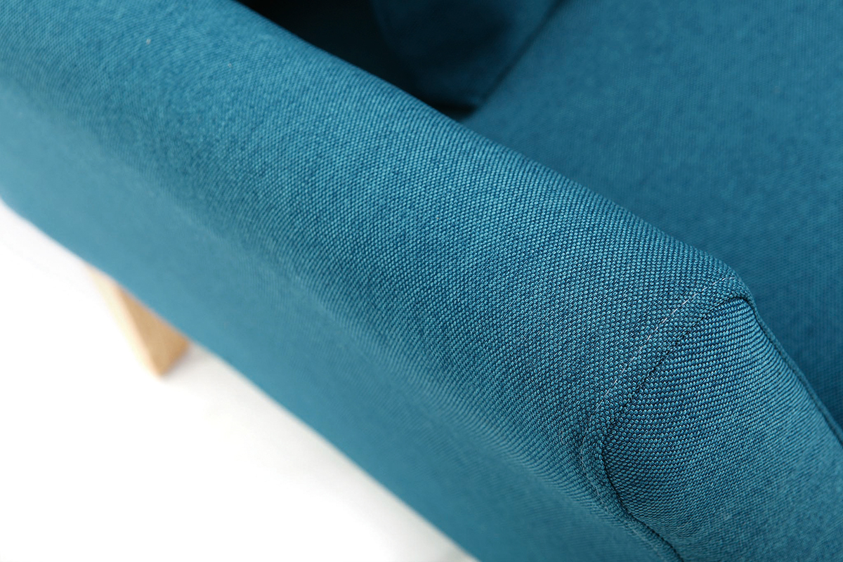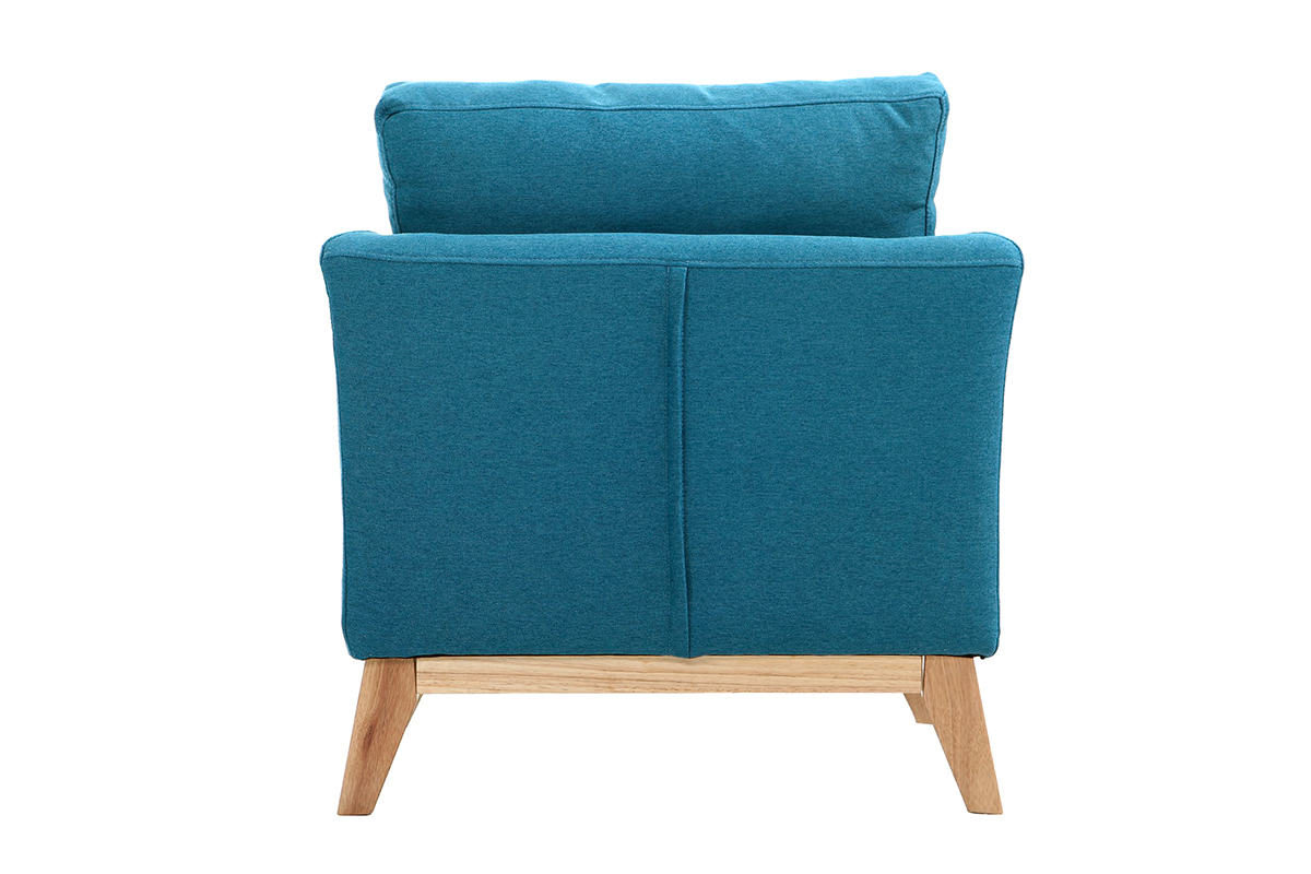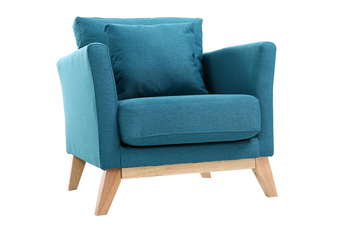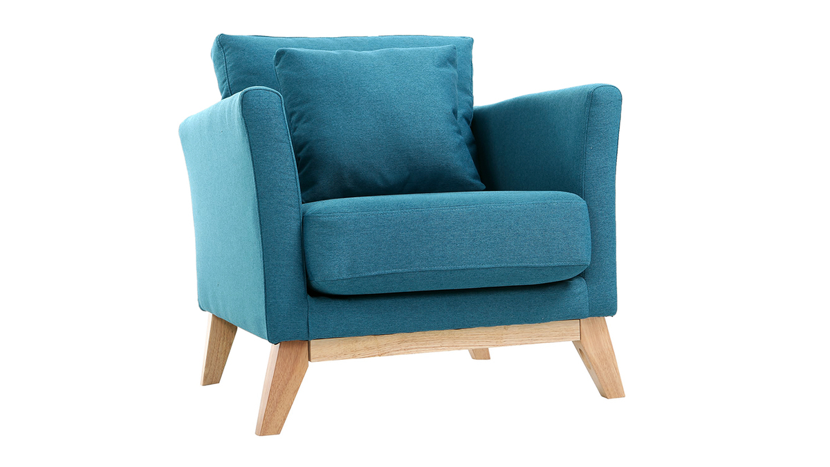 Fauteuil scandinave déhoussable en tissu bleu canard et bois clair OSLO, livré prêt à assembler. Montage simple, seul le piètement est à fixer.
