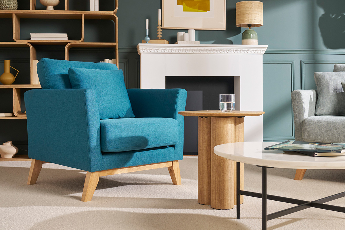 Pour s'aménager un espace fonctionnel dédié à la détente, placez une table d'appoint, un tapis duveteux et un luminaire design aux côtés du fauteuil OSLO.
