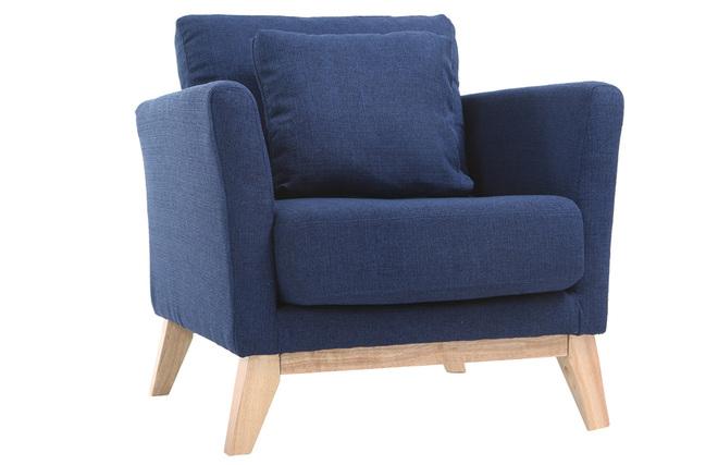 Fauteuil scandinave déhoussable en tissu bleu foncé et bois clair OSLO, livré prêt à assembler. Montage simple, seul le piètement est à fixer.