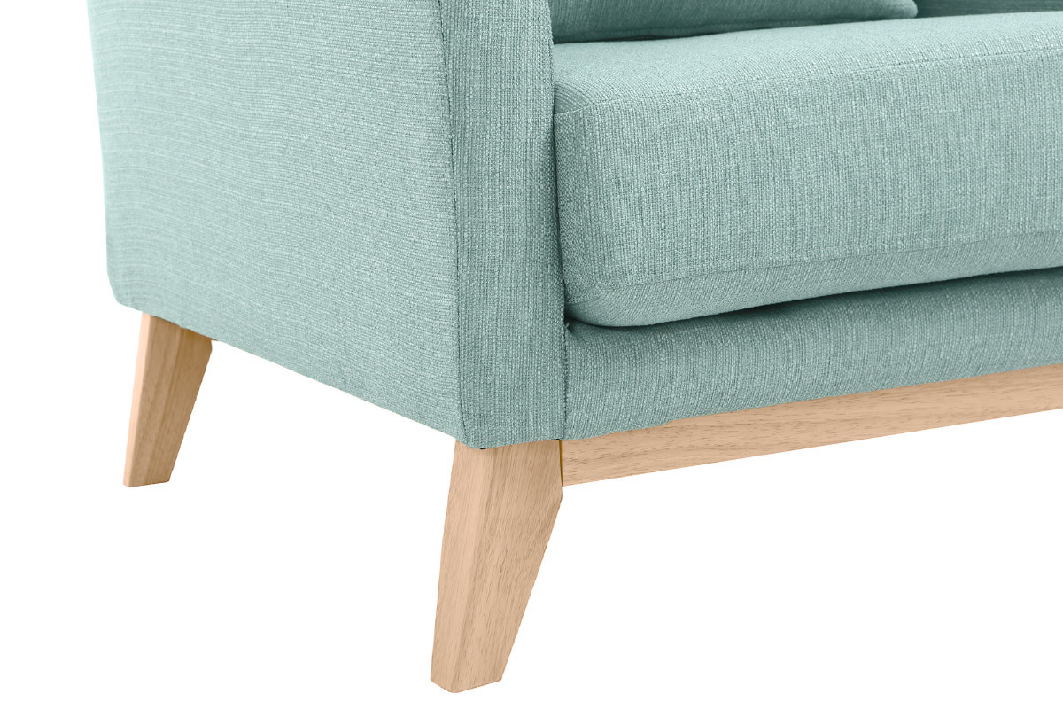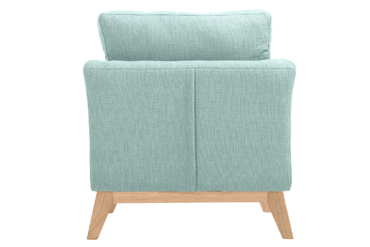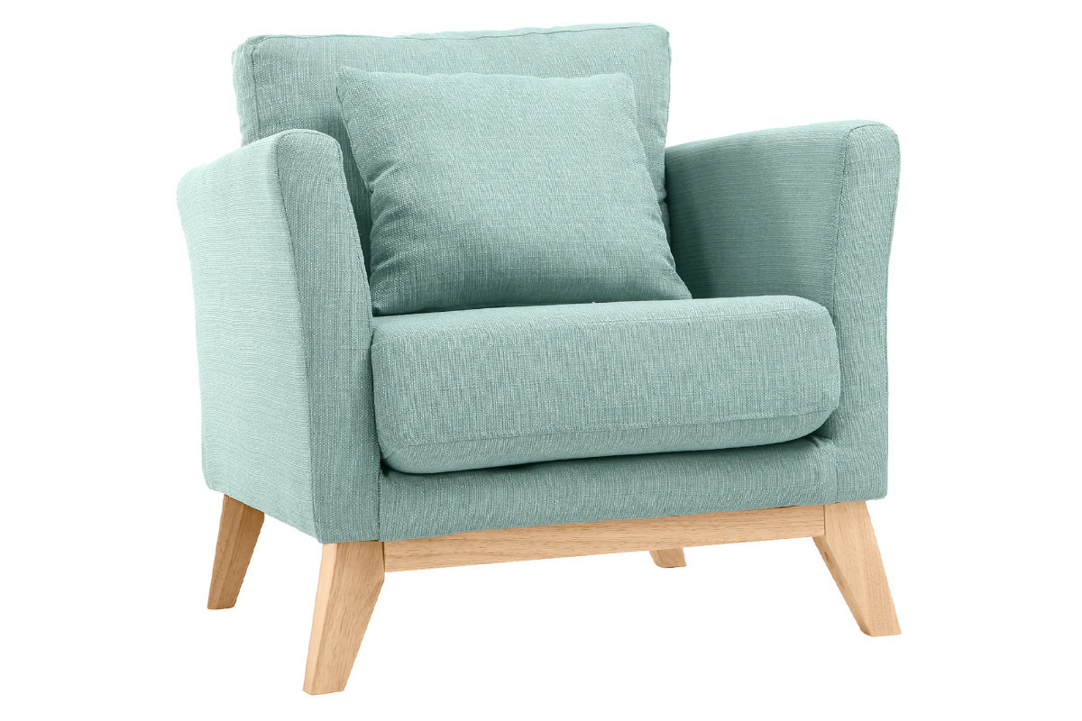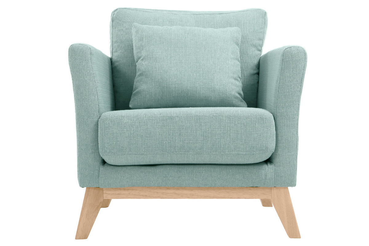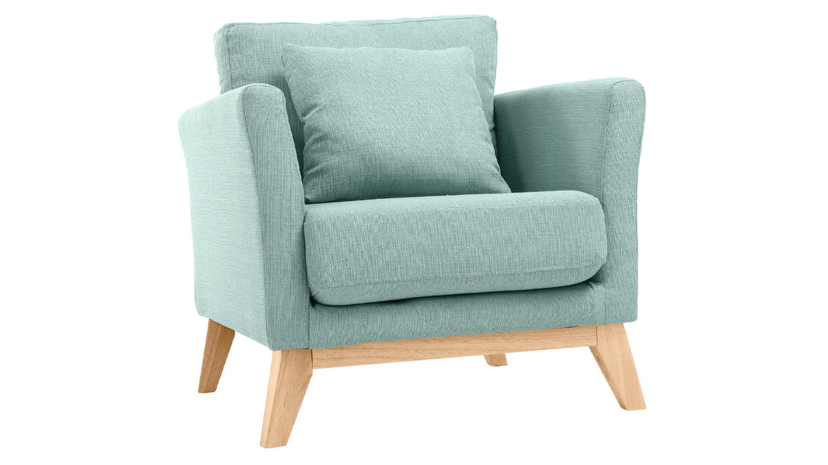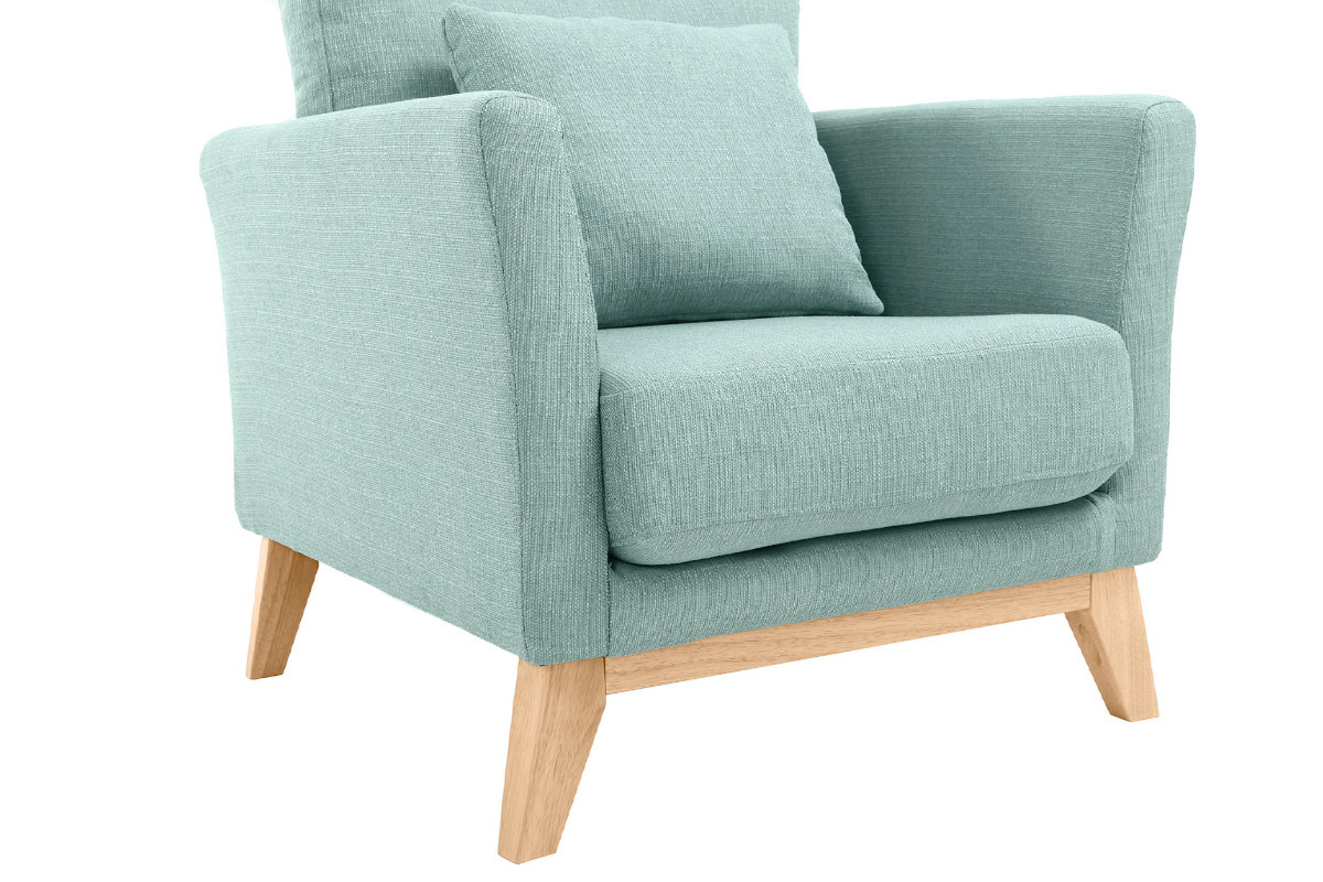 Fauteuil scandinave déhoussable en tissu vert lagon et bois clair OSLO, livré prêt à assembler. Montage simple, seul le piètement est à fixer.