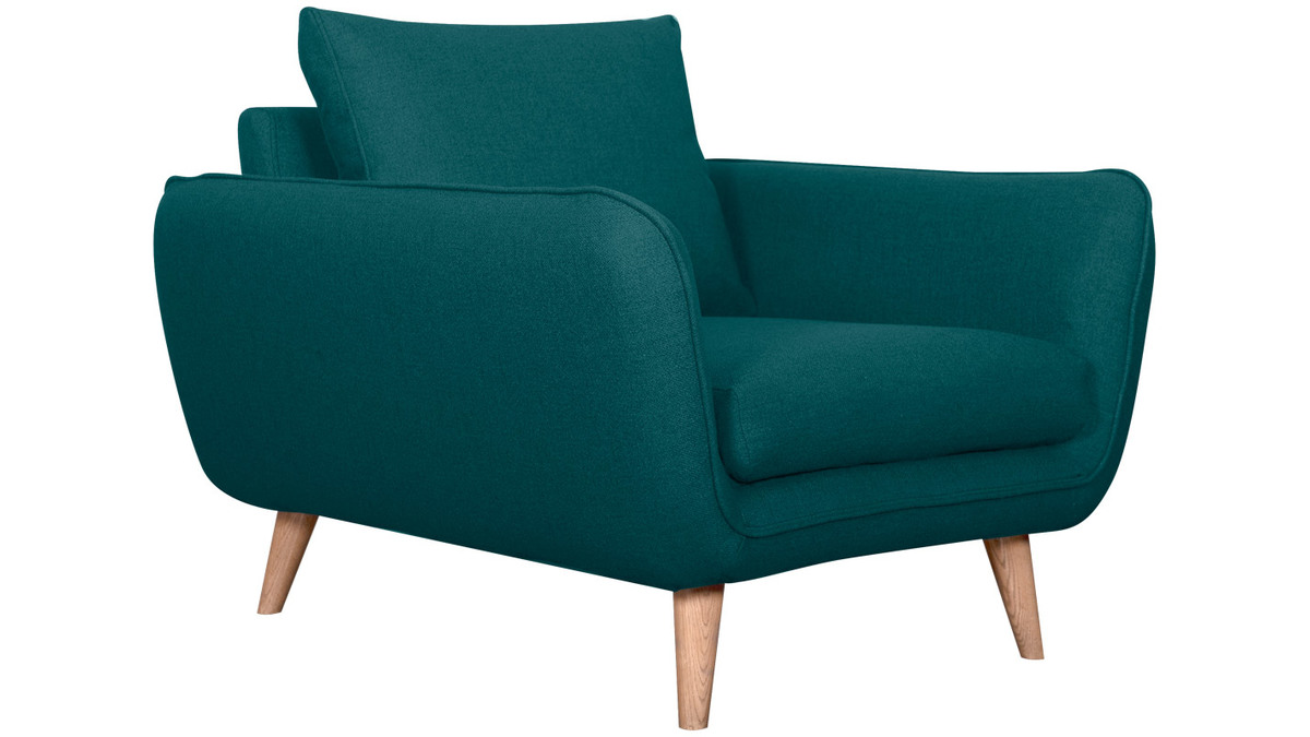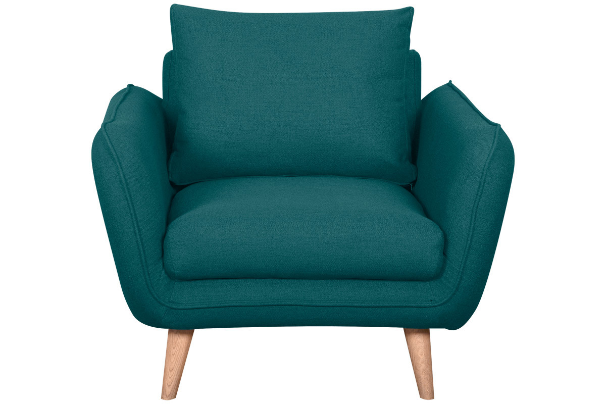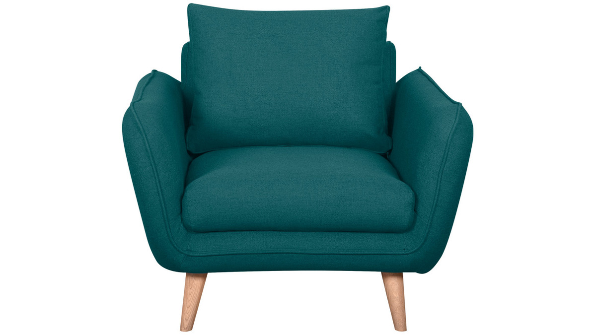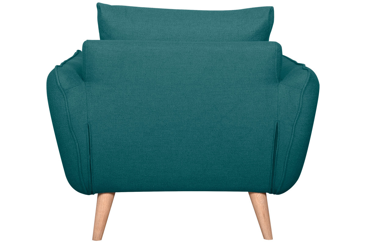 Ce fauteuil 100% made in France se distingue notamment par son assise ample et profonde (L60 x P60 cm). Celle-ci est garnie d'une mousse dense (28 kg/m3) et habillée d'un joli tissu bleu paon (100% polyester) à la fois souple et doux au toucher. Le moelleux de ses coussins et ses larges accoudoirs participent aussi au confort. Ils forment une enveloppe protectrice propice à la relaxation...