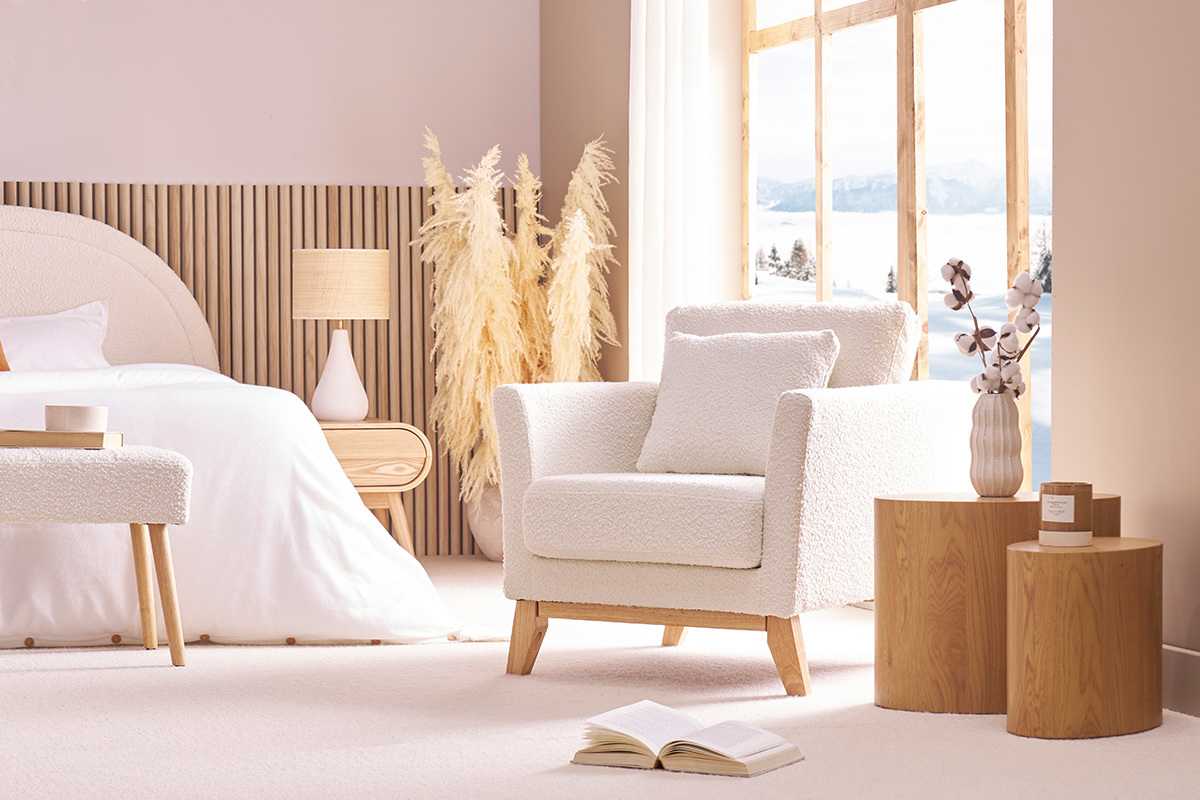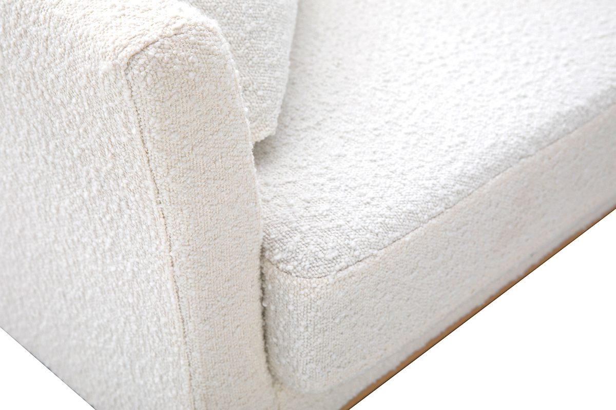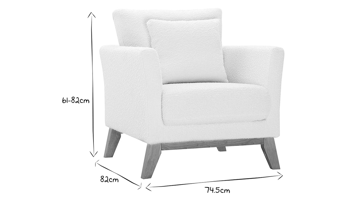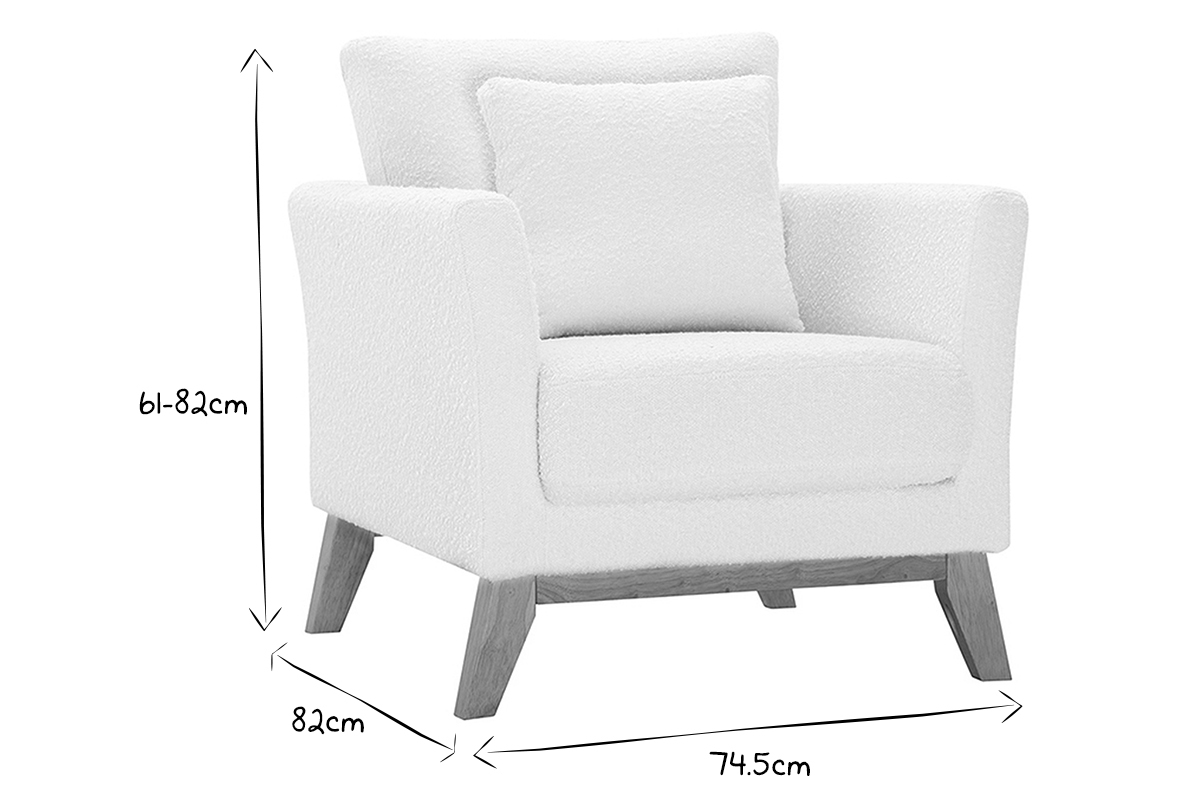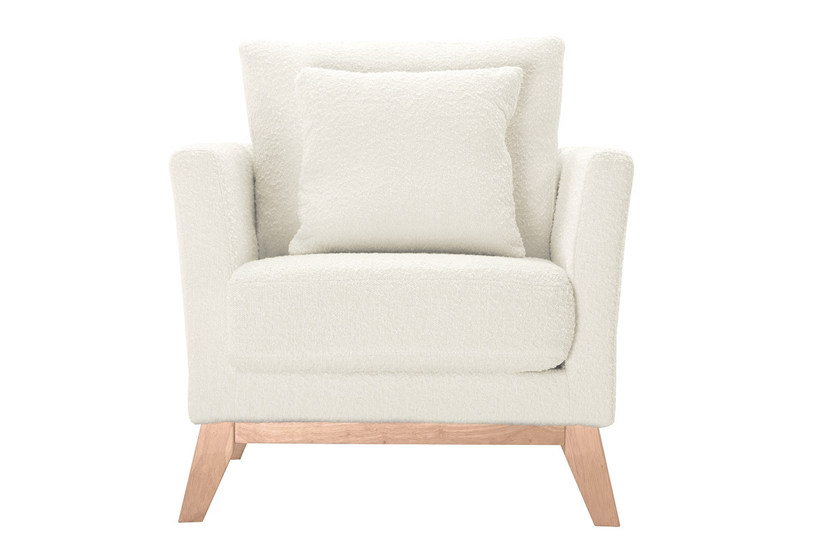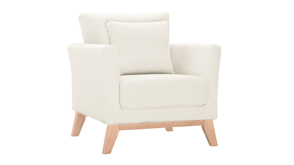 Fauteuil scandinave déhoussable en tissu effet laine bouclée blanc cassé et bois clair OSLO, livré prêt à assembler. Montage simple, seul le piètement est à fixer.