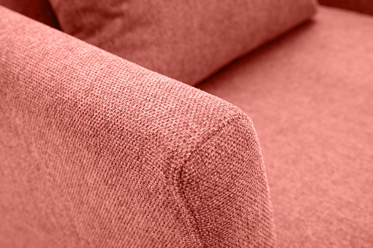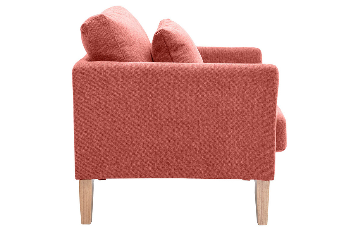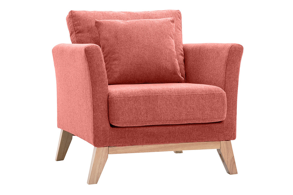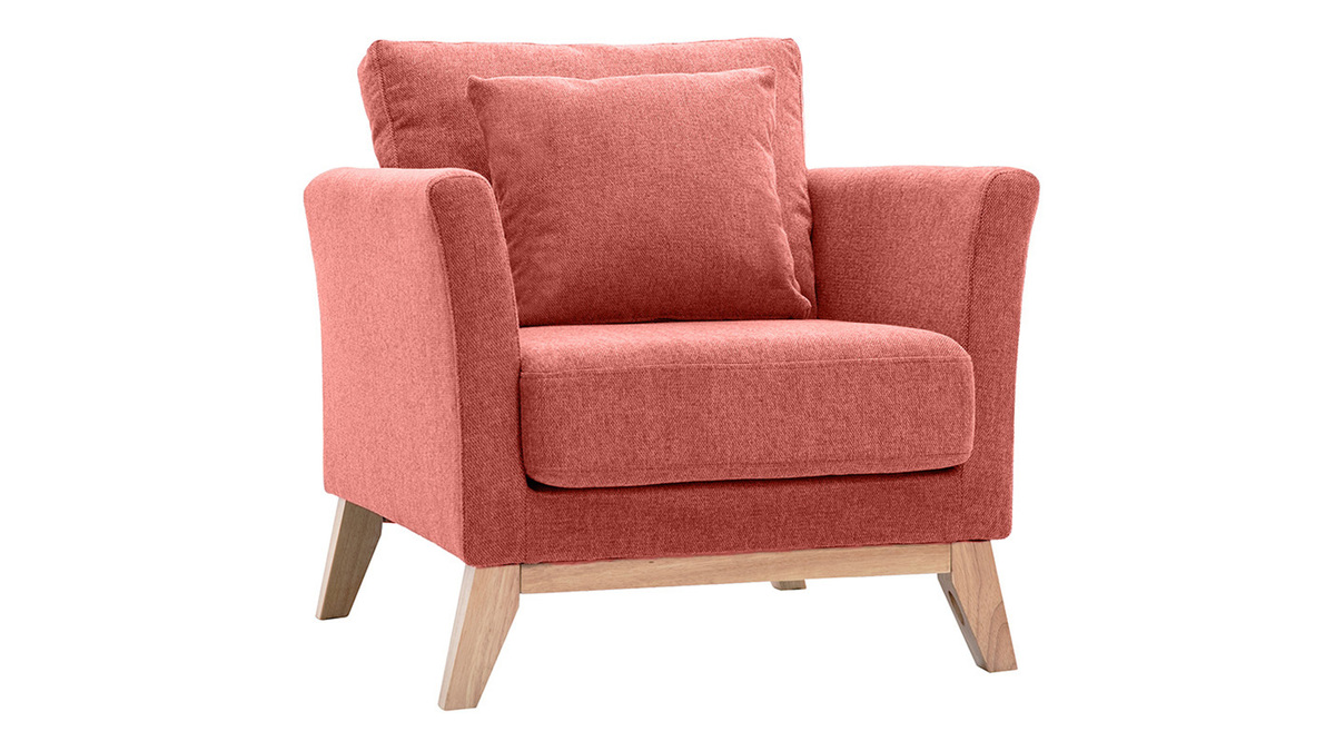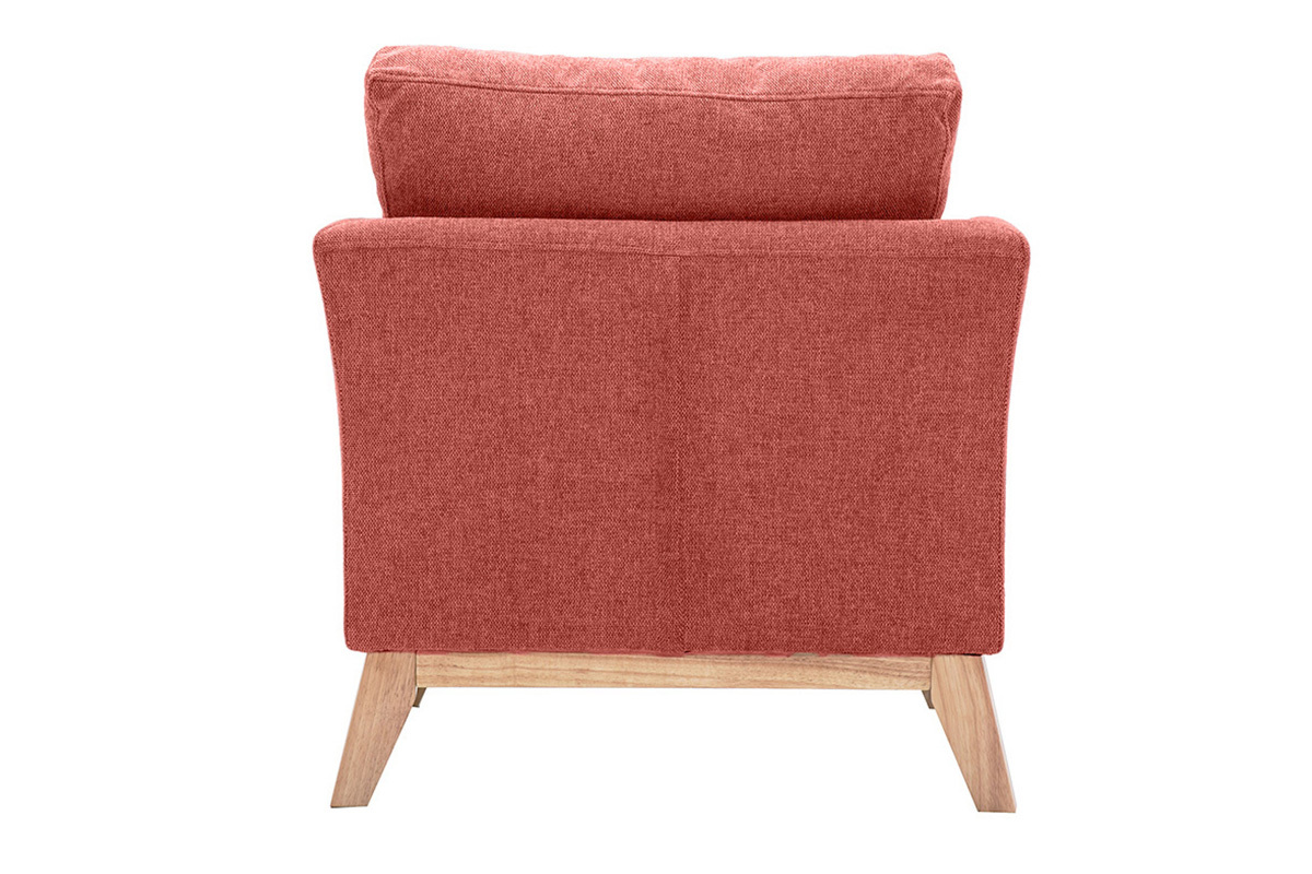 Fauteuil scandinave déhoussable en tissu effet velours texturé terracotta et bois clair OSLO, livré prêt à assembler. Montage simple, seul le piètement est à fixer.