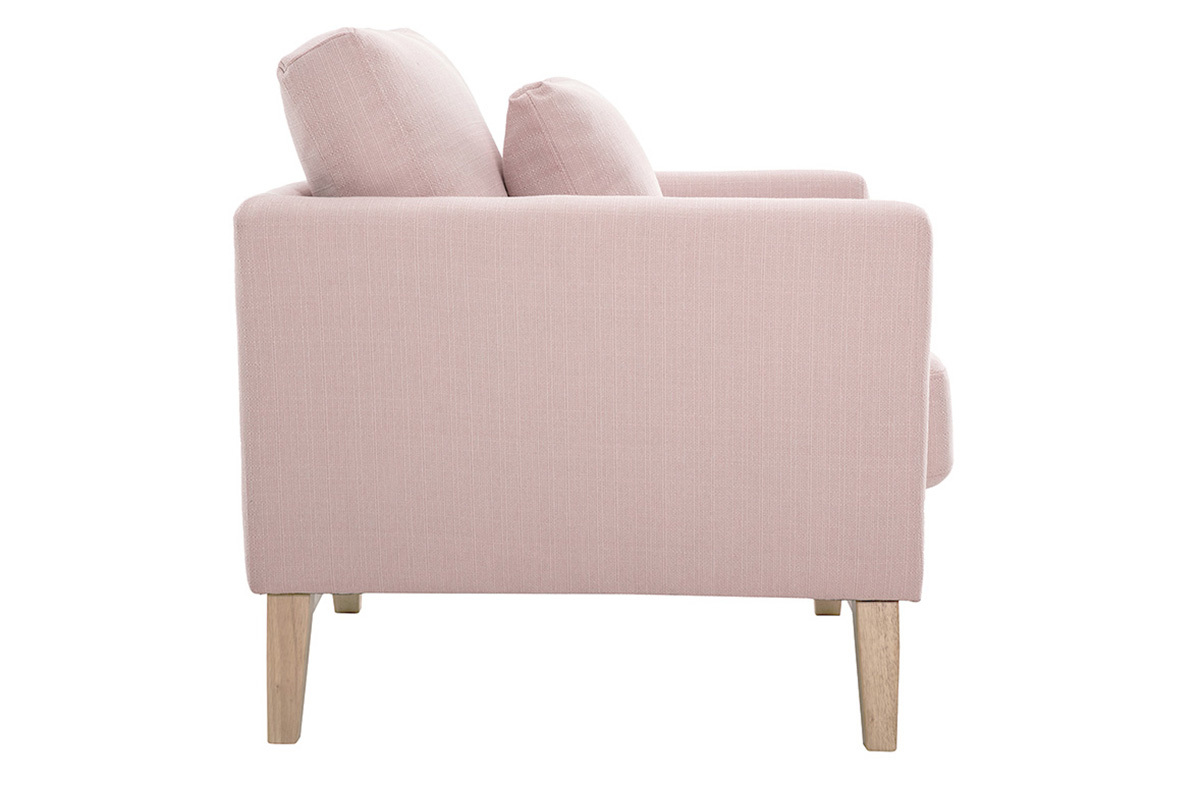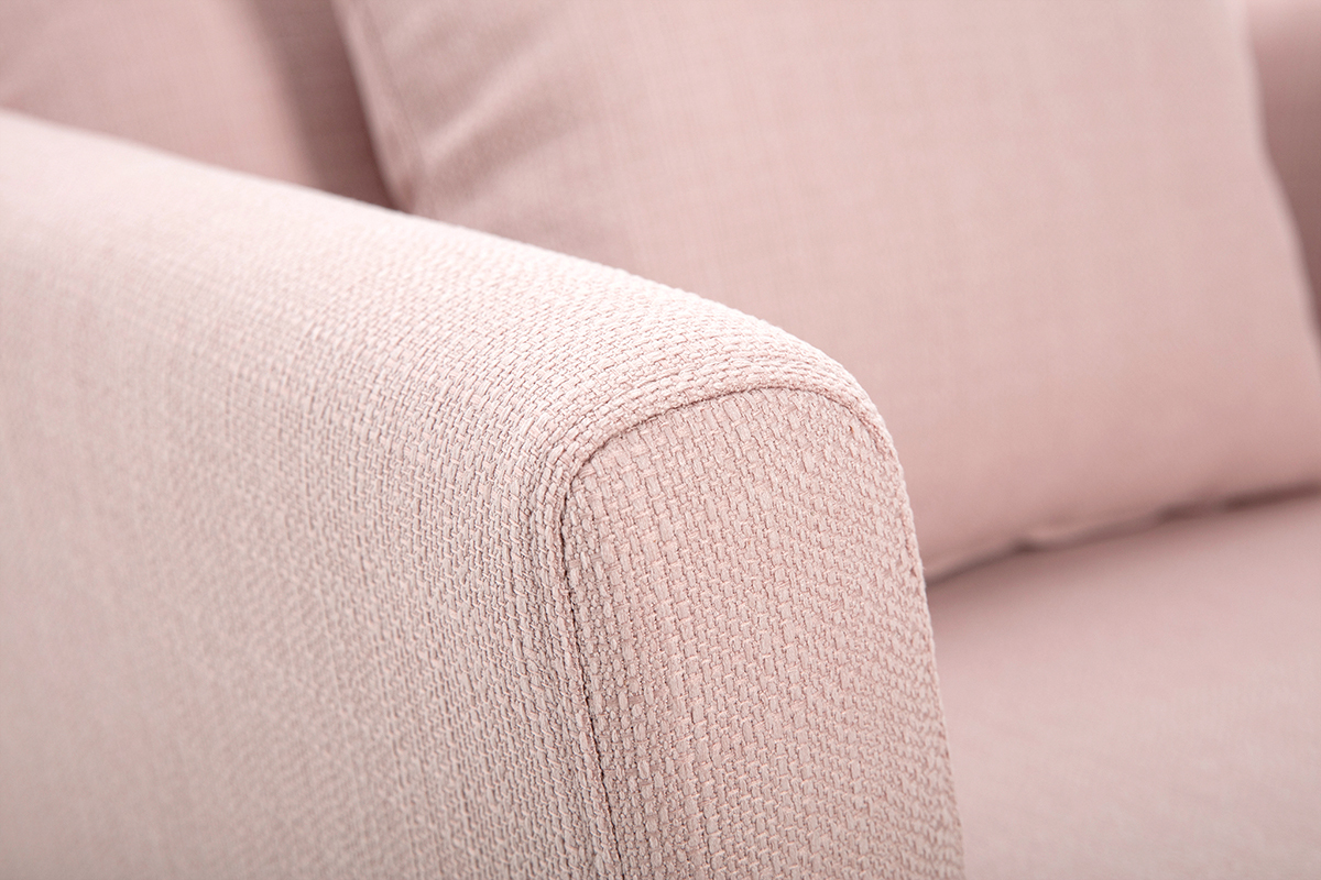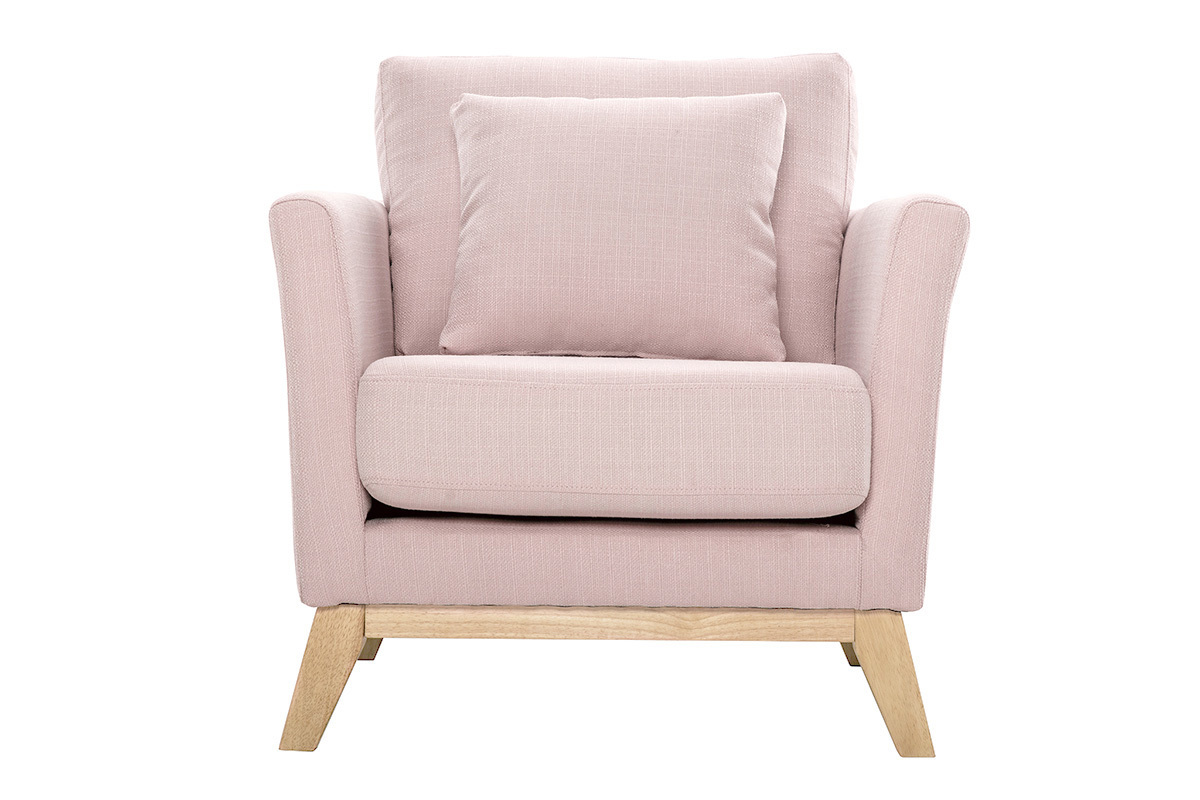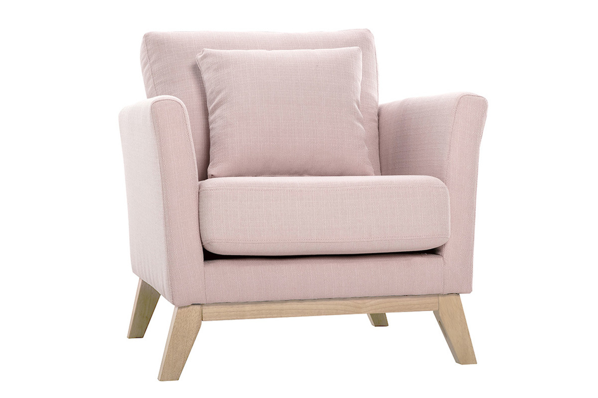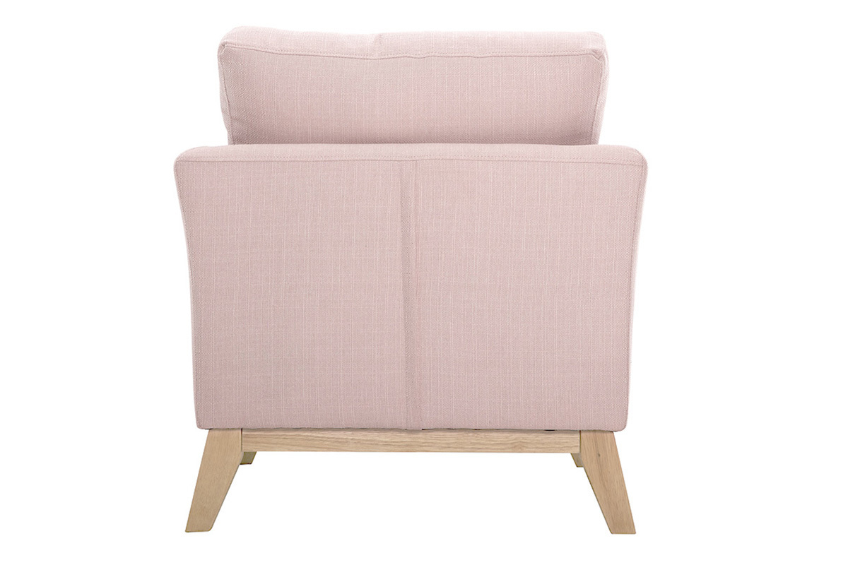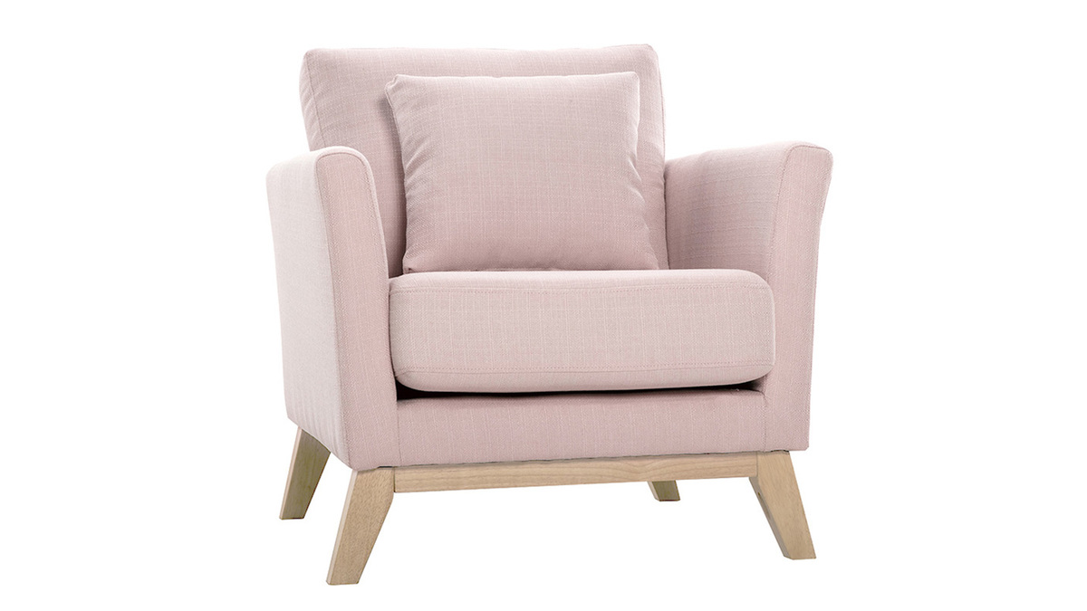 Fauteuil scandinave déhoussable en tissu rose et bois clair OSLO, livré prêt à assembler. Montage simple, seul le piètement est à fixer.