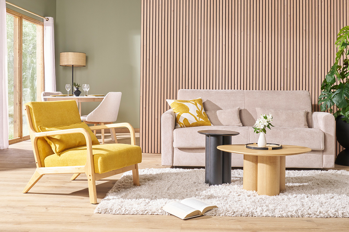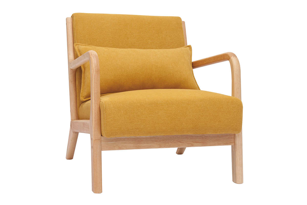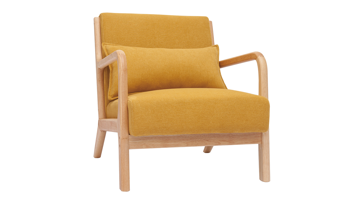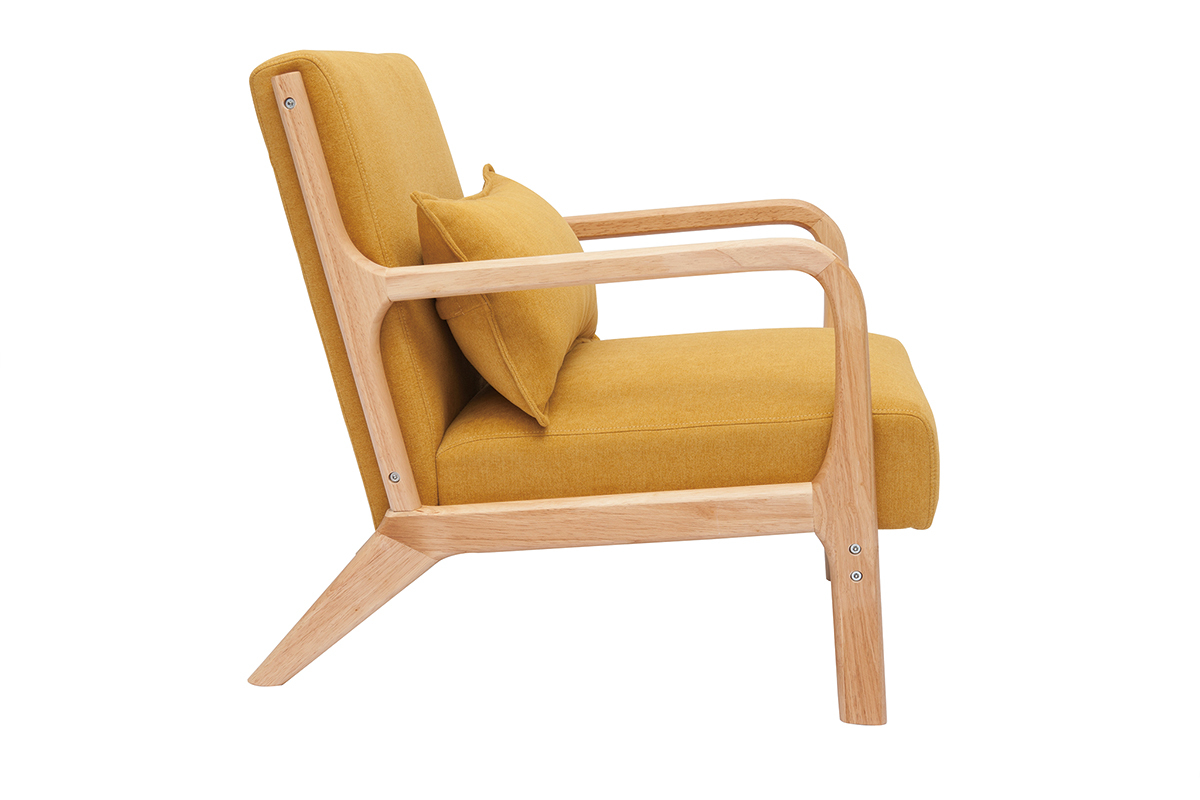 Fauteuil jaune moutarde et bois livré prêt à monter.