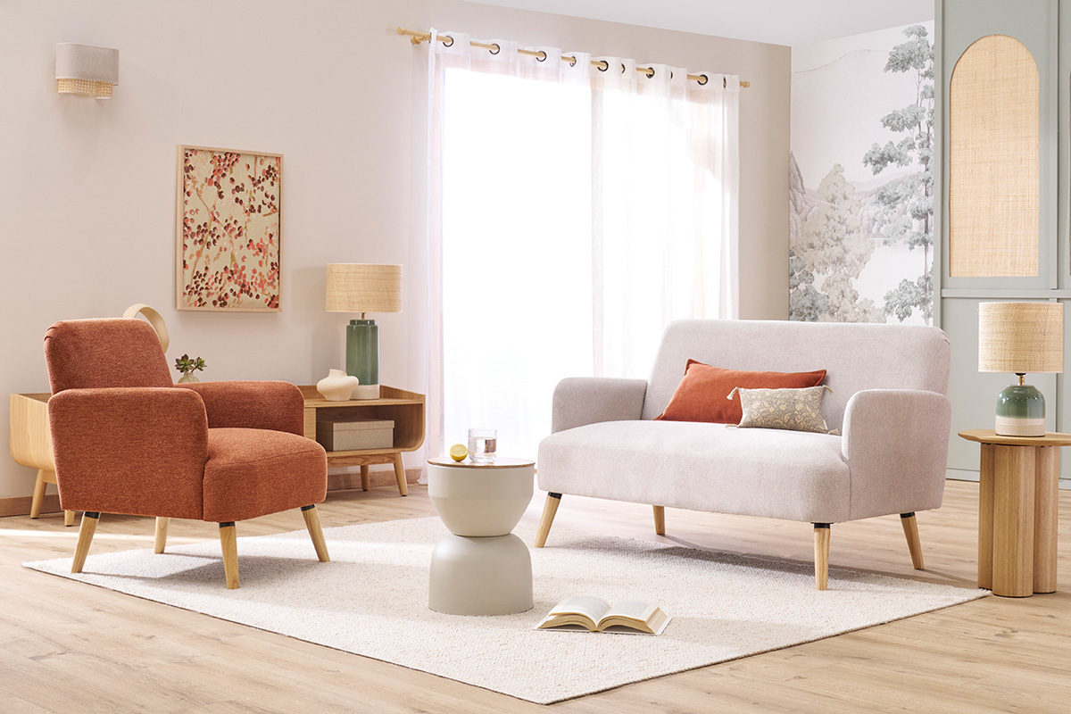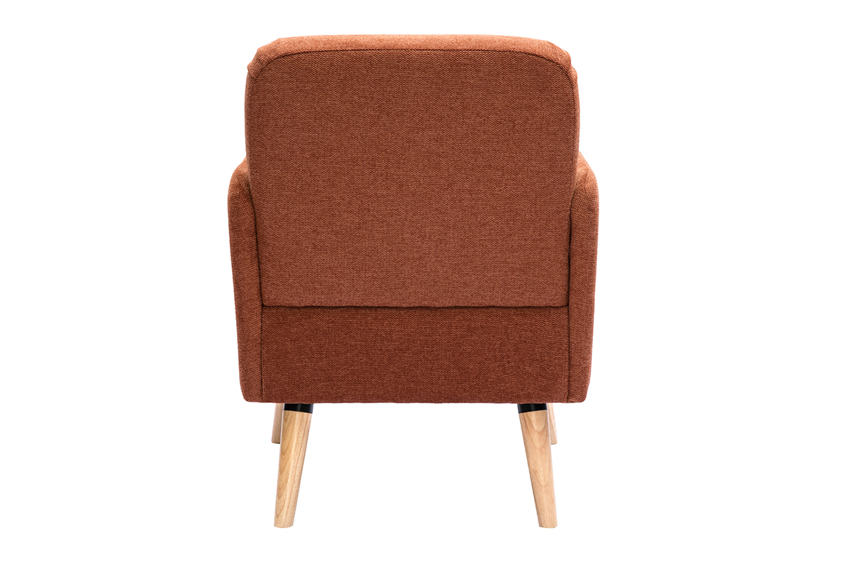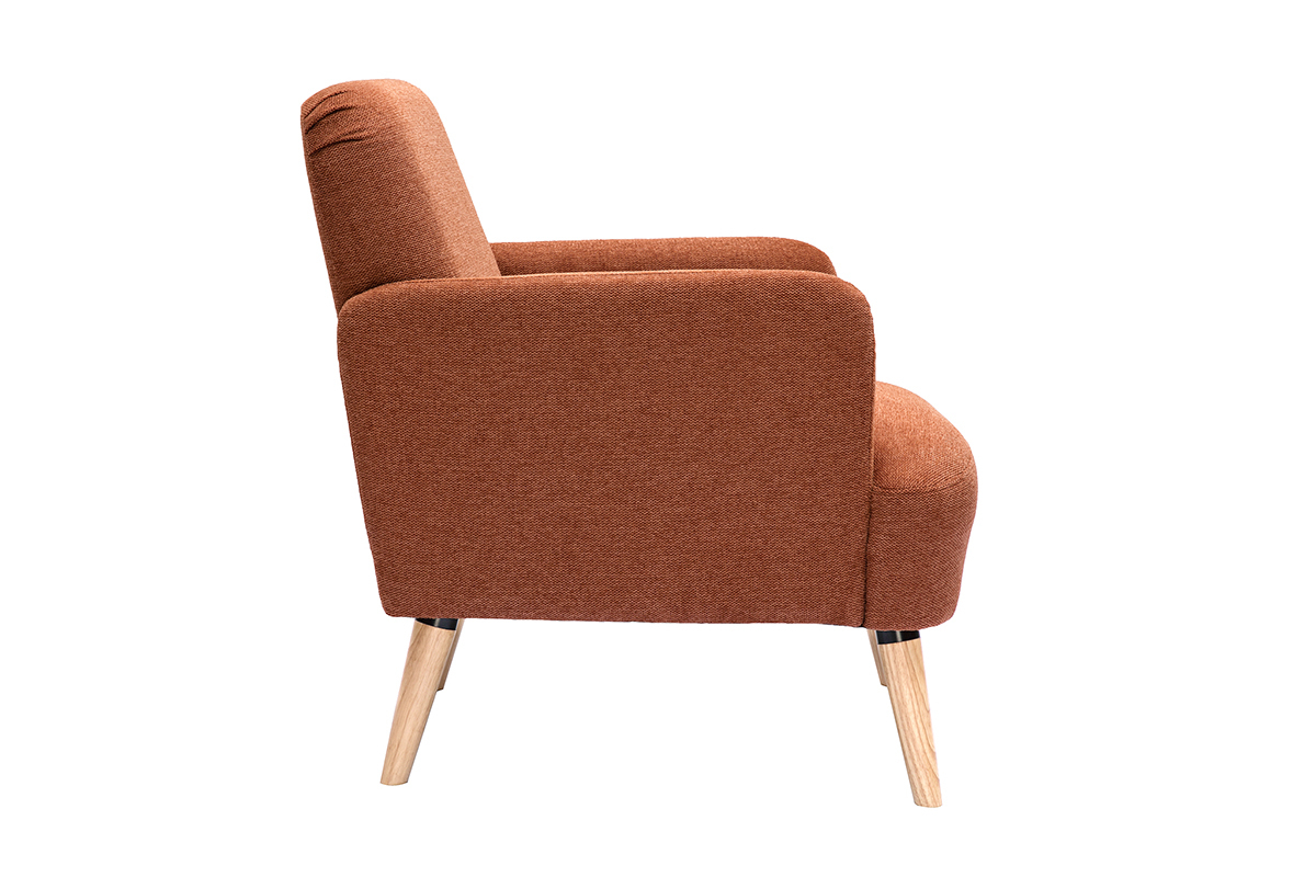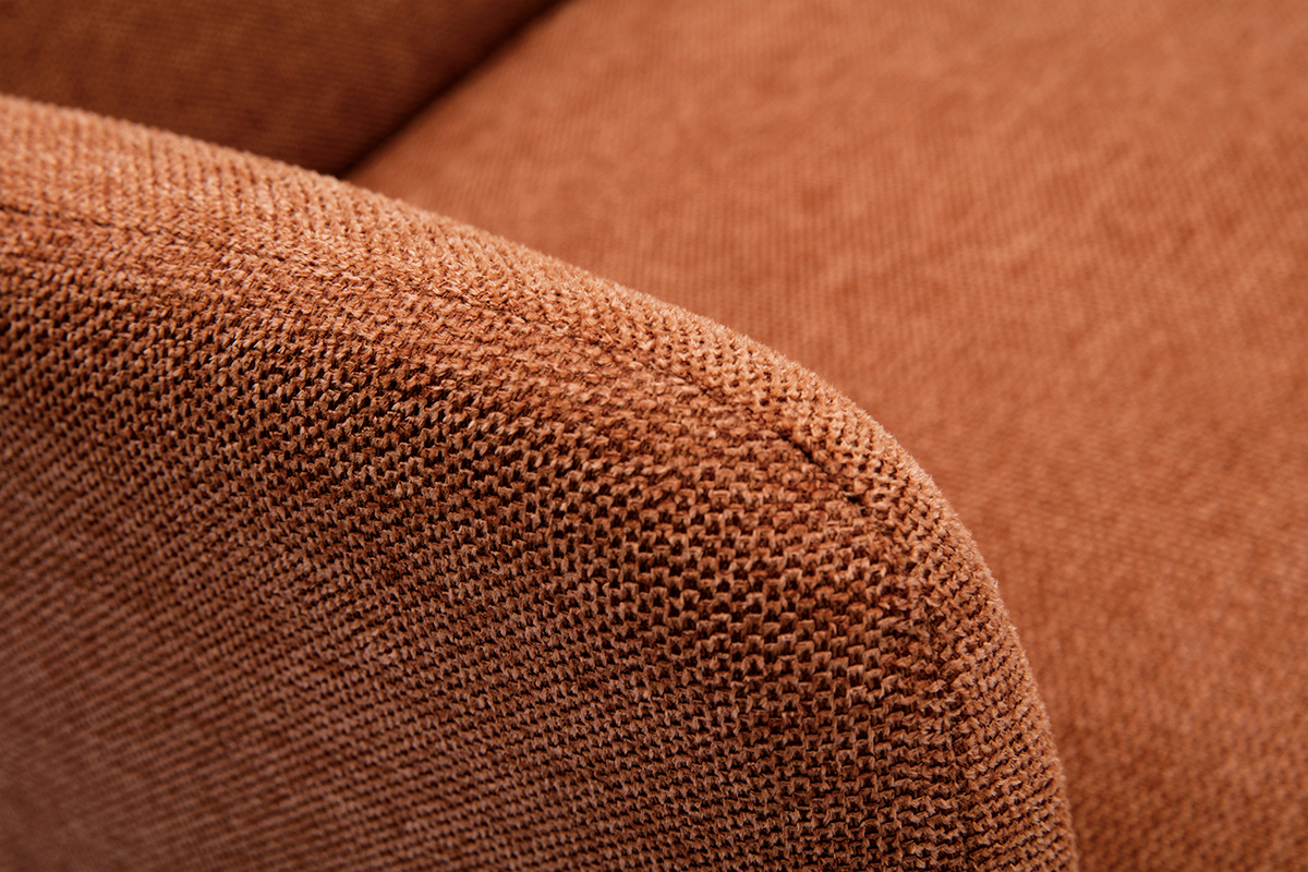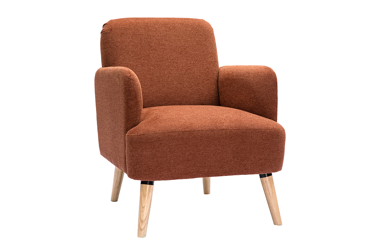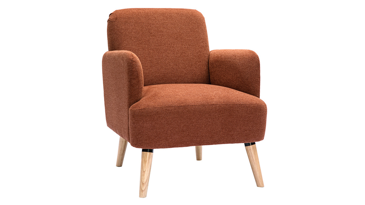 Avec ses lignes arrondies, son design épuré et sa jolie combinaison de matières, ce fauteuil possède tout ce qui fait le charme des meubles scandinaves. Le piètement en hévéa massif et le tissu effet velours texturé terre brûlée de l'assise en font une pièce indémodable et facile à intégrer dans différents styles de séjour.