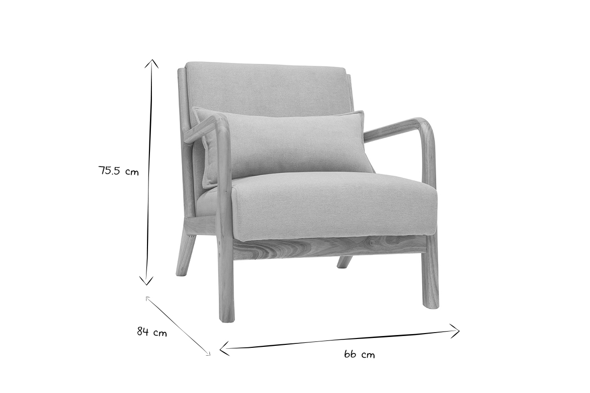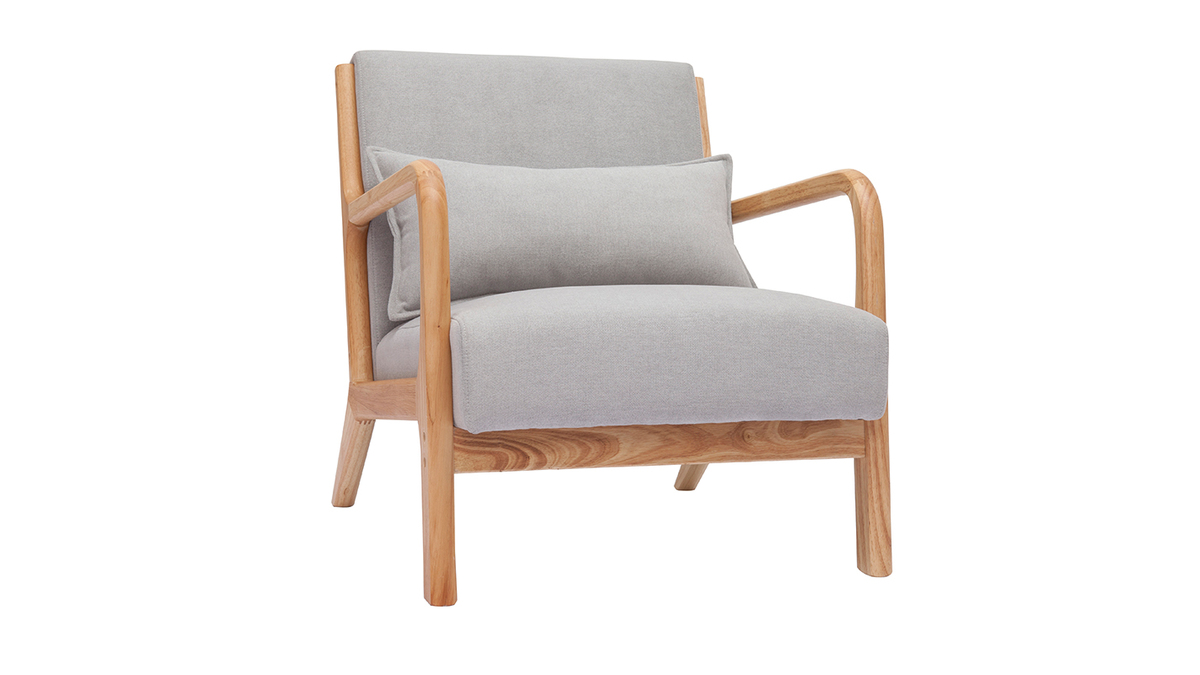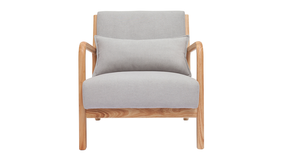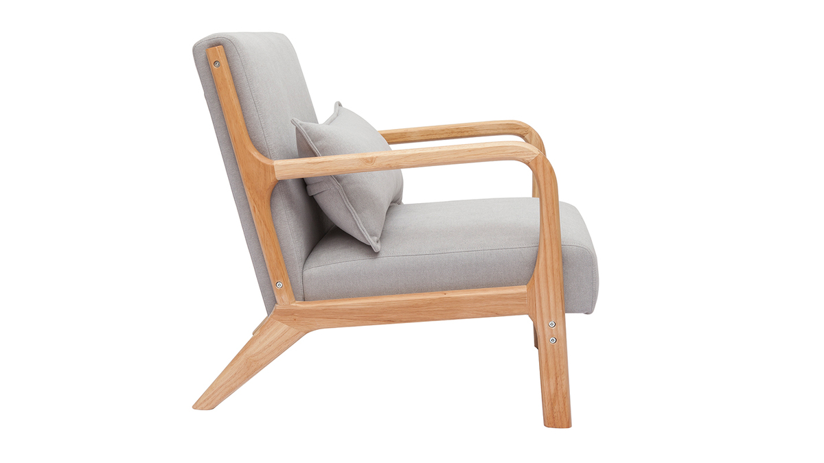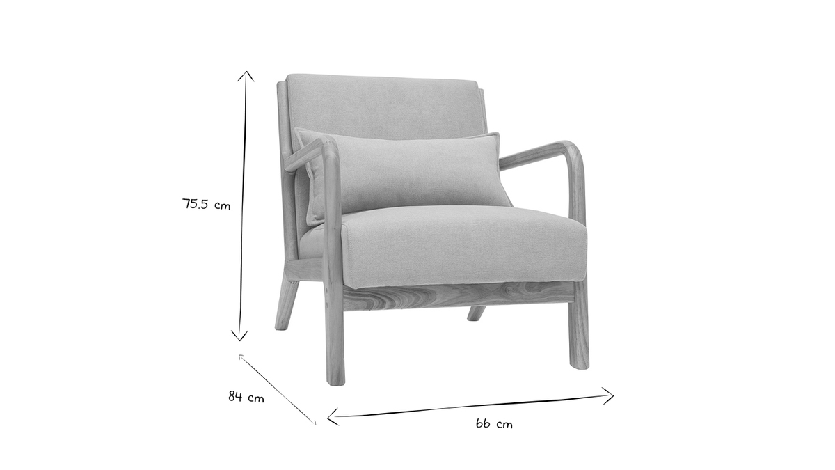 Aux angles polis et aux lignes organiques, la structure à l'inspiration vintage accueille un siège aux volumes épurés habillé d'un tissu effet velours gris clair. Sobre et intemporelle, cette couleur se marie au bois clair avec douceur. Mêlant élégance et simplicité, la silhouette authentique et chaleureuse du fauteuil DERRY trouvera indéniablement sa place dans une chambre ou un salon à la déco scandinave.