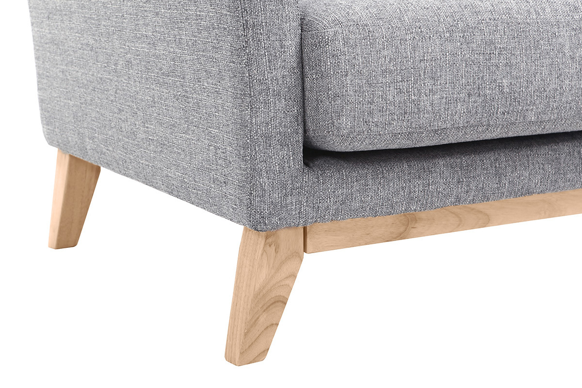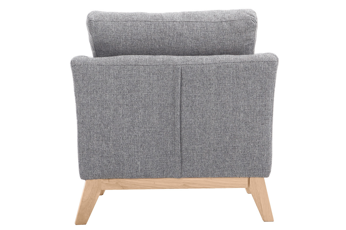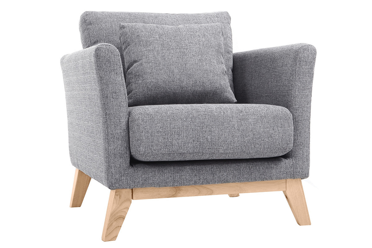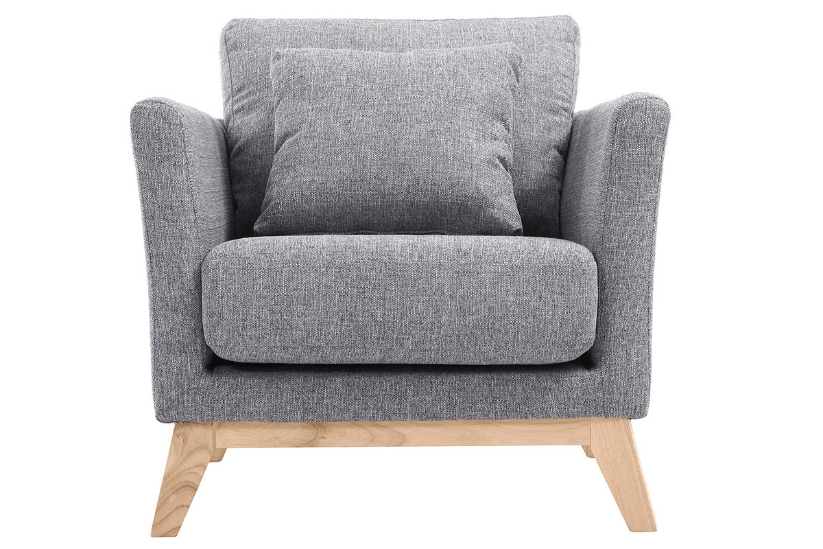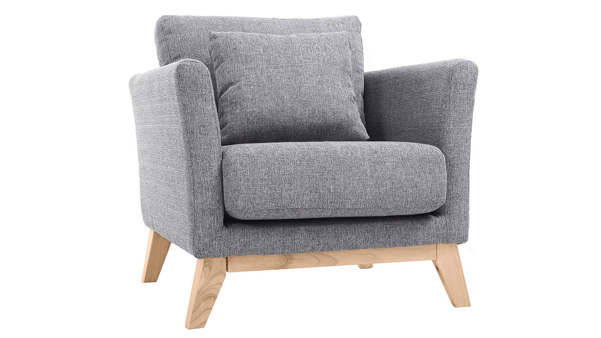 Fauteuil scandinave déhoussable en tissu gris clair et bois clair OSLO, livré prêt à assembler. Montage simple, seul le piètement est à fixer.