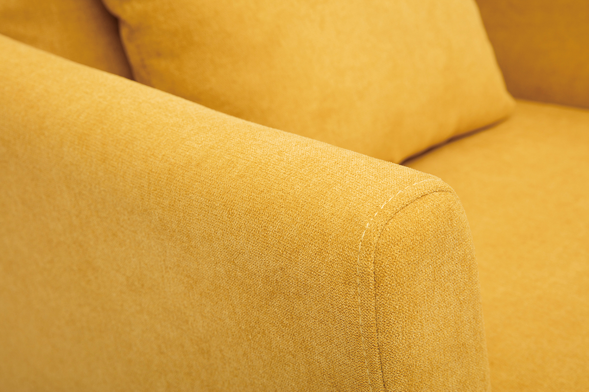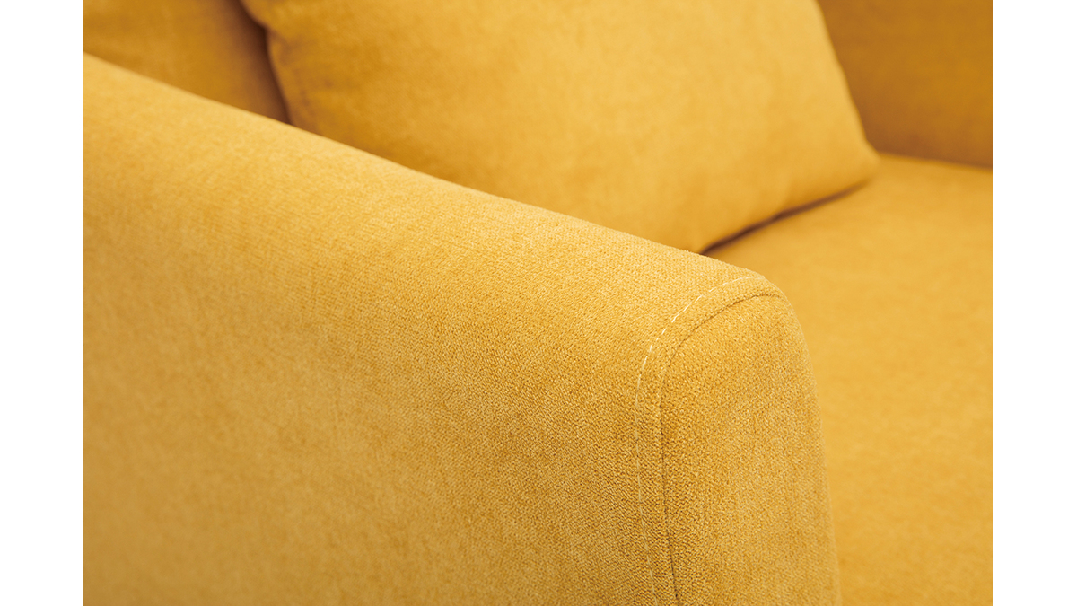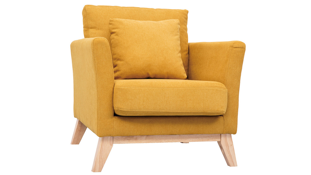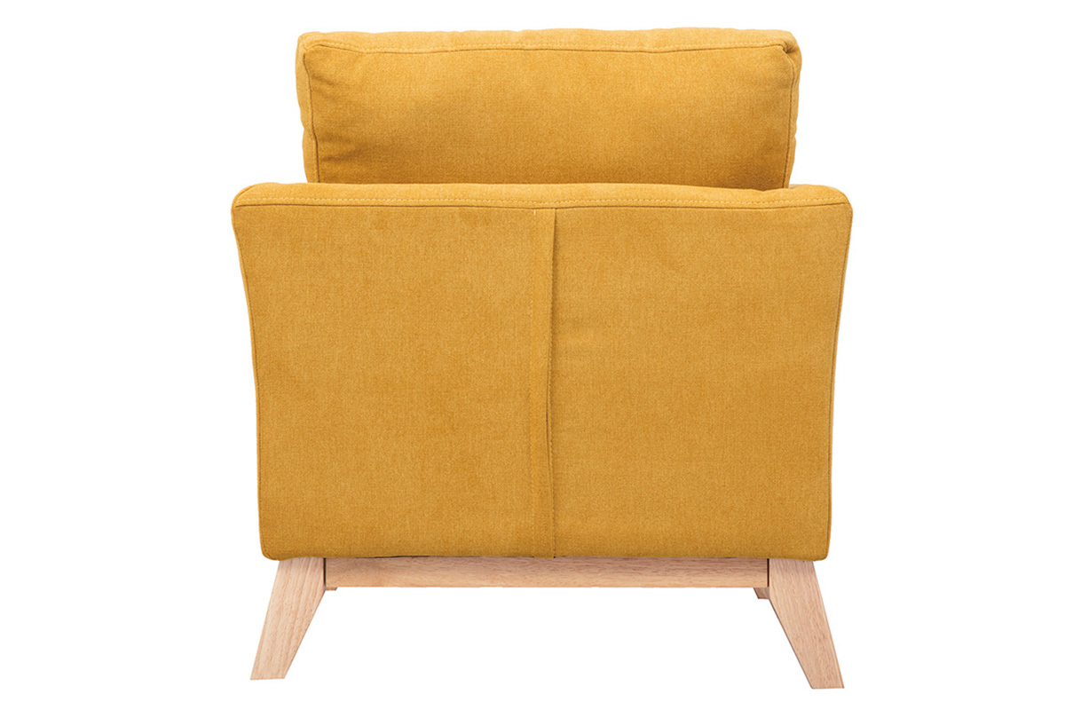Fauteuil scandinave déhoussable en tissu effet velours jaune moutarde et bois clair OSLO, livré prêt à assembler. Montage simple, seul le piètement est à fixer.