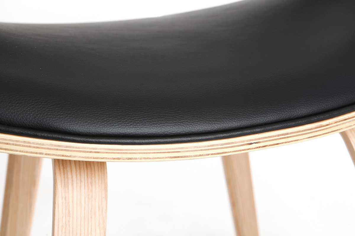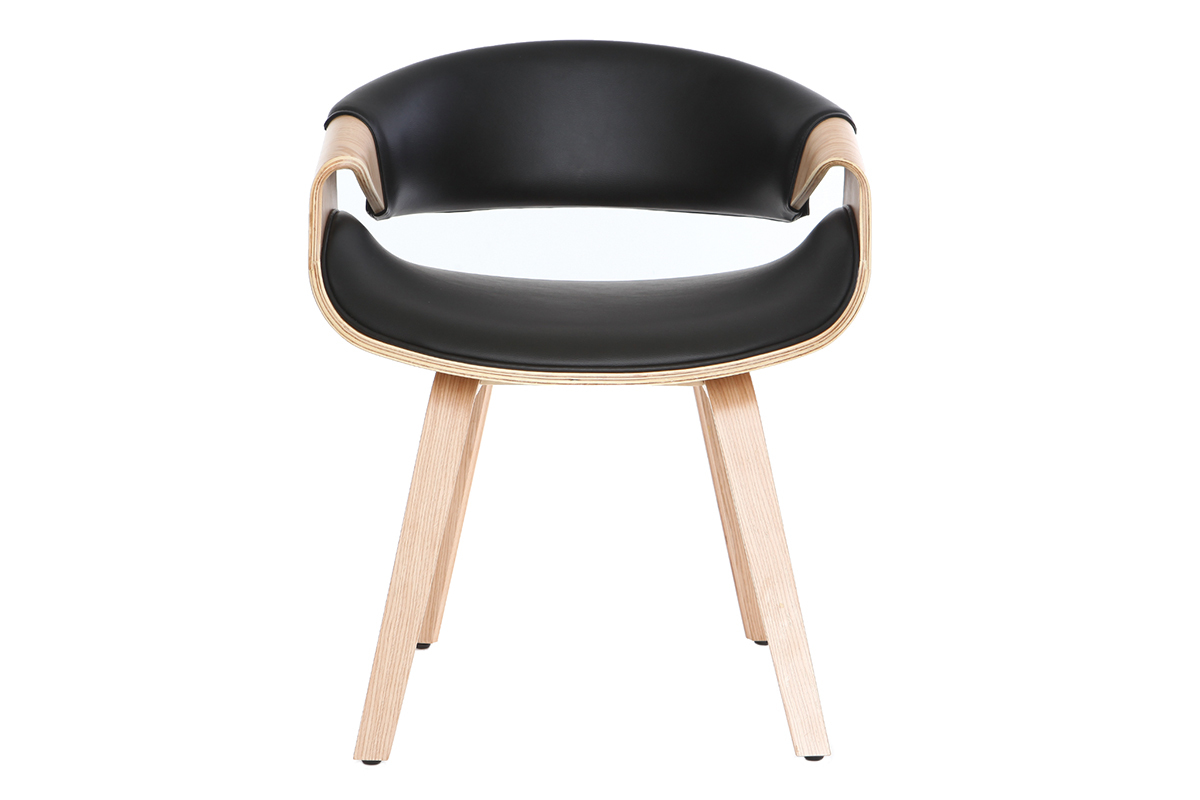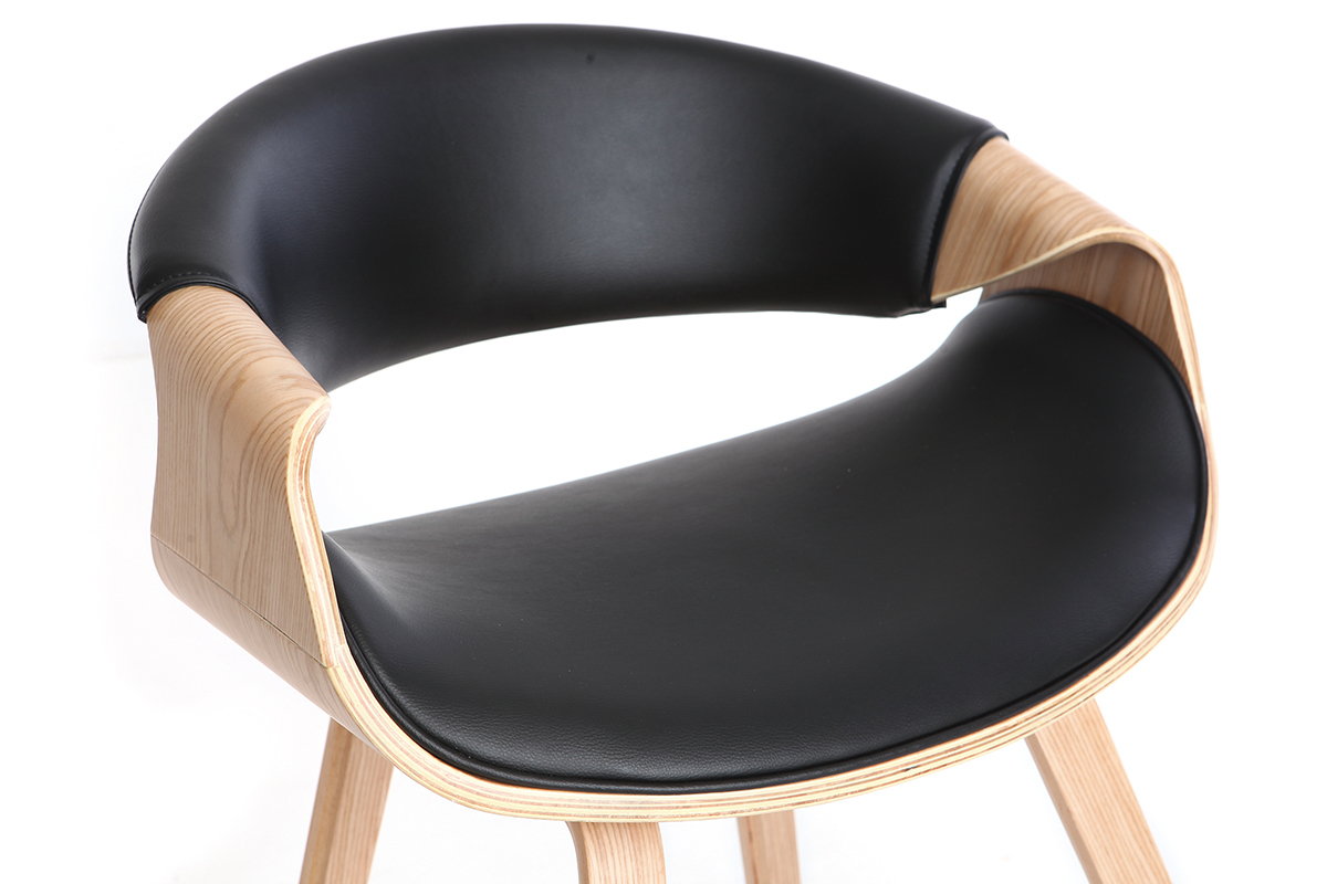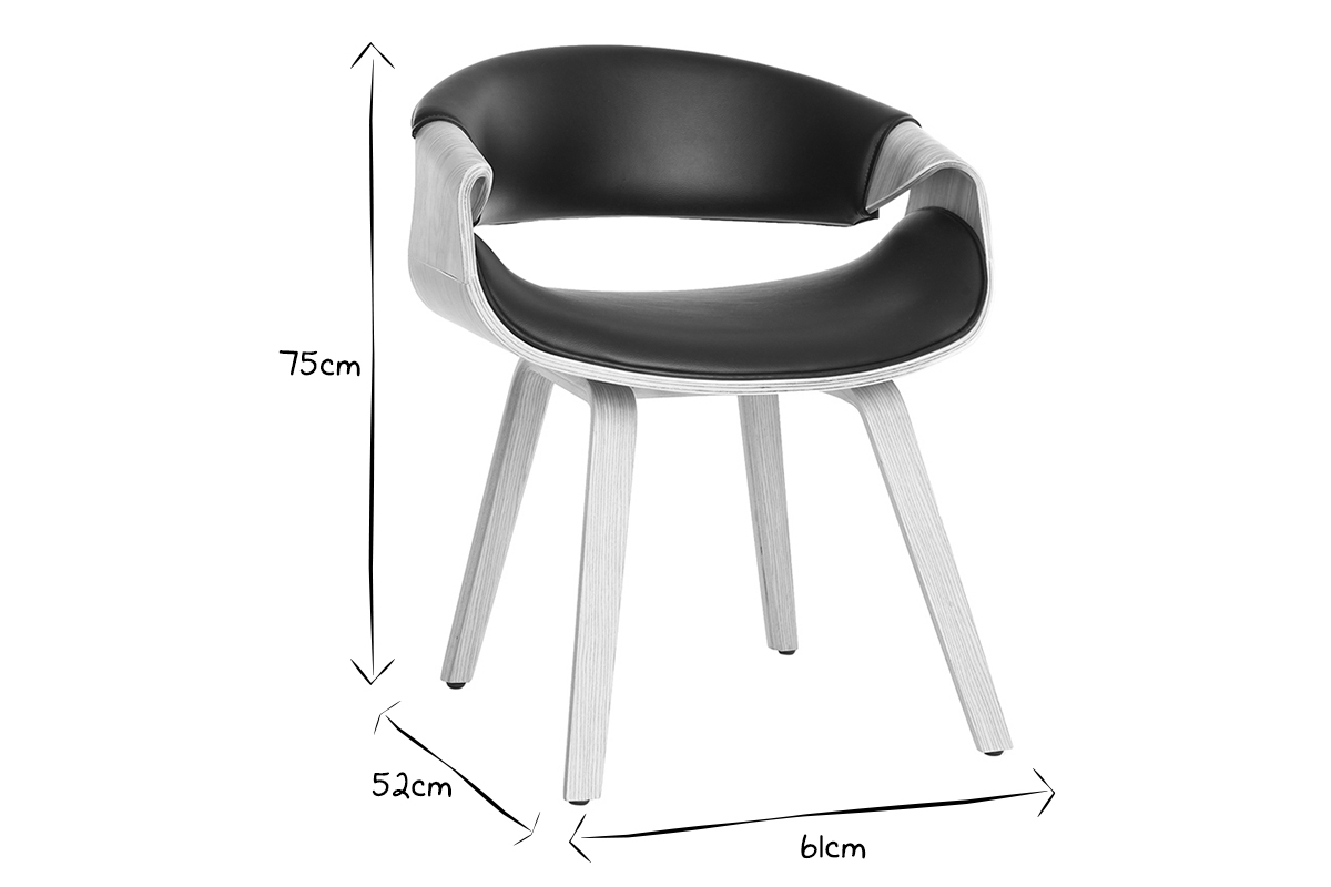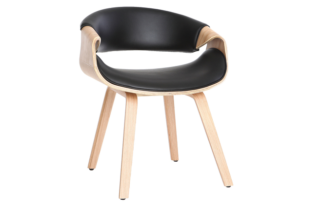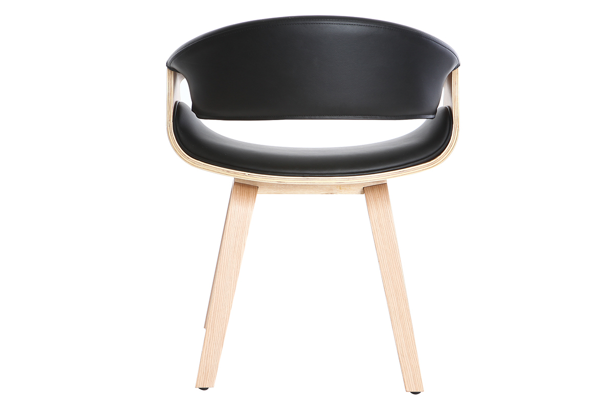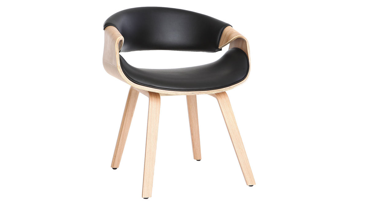 Une chaise avec accoudoirs, au faux-airs de fauteuil moderne et cosy ! Assise et dossier sont rembourrés et recouverts de polyuréthane noir, une finition facile à entretenir, qui apporte une touche chic à l'ensemble. Le piètement plaqué bois clair, épais et robuste est quant à lui un véritable gage de robustesse et de stabilité.