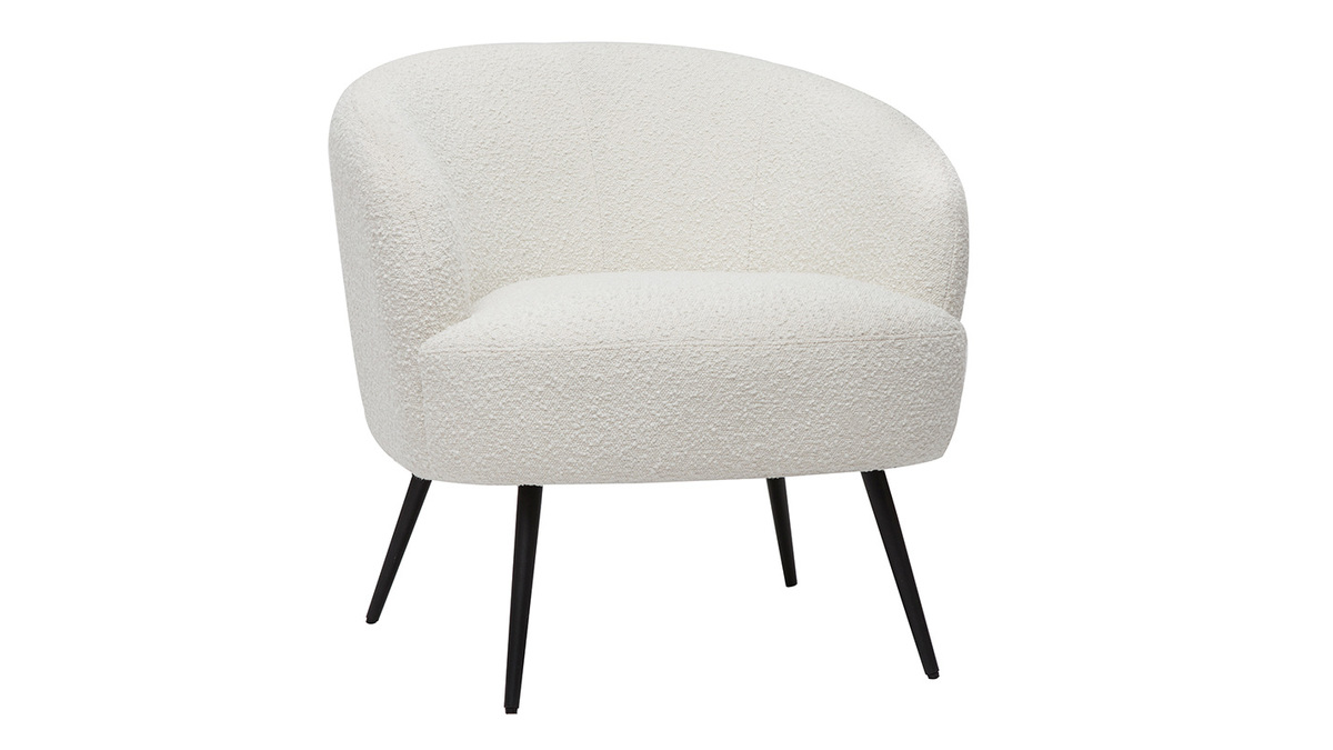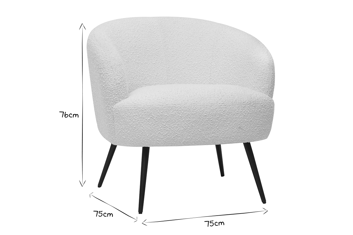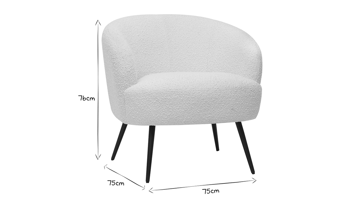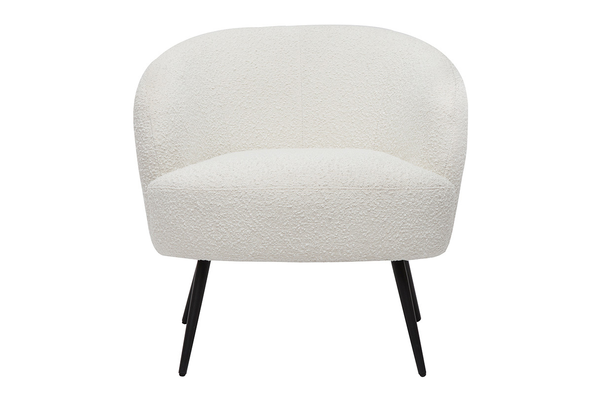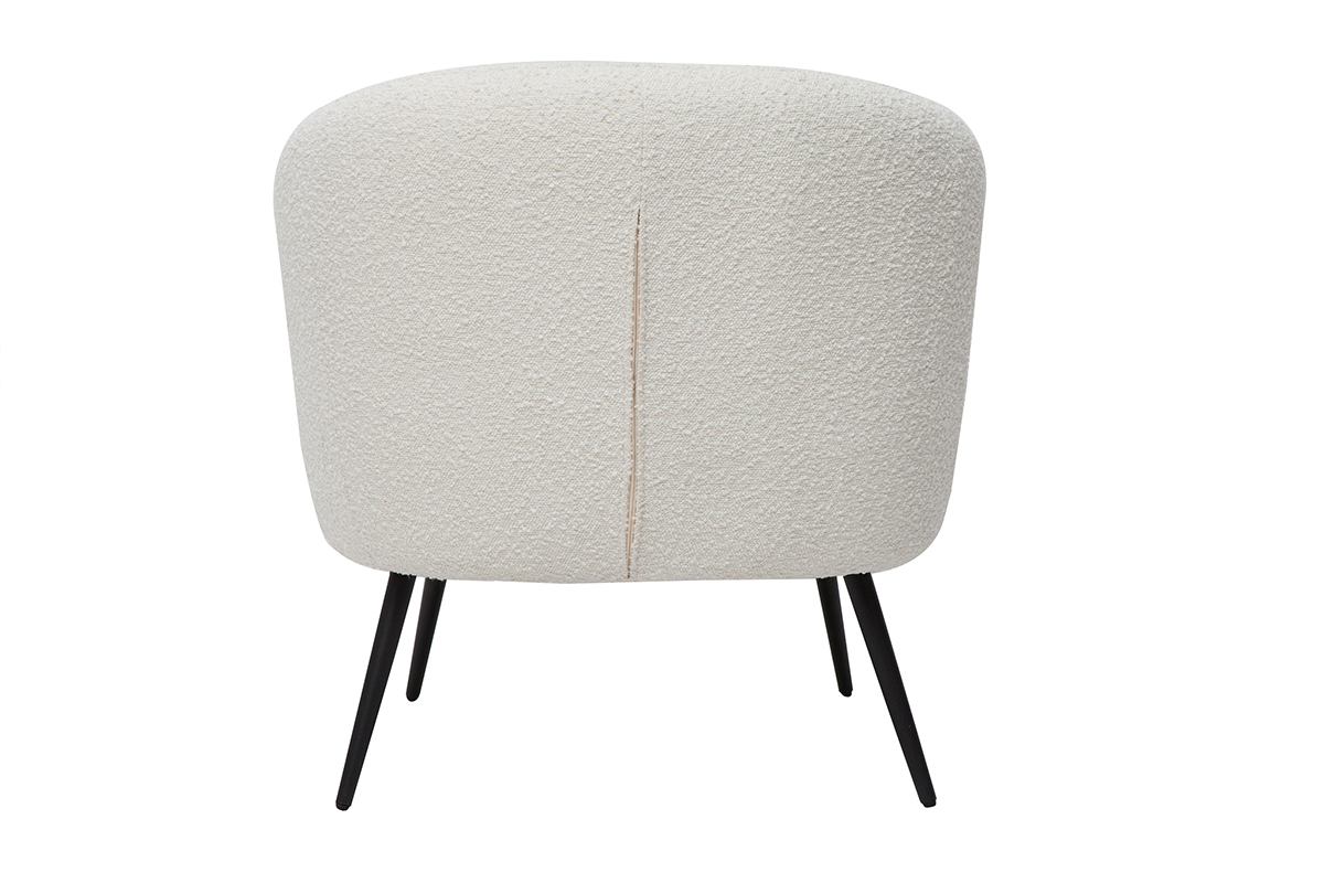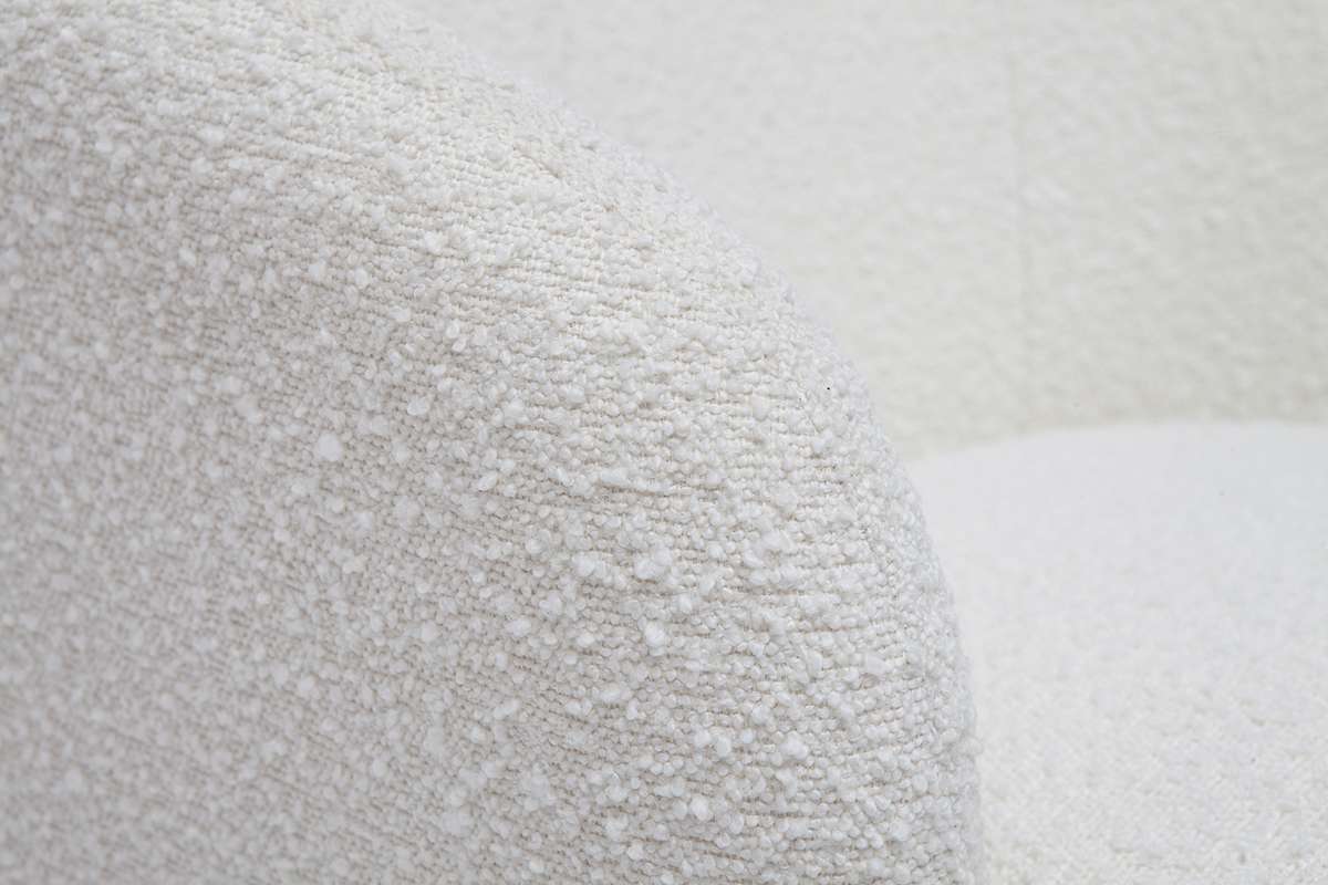 Ce fauteuil design blanc cassé est recouvert d'un superbe tissu effet laine bouclée (100% polyester) à la texture duveteuse et réconfortante. Sa généreuse assise (épaisseur 21 cm) combine des ressorts et 2 épaisseurs de mousse pour toujours plus de confort (densités 25 kg/m3 et 24 kg/m3).