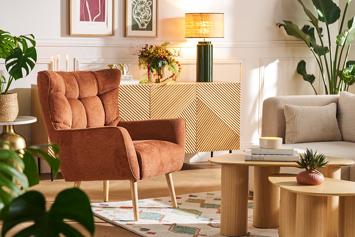 On dispose ce fauteuil confortable dans le séjour aux côtés d'un canapé scandinave pour s'aménager un intérieur cosy.