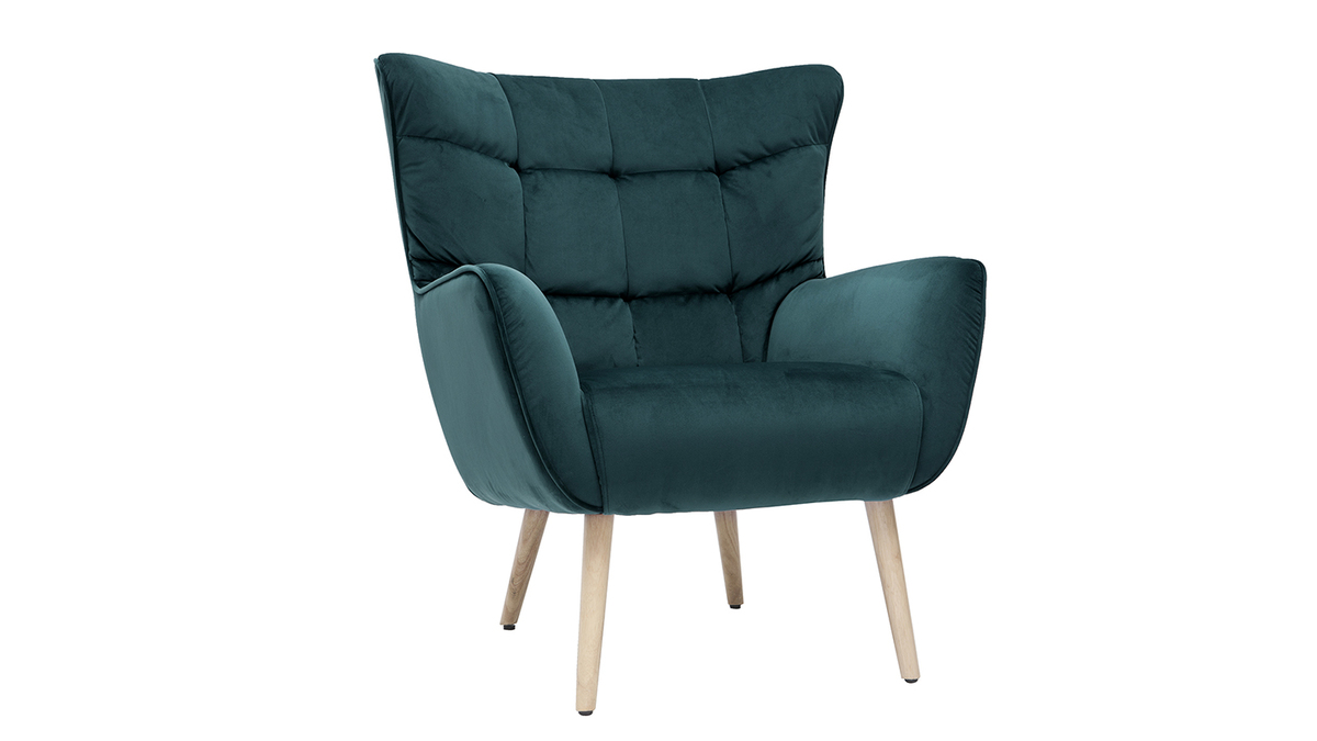 On dispose ce fauteuil bleu pétrole dans le séjour aux côtés d'un canapé scandinave pour s'aménager un intérieur cosy.