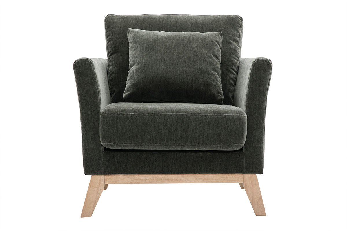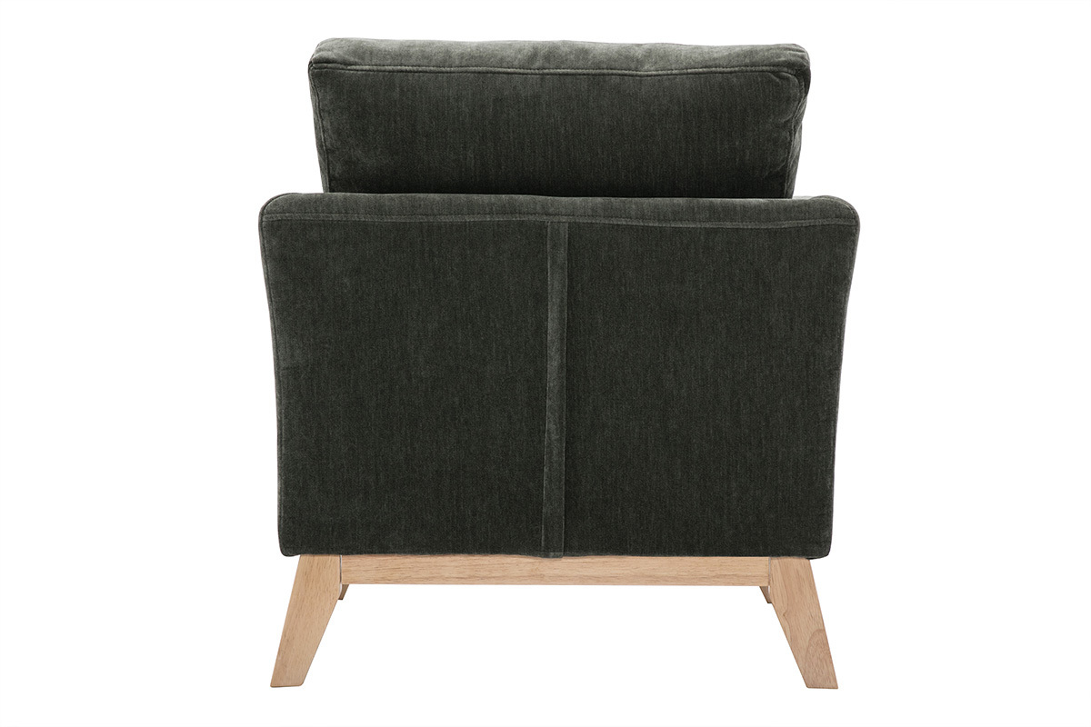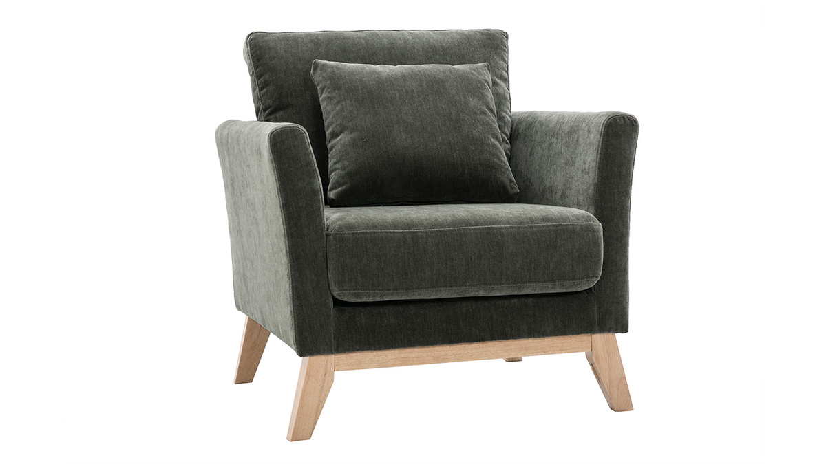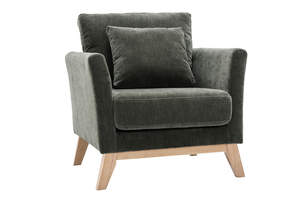 Fauteuil scandinave déhoussable en tissu effet velours vert kaki et bois clair OSLO, livré prêt à assembler. Montage simple, seul le piètement est à fixer.
