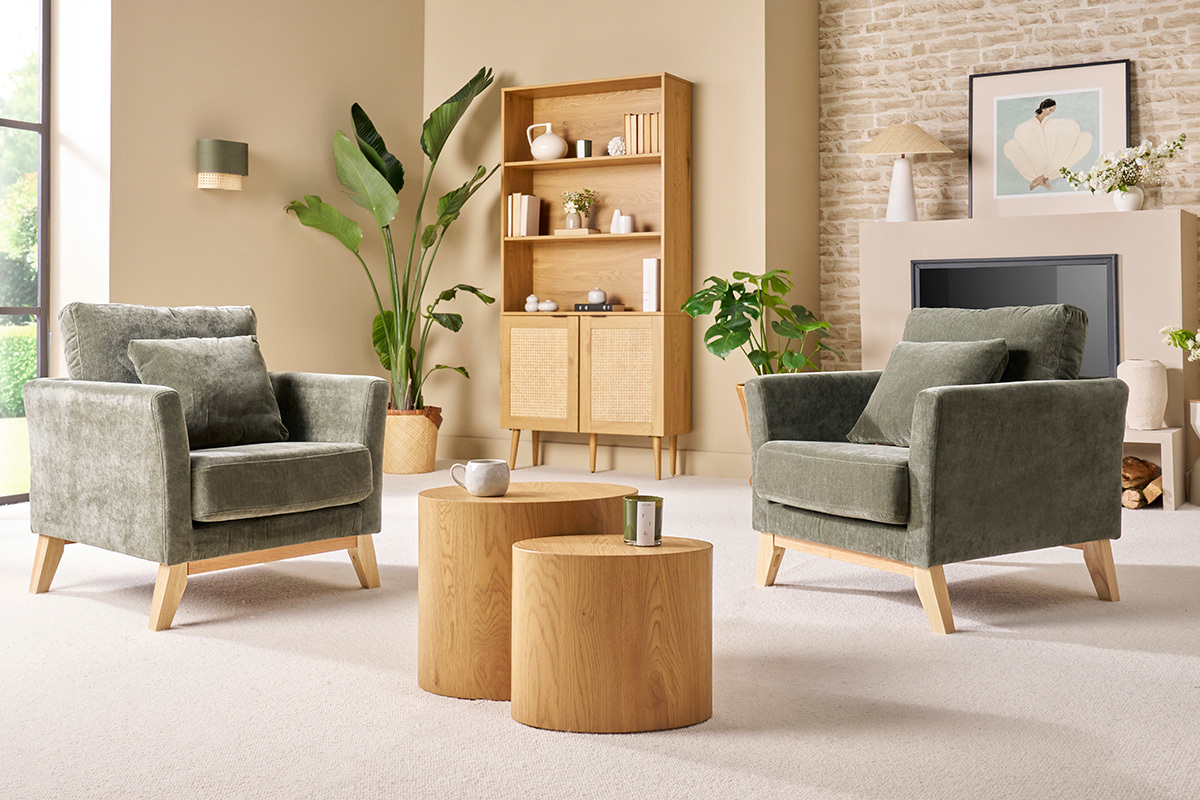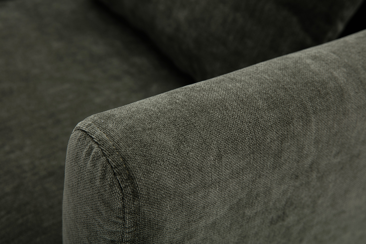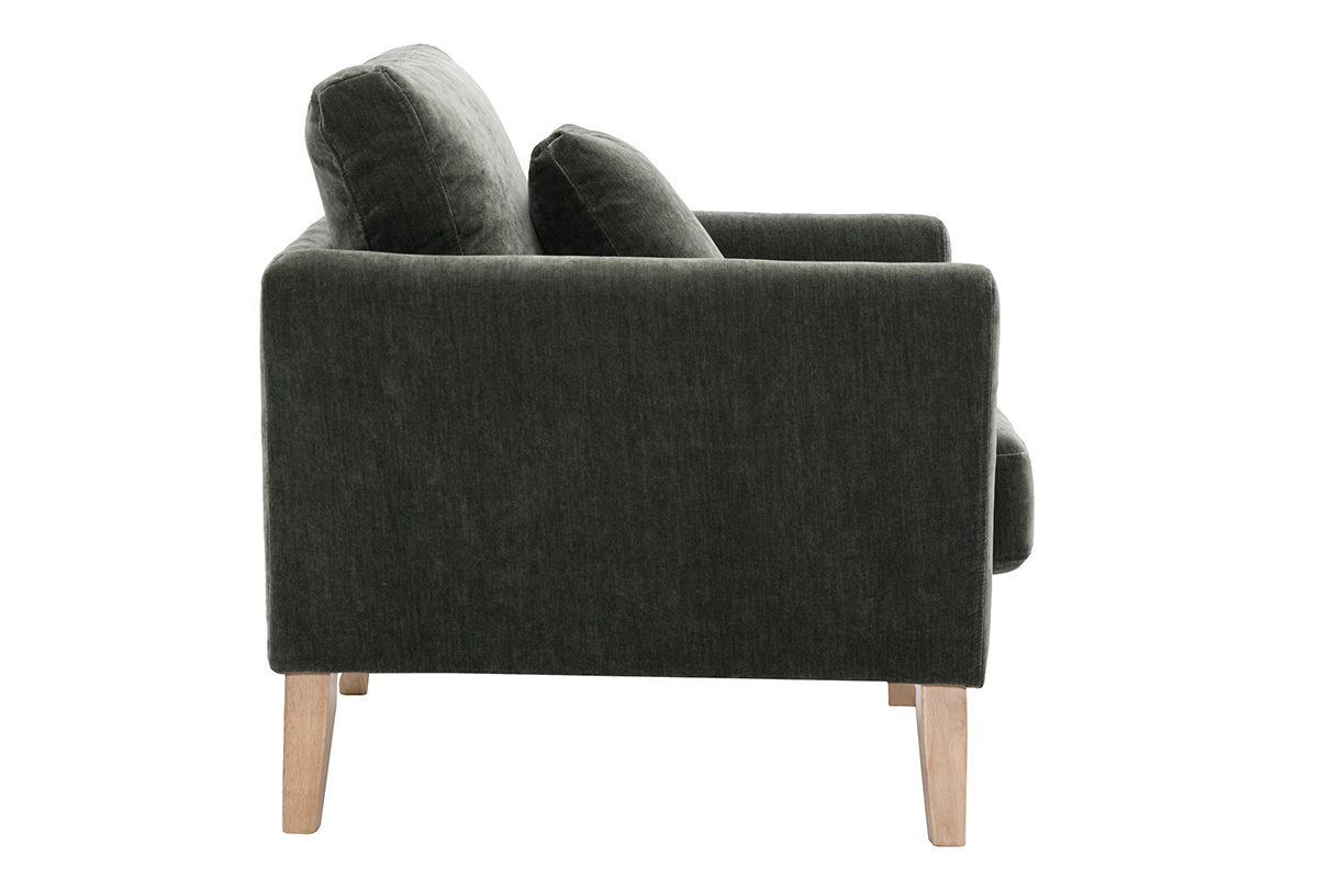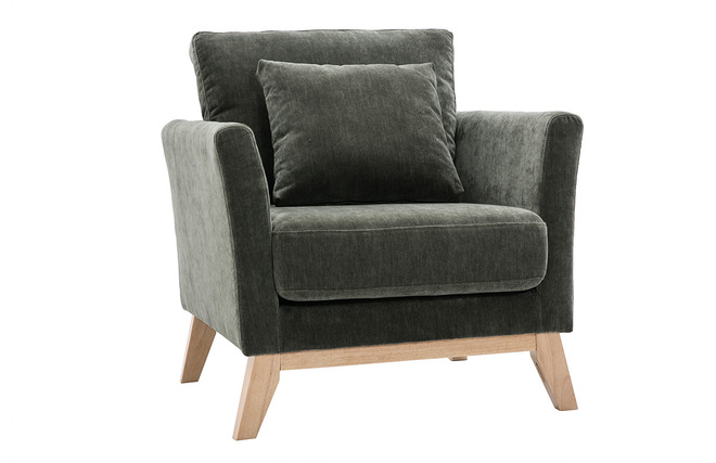 Fauteuil scandinave déhoussable en tissu effet velours vert kaki et bois clair OSLO, livré prêt à assembler. Montage simple, seul le piètement est à fixer.