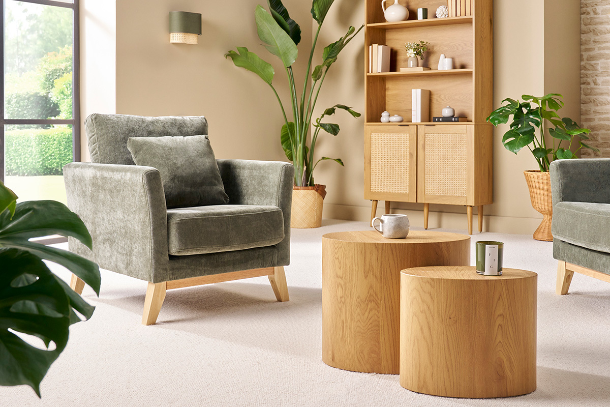 Pour s'aménager un espace fonctionnel dédié à la détente, placez une table d'appoint, un tapis duveteux et un luminaire design aux côtés du fauteuil OSLO.