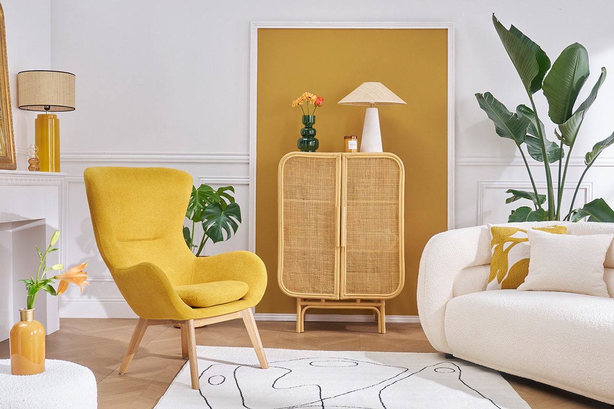 Avec son assise enveloppante, ce grand fauteuil jaune moutarde n'a pas fini de nous faire aimer les siestes. On se sent parfaitement bien installé assis sur son coussin garni de mousse et adossé à son dossier aux dimensions XXL. Équipé également de petits accoudoirs, le modèle ESKUA rassemble tout ce qu'on aime dans les fauteuils relax.