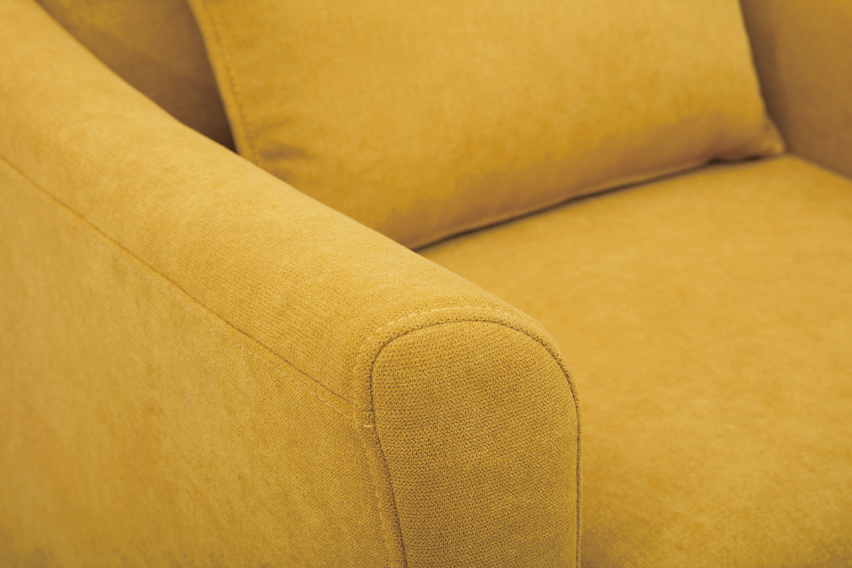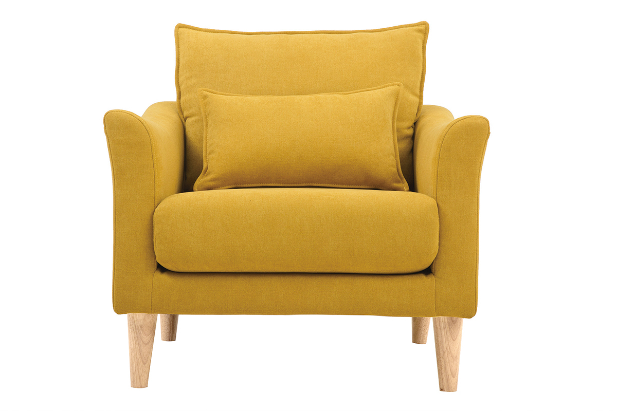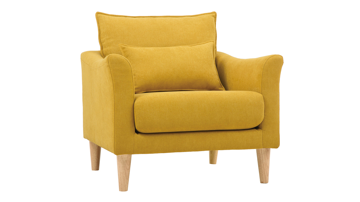 Fauteuil jaune moutarde livré prêt à assembler : seuls les pieds sont à fixer.