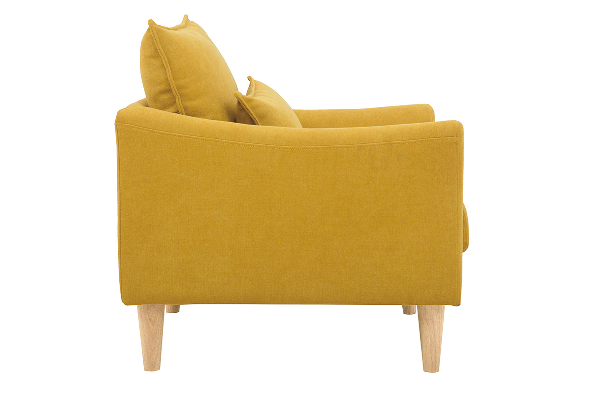 Style et élégance sont au rendez-vous ! Avec son magnifique revêtement en polyester effet velours et sa forme unique, le fauteuil KATE incarne un esprit résolument chic. On aime particulièrement l'intensité de ce jaune moutarde. Il illuminera le salon tout en apportant une touche chaleureuse à sa décoration. Son association avec un piètement en bois massif clair rappelle tout ce qui fait le charme du style scandinave.