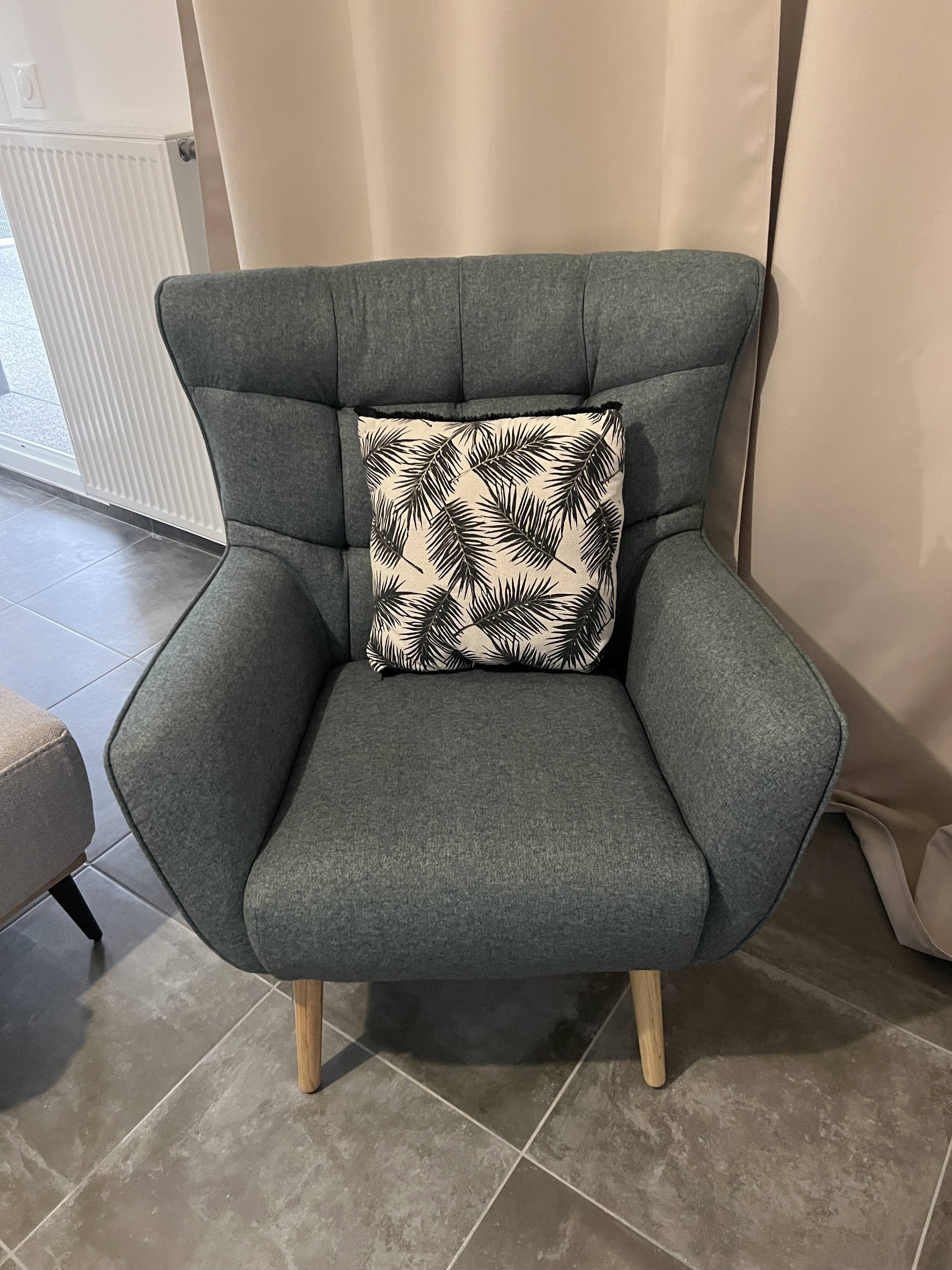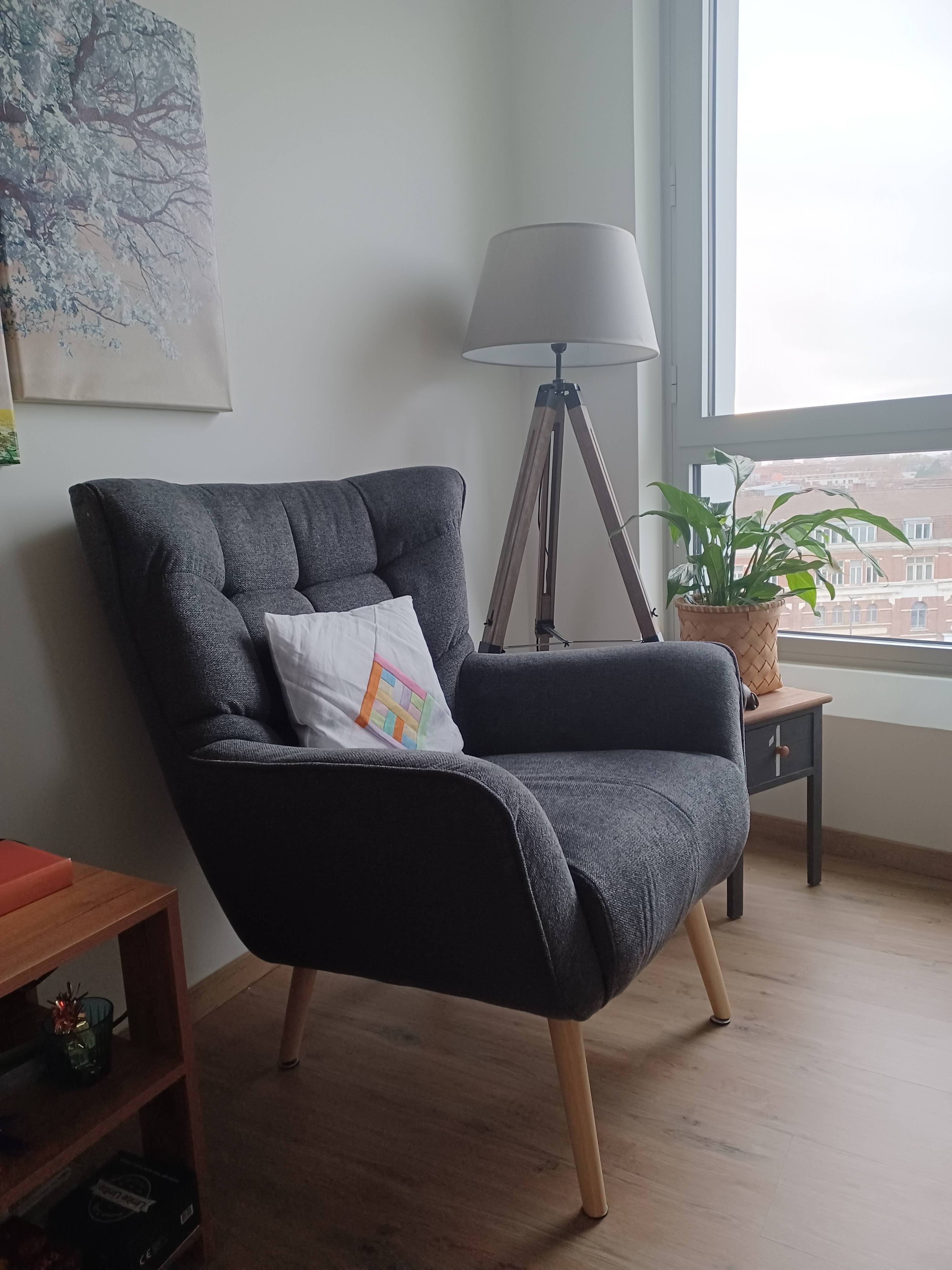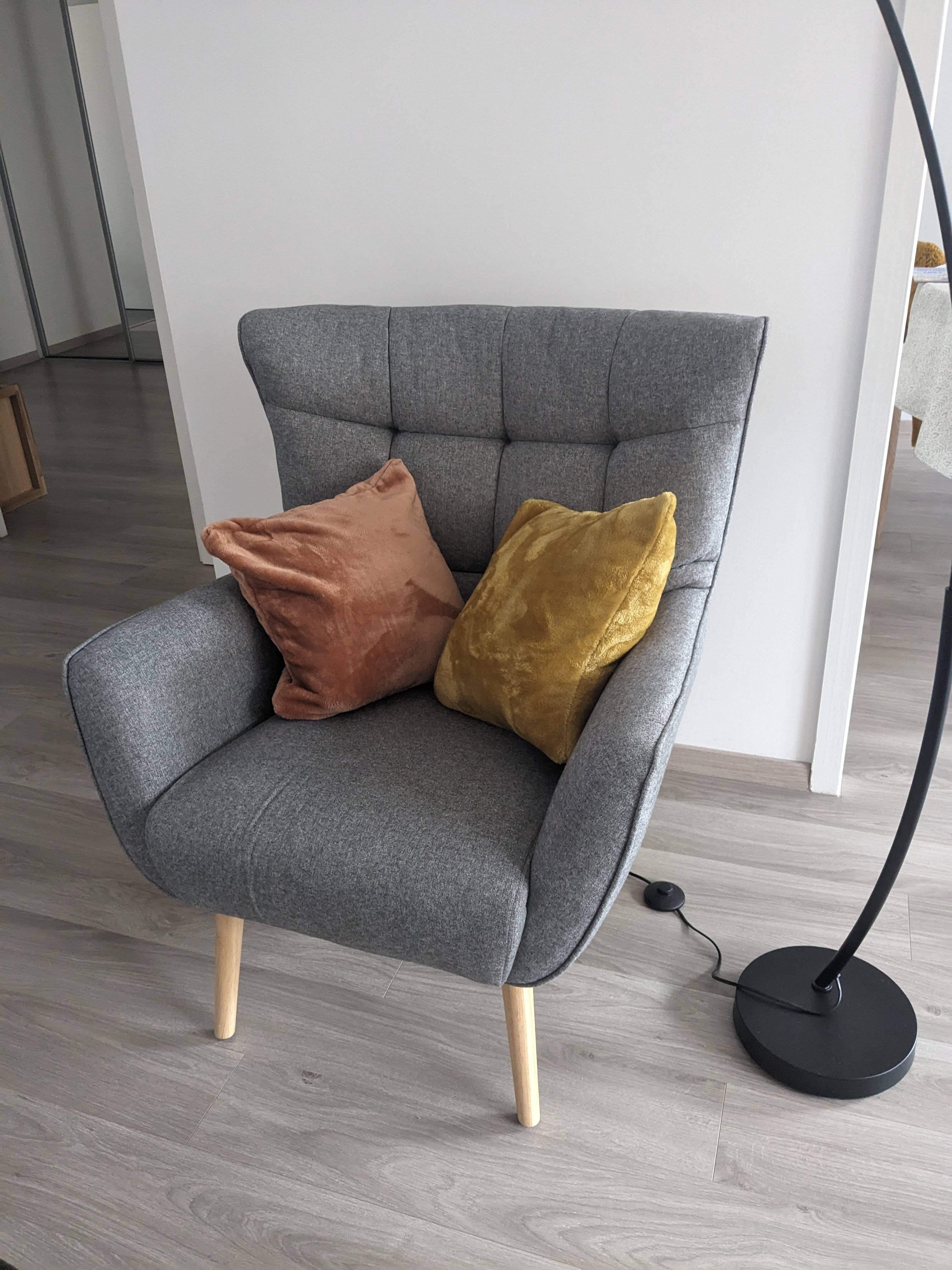 On dispose ce fauteuil gris foncé dans le séjour aux côtés d'un canapé scandinave pour s'aménager un intérieur cosy.