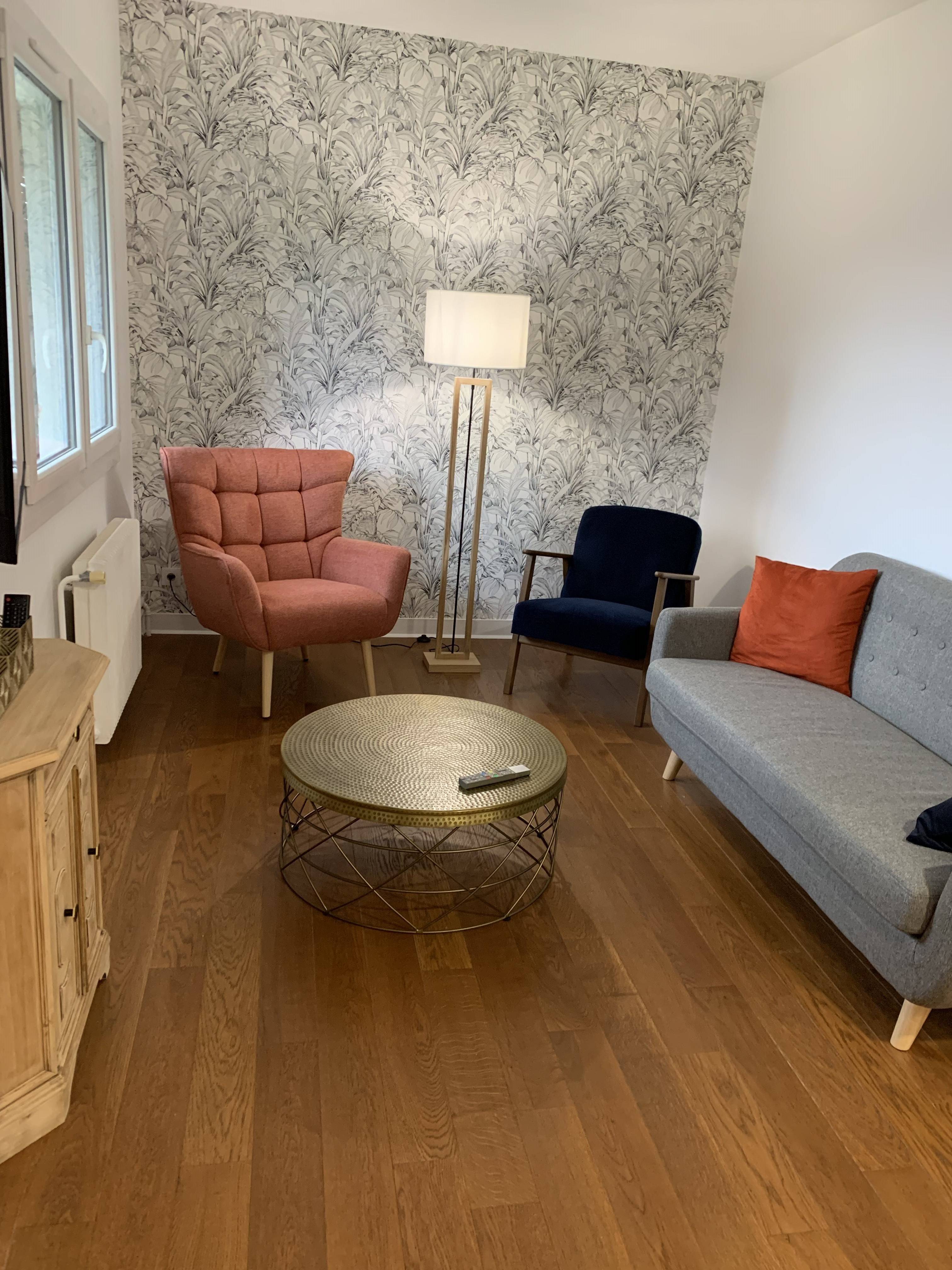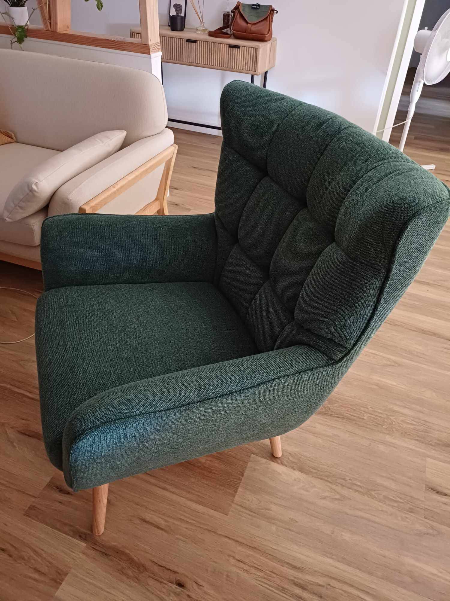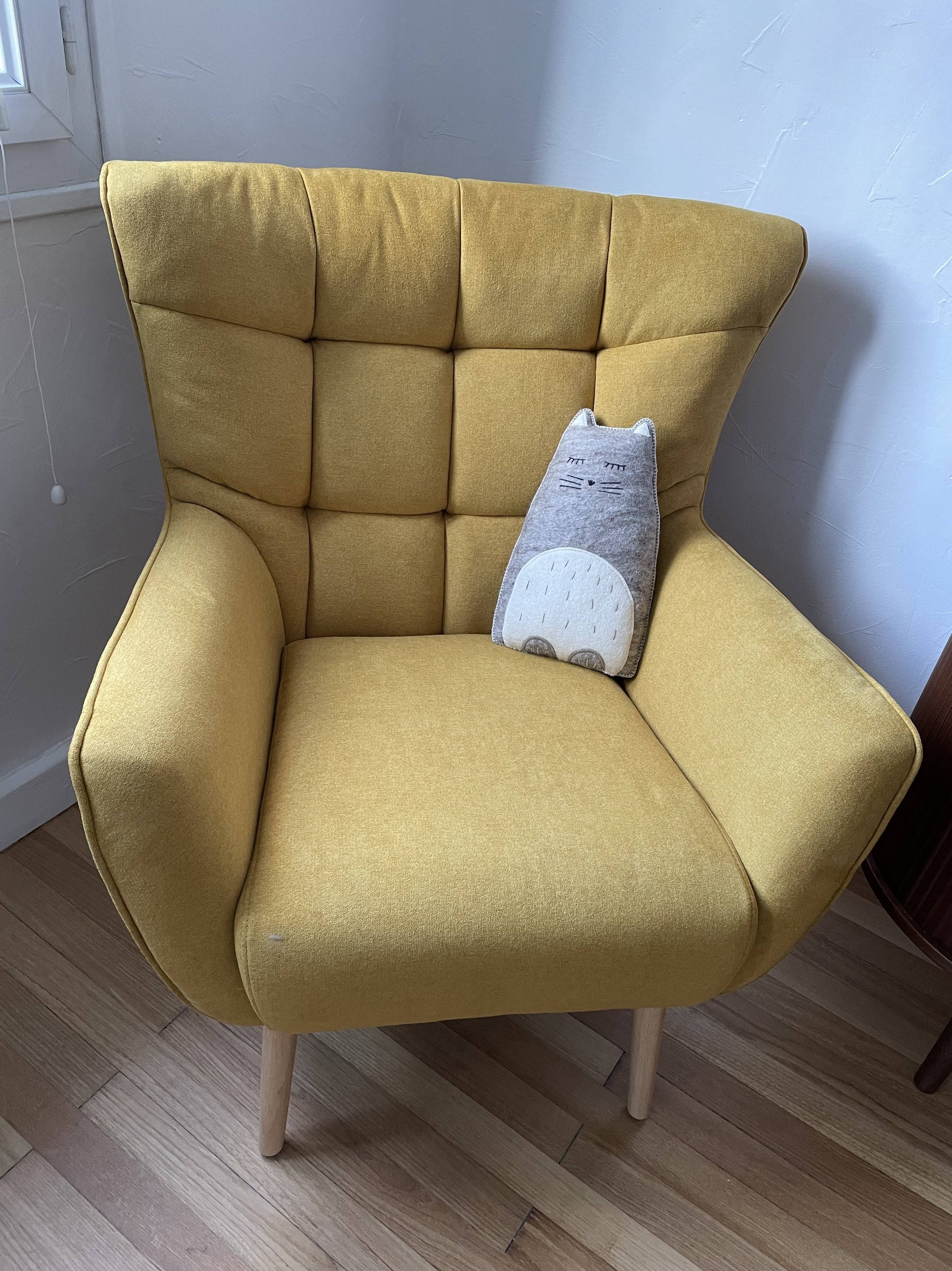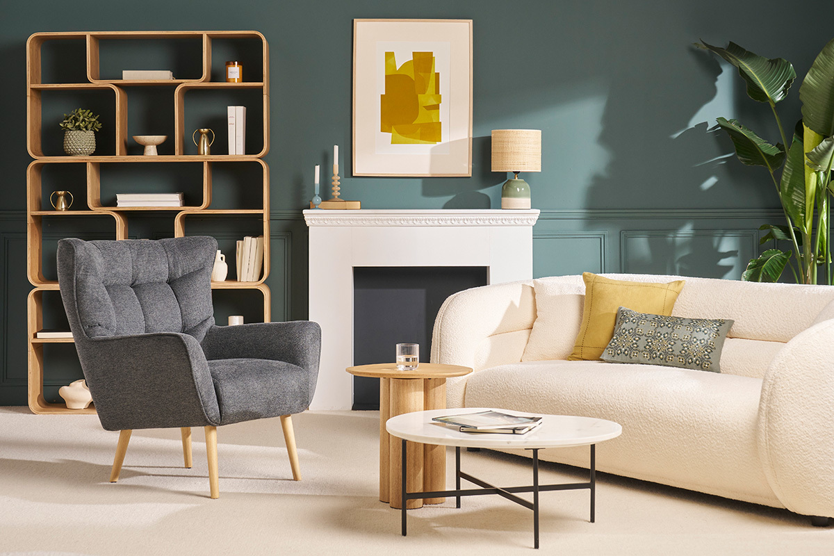 On dispose ce fauteuil gris foncé dans le séjour aux côtés d'un canapé scandinave pour s'aménager un intérieur cosy.