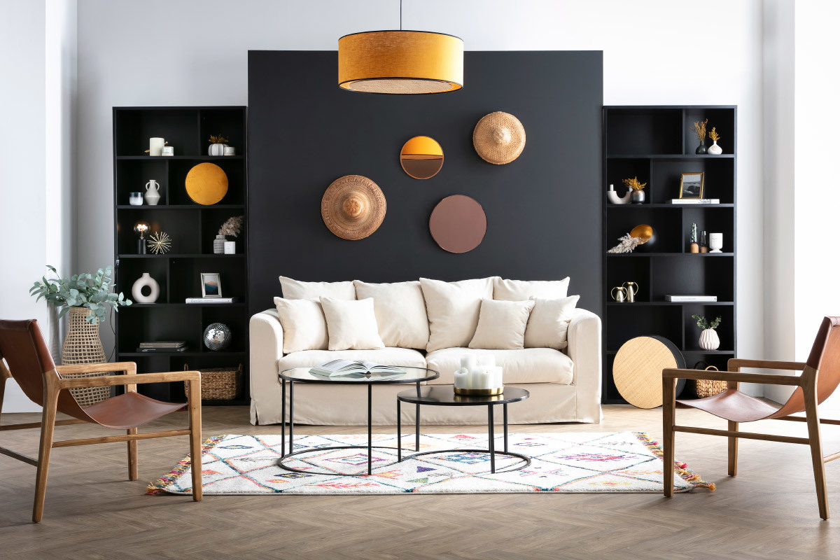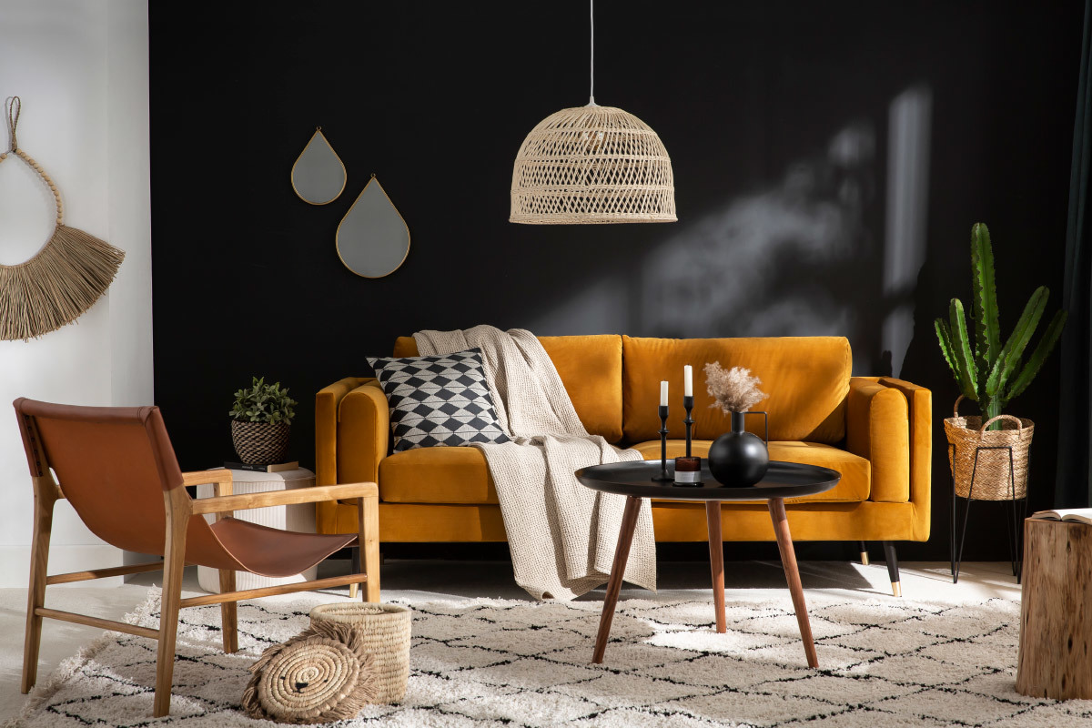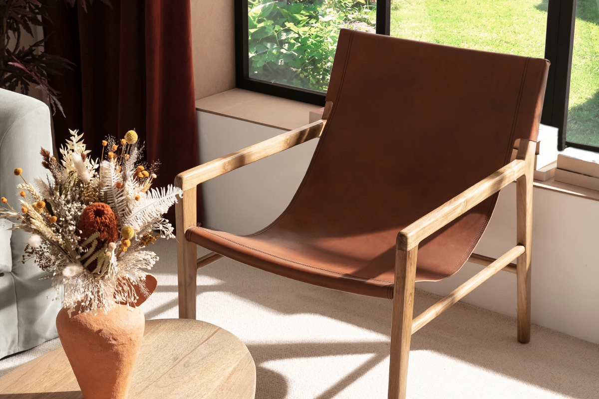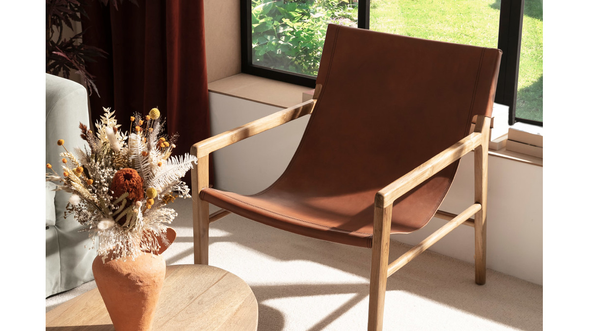 Installé dans le salon, le fauteuil en cuir et teck CHILLY offre une assise supplémentaire ultra cosy près du canapé. On l'imagine très bien accompagné d'une petite table d'appoint pour se créer un espace détente unique !