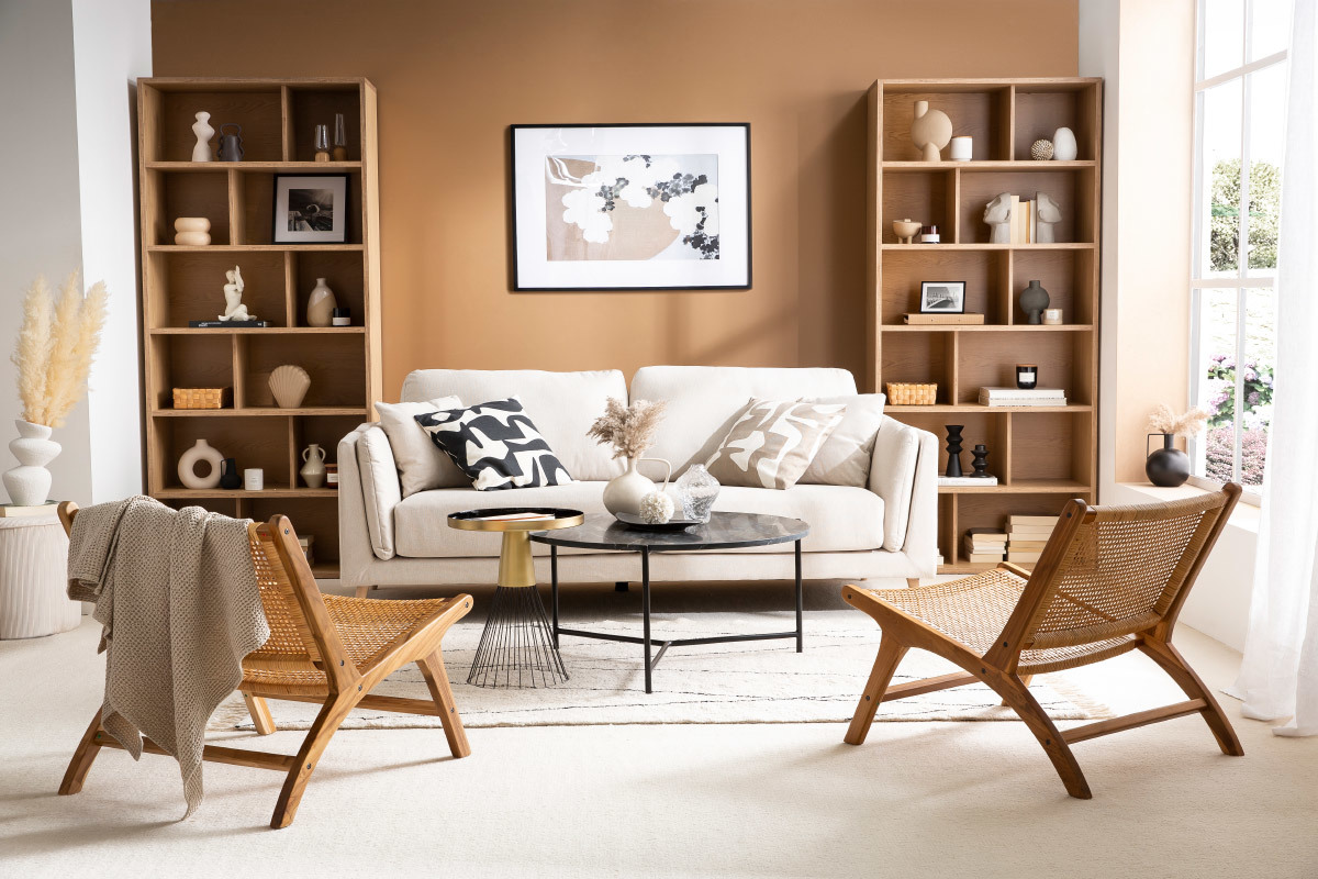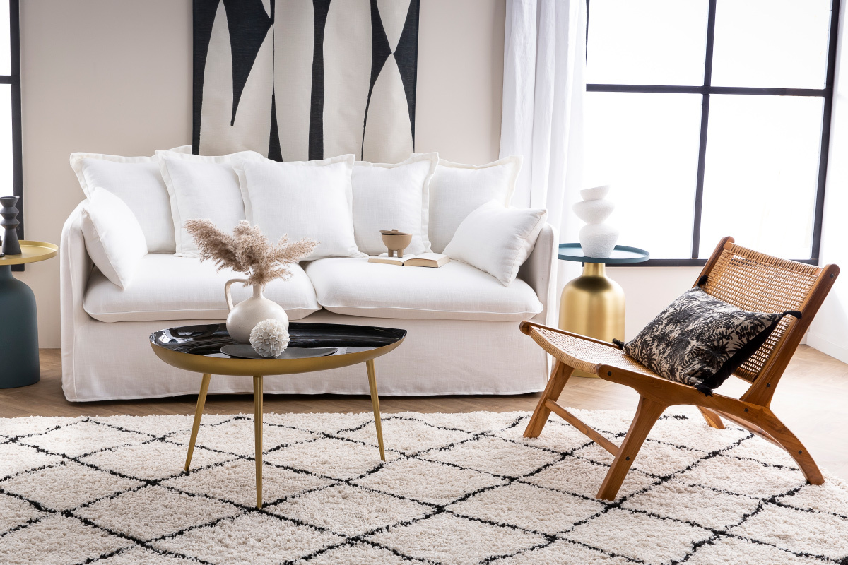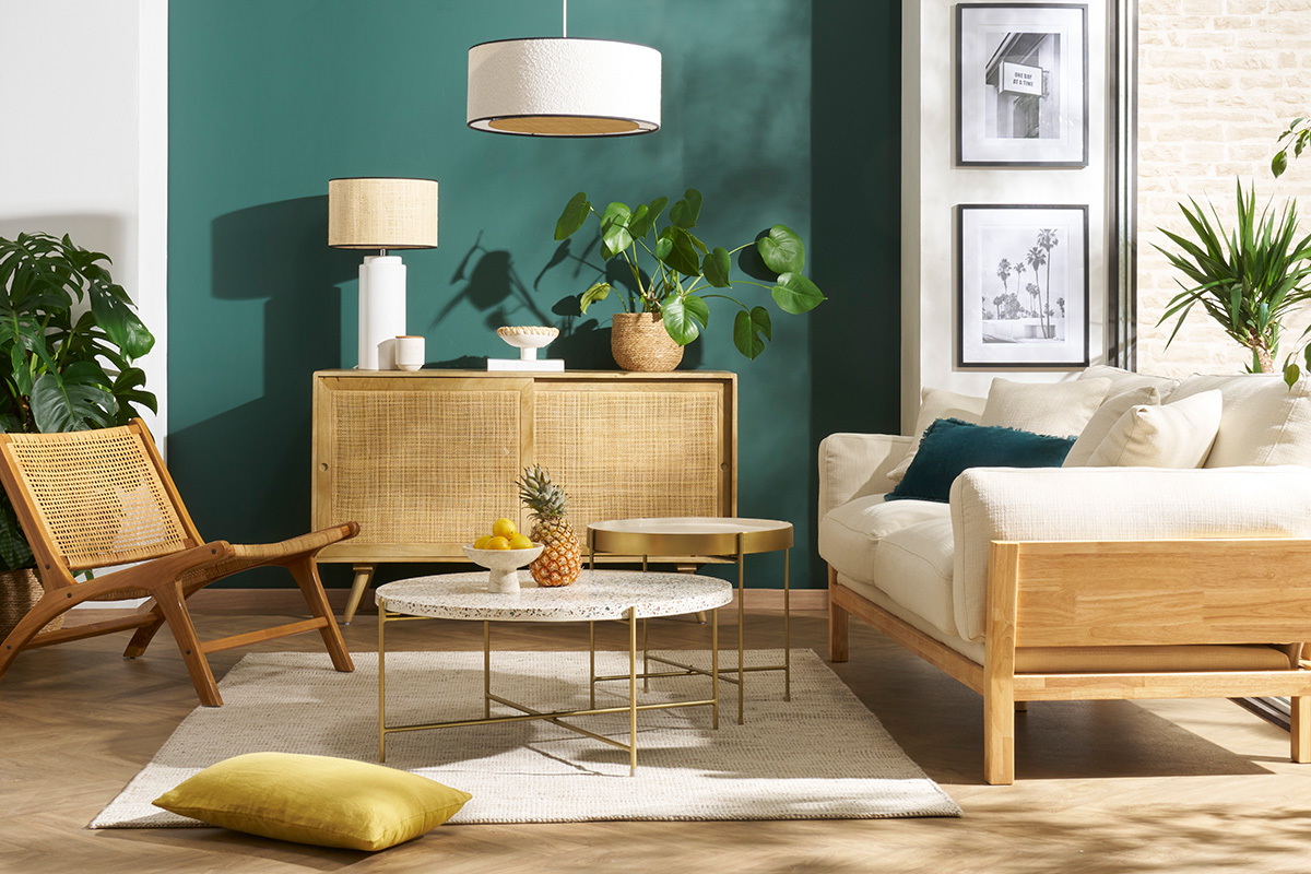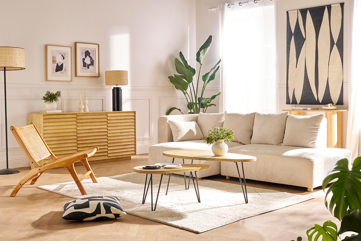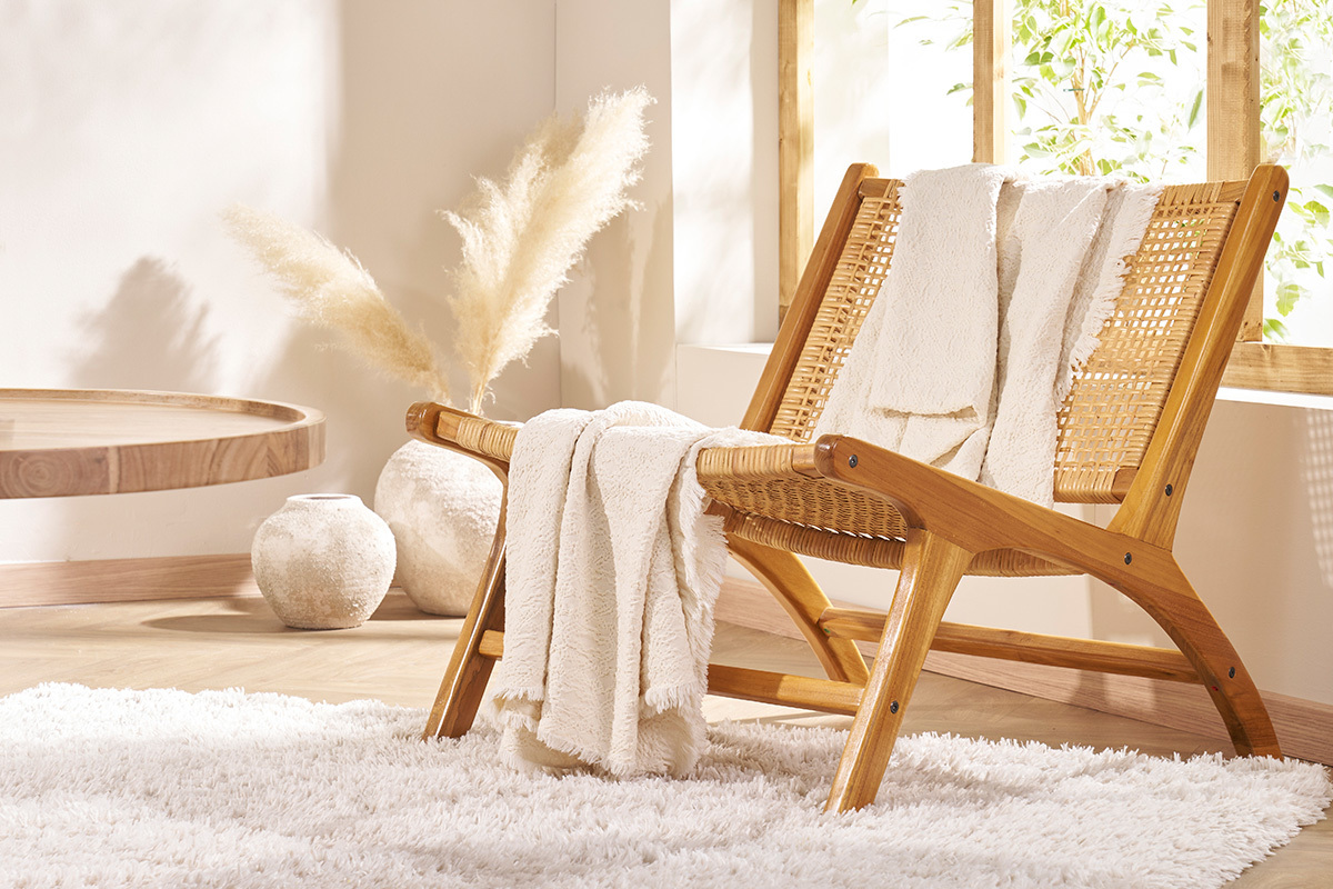 Mobilier en bois et accessoires en fibres naturelles se marieront parfaitement avec le design de ce fauteuil. Pour créer une décoration aussi chaleureuse qu'harmonieuse, on opte pour un tapis en jute ou berbère et une table en bois.