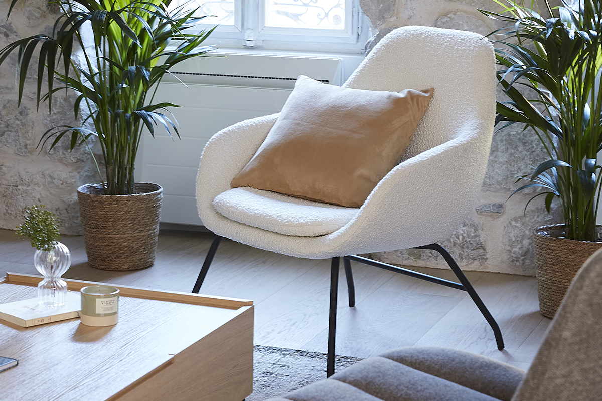 Aucun doute, MAYNE s'imposera comme un élément incontournable du décor. Dans le salon comme dans la chambre, il deviendra un acteur à part entière de la pièce ! Ce fauteuil blanc cassé se coordonera sans mal à d'autres meubles aux tons épurées. Pour un spot ultra déco, pourquoi ne pas l'associer à une table d'appoint minimaliste ?