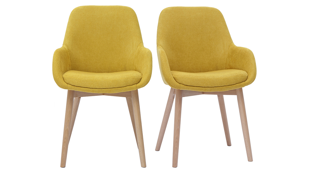 Entre design contemporain et naturel, ces fauteuils en tissu effet velours jaune moutarde et piètement bois clair conjuguent avec style lignes épurées et authenticité. Pile dans la tendance nordique, les silhouettes intemporelles de ces fauteuils scandinaves camperont leur élégante simplicité dans une cuisine ou une salle à manger en quête de douceur et de fonctionnalité.
