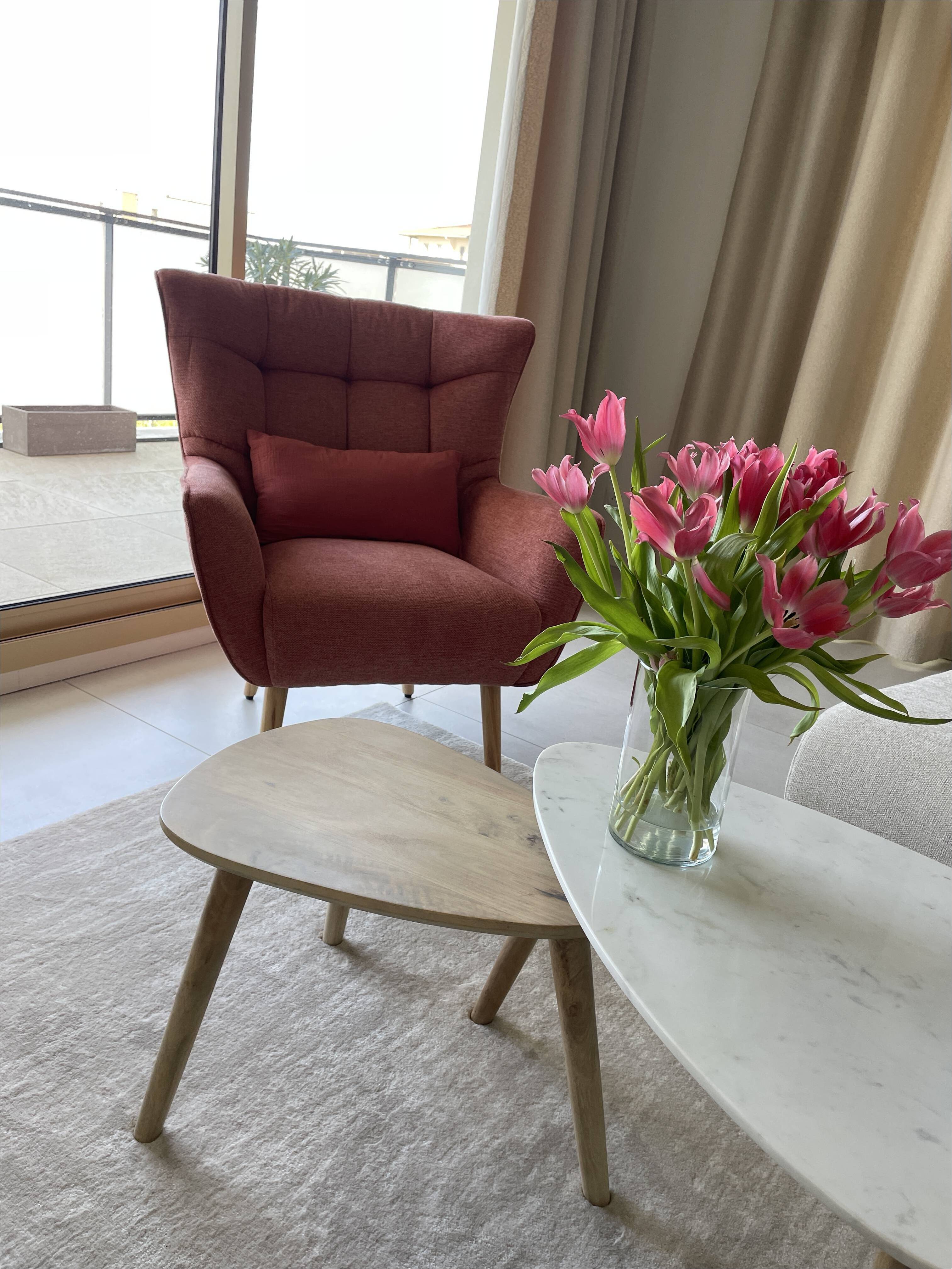 On dispose ce fauteuil terracotta dans le séjour aux côtés d'un canapé scandinave pour s'aménager un intérieur cosy.