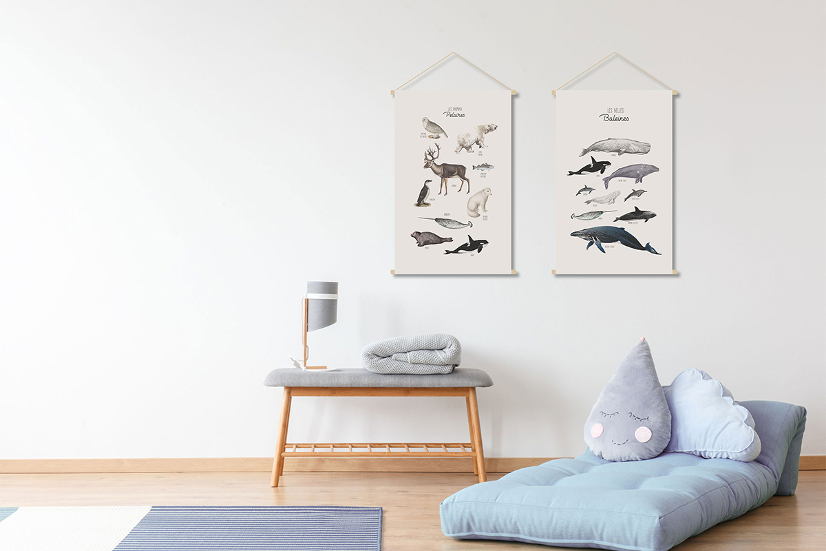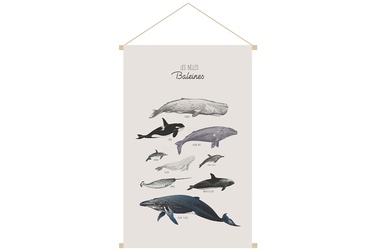 Adaptable selon le style souhaité, idéal pour dynamiser une déco à moindre travaux, le kakemono est un accessoire en vogue dans nos intérieurs et un immanquable pour suivre à l'envi les goûts de votre chérubin. Facile et rapide à installer, cette vague de « Belles Baleines » se tient prête à déferler sur un mur monochrome un peu trop sage !