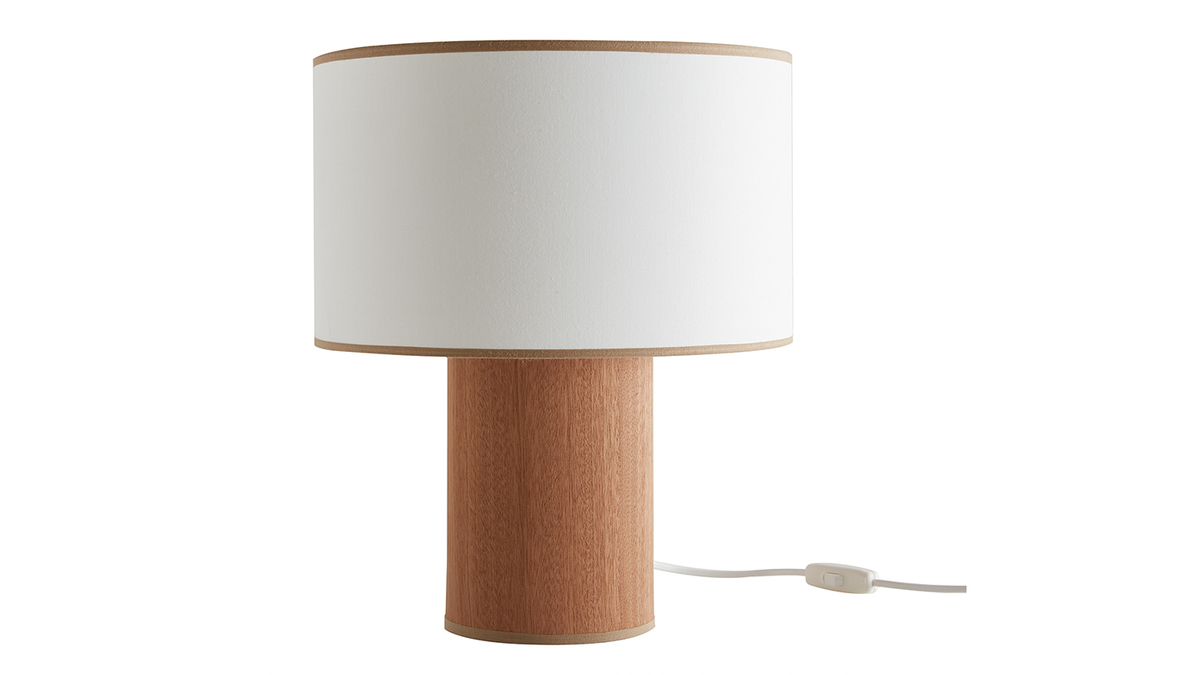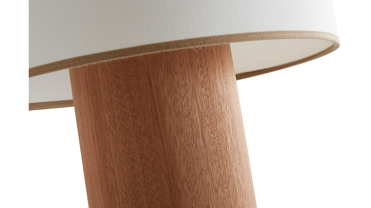 Matière : Abat-jour en coton, socle en feuille d'acajou, carcasse abat-jour en métal blanc, câble en plastique