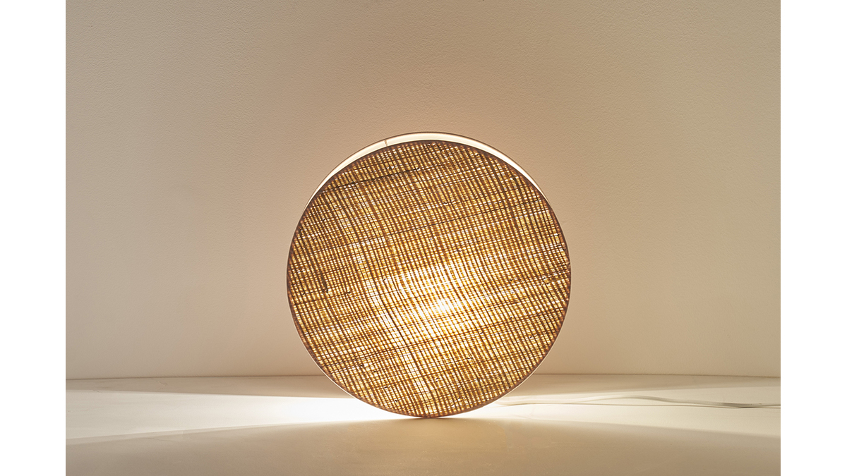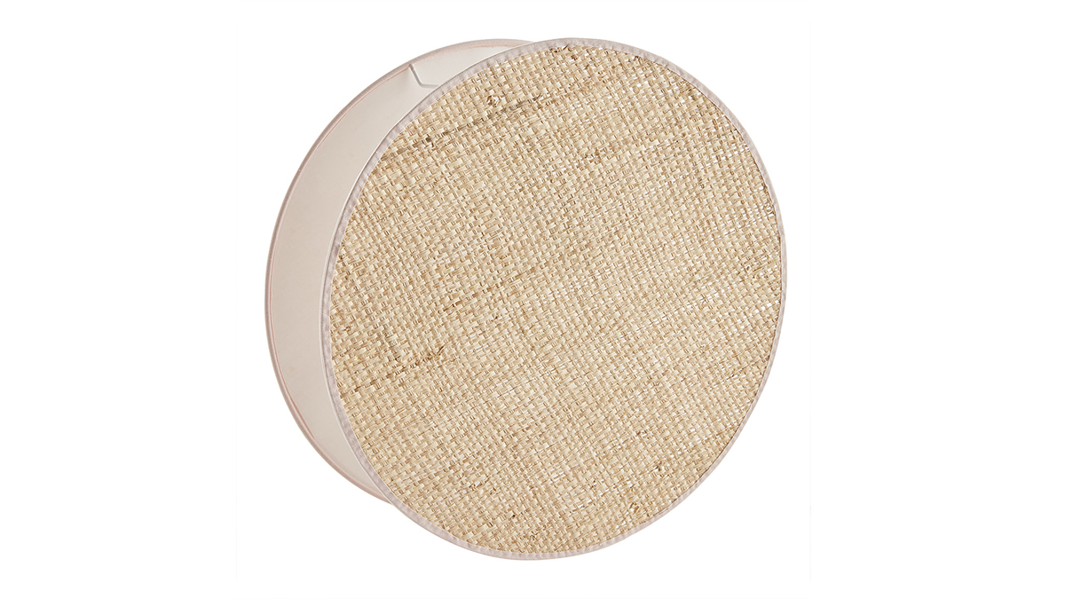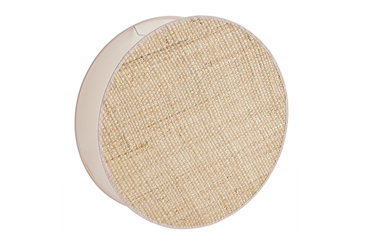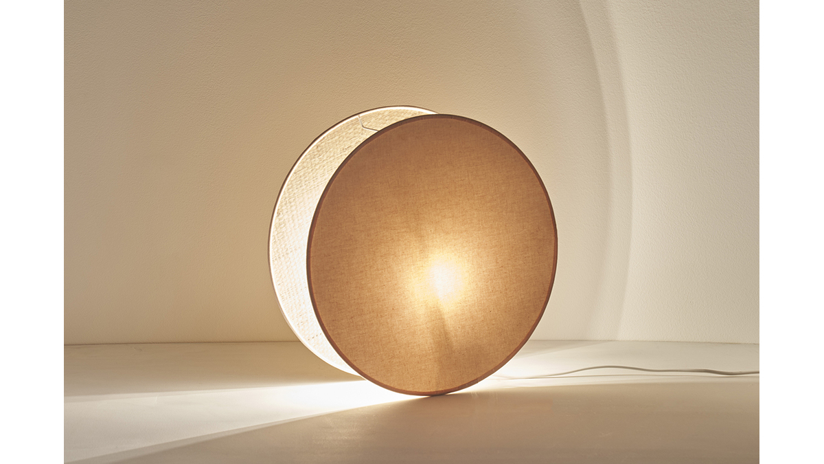 Cette lampe design ronde mélange avec habileté les matières. Le premier disque de l'abat-jour est habillé d'un élégant tissu couleur rose pastel tandis que le second est recouvert d'un tissu rabane 100% naturel. Ces disques encadrent la source lumineuse qui est maintenue par une fine structure en fil d'acier blanc. Ils diffusent une lumière tamisée et chaleureuse. L'effet lumineux change selon le positionnement de la lampe. On l'imagine posée directement au sol ou sur le plateau d'un meuble de rangement ou d'une console.