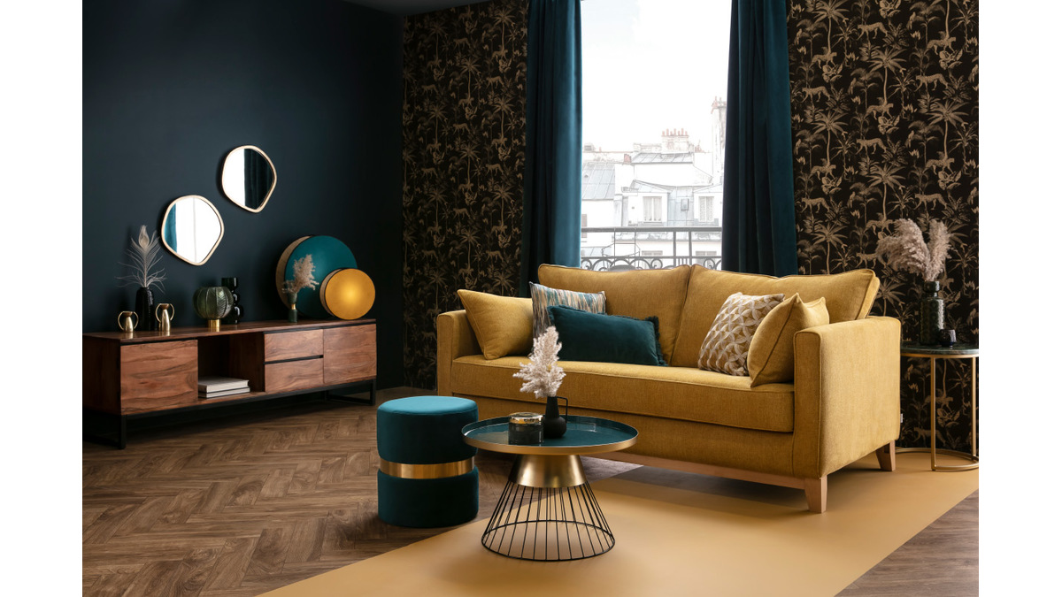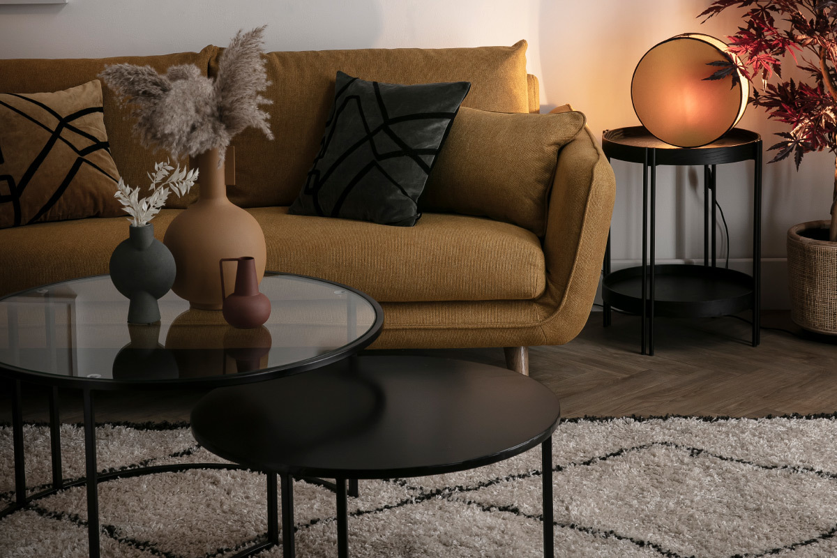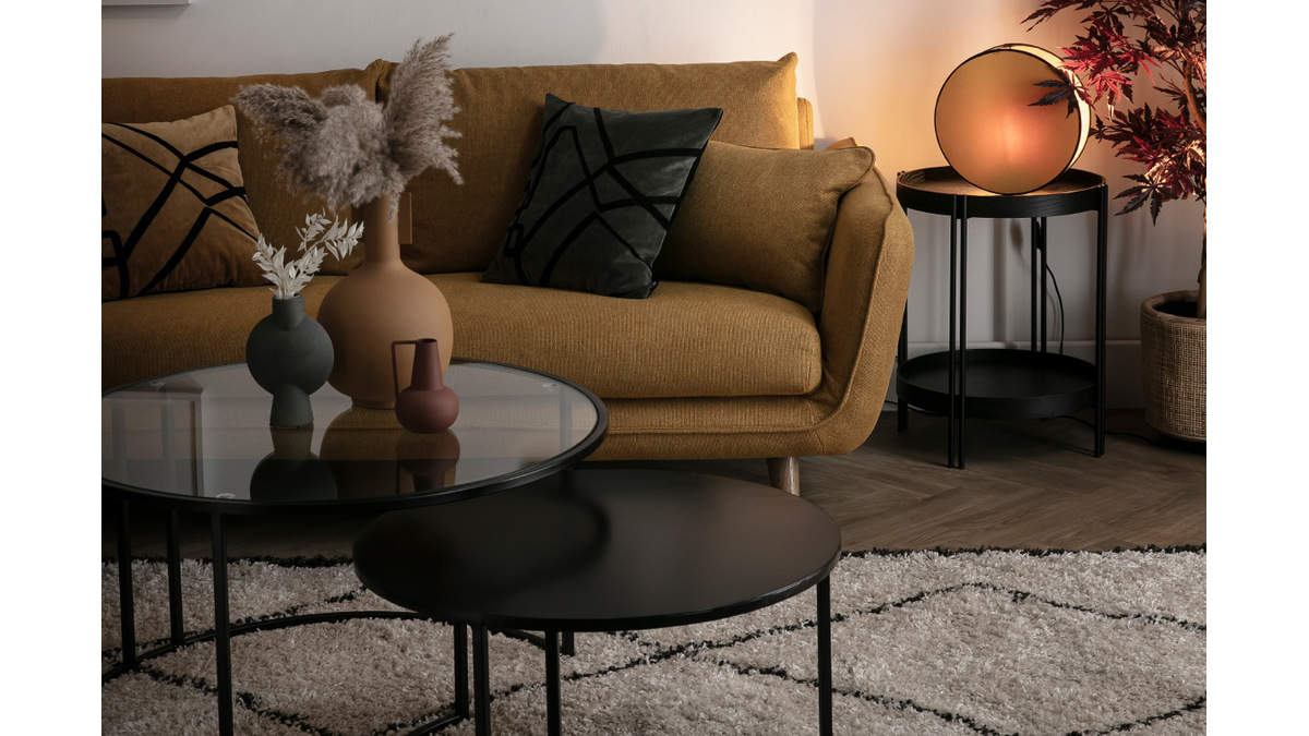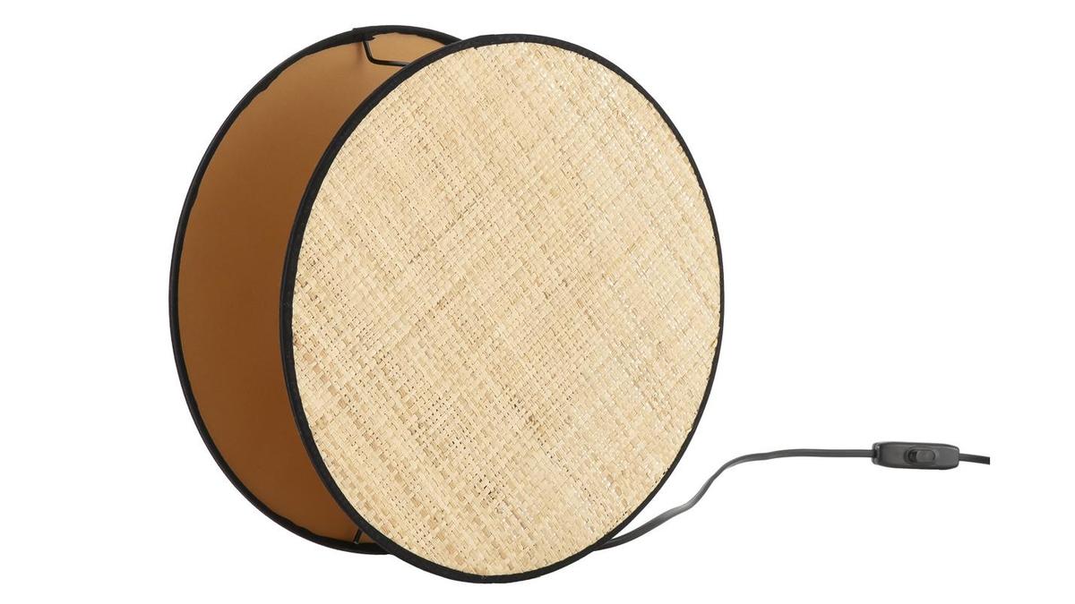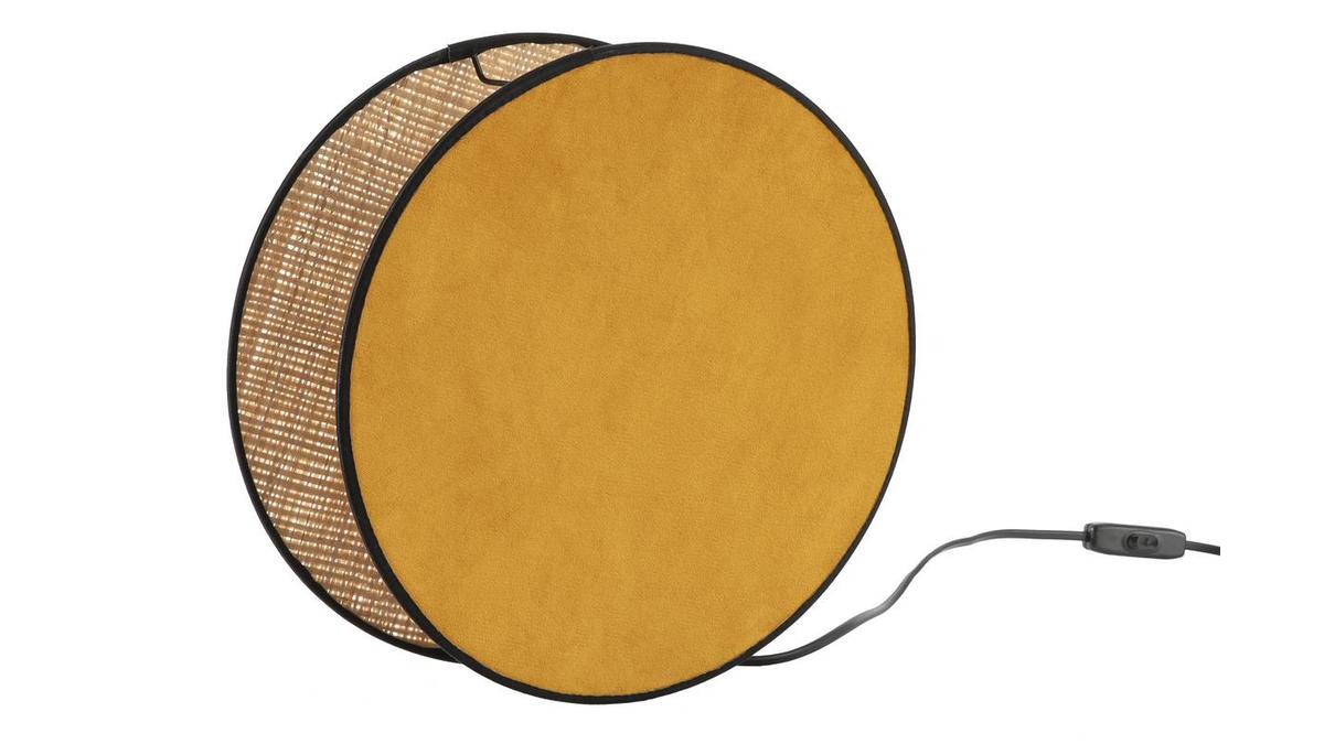 Cette lampe design ronde mélange avec habileté les matières. Le premier disque de l'abat-jour est habillé d'un élégant tissu velours jaune moutarde tandis que le second est recouvert d'un tissu rabane 100% naturel. Ces disques encadrent la source lumineuse qui est maintenue par une fine structure en fil d'acier noir. Ils diffusent une lumière tamisée et chaleureuse. L'effet lumineux change selon le positionnement de la lampe. On l'imagine posée directement au sol ou sur le plateau d'un meuble de rangement ou d'une console.