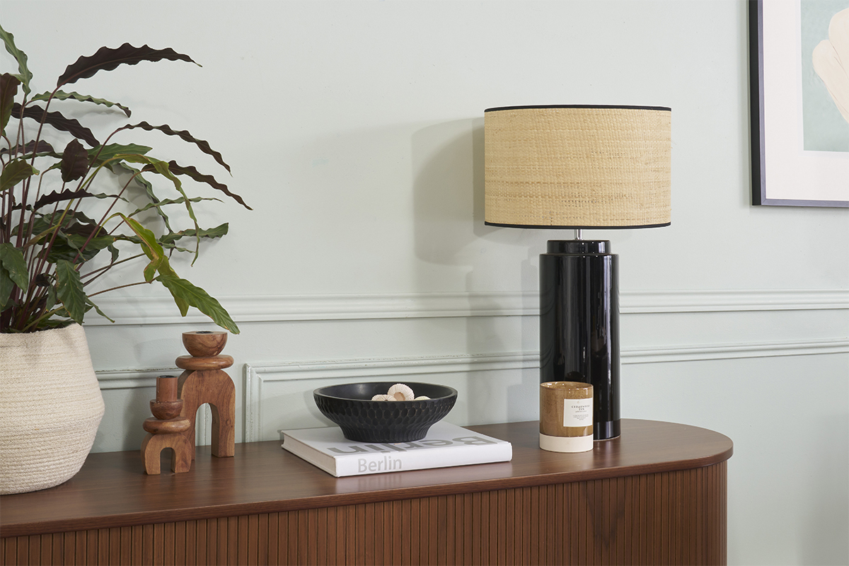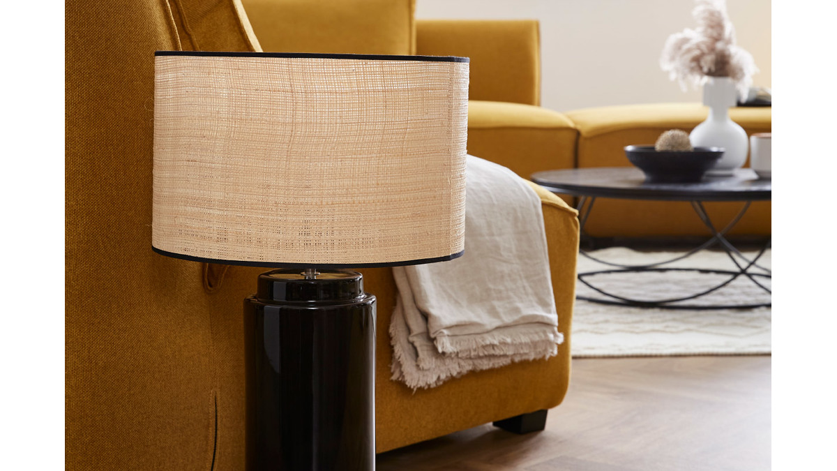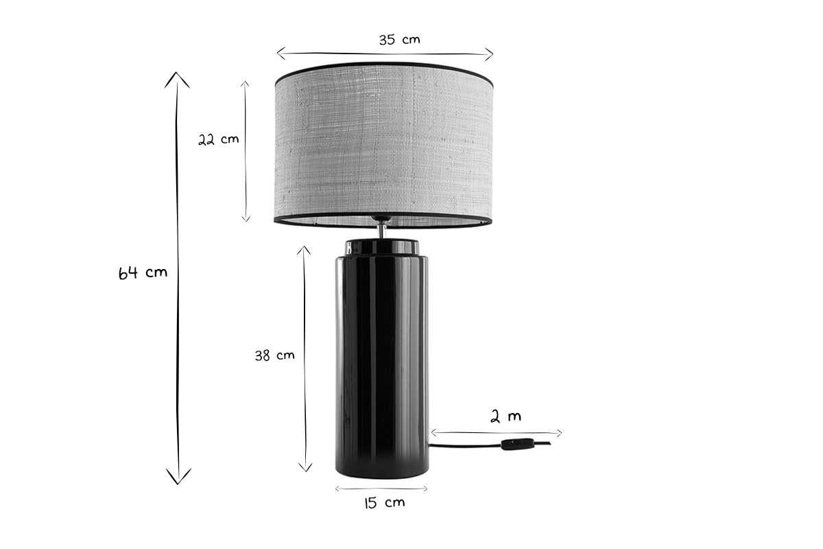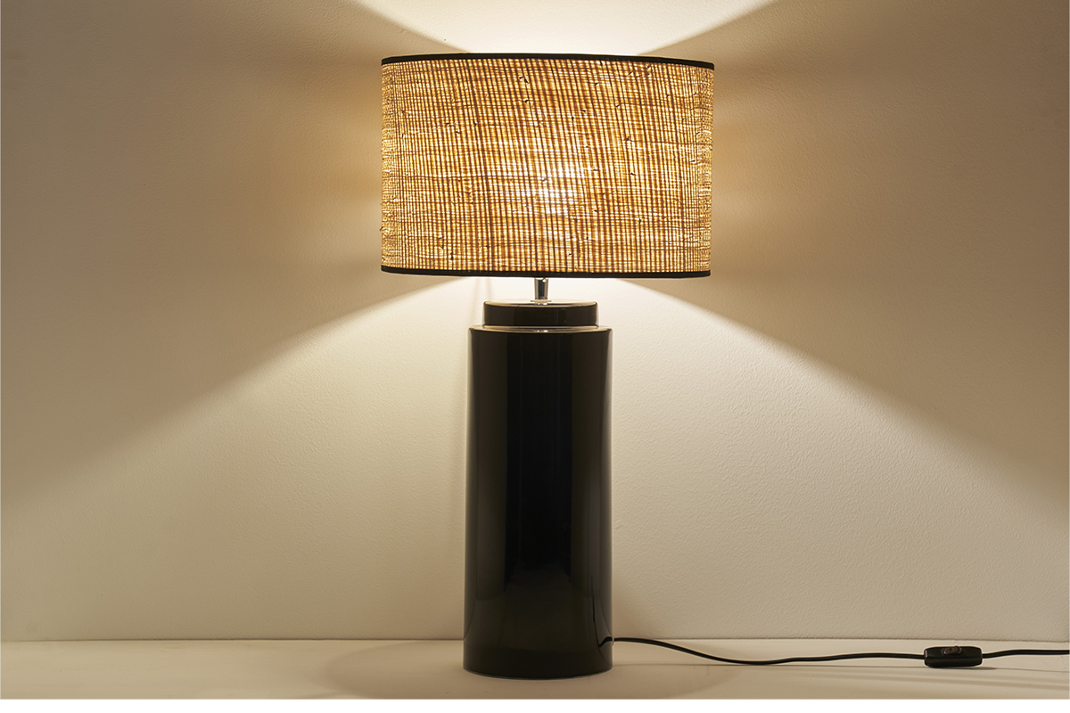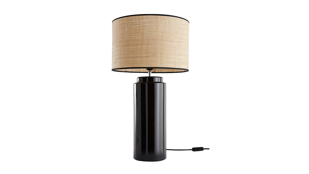 Avec sa grande base cylindrique en céramique émaillée noire et son abat-jour en raphia naturel, cette lampe à poser noire arbore un jeu de matières justement maîtrisé. Elle offre le parfait mélange entre modernité et authenticité ! On aime particulièrement le biais en coton noir qui souligne délicatement l'abat-jour. Avec son look épuré, cette lampe à poser fabriquée au Portugal s'harmonise tout en douceur avec le reste de votre intérieur.