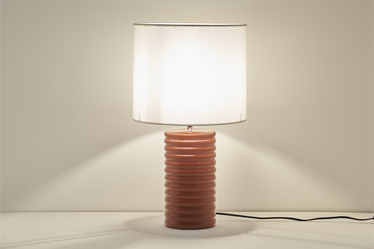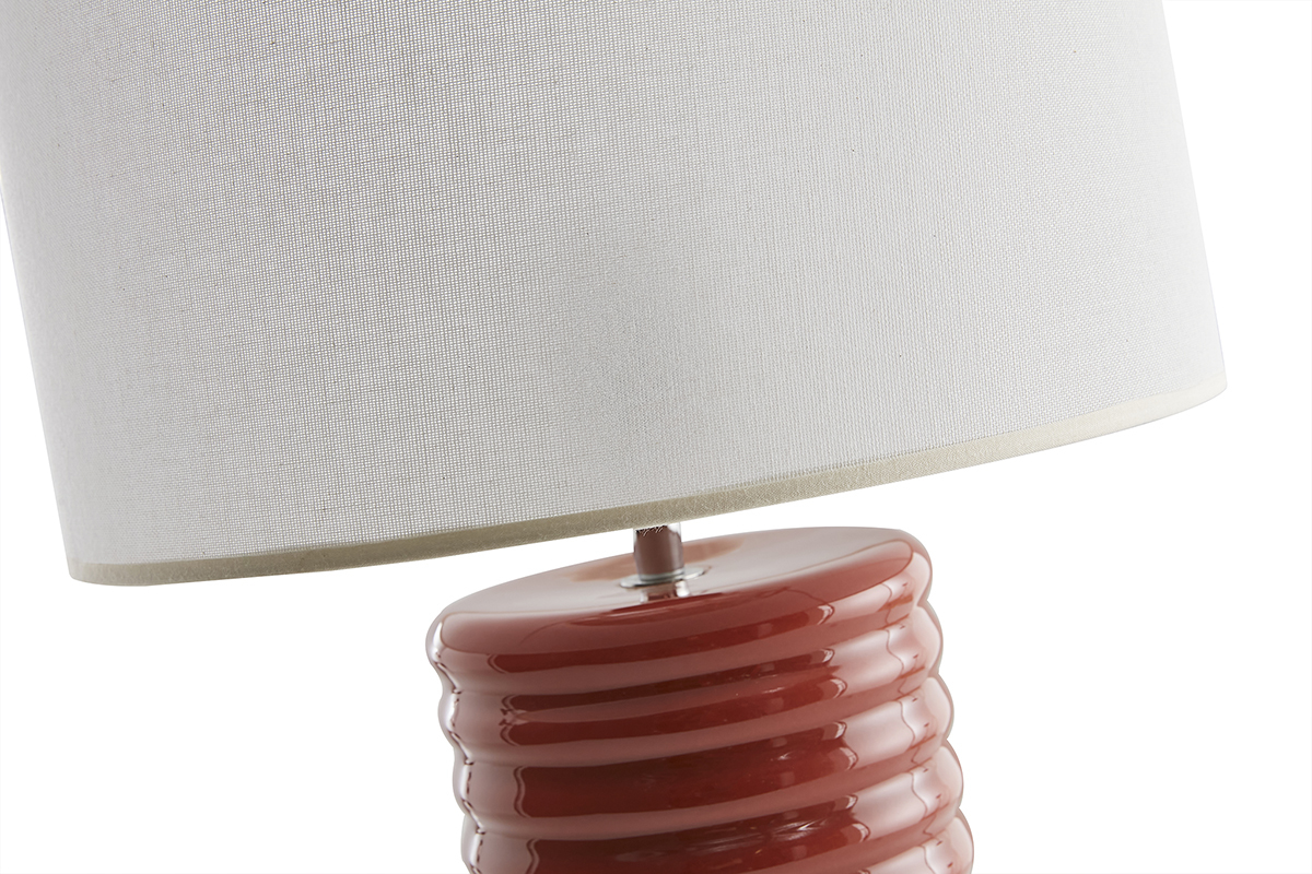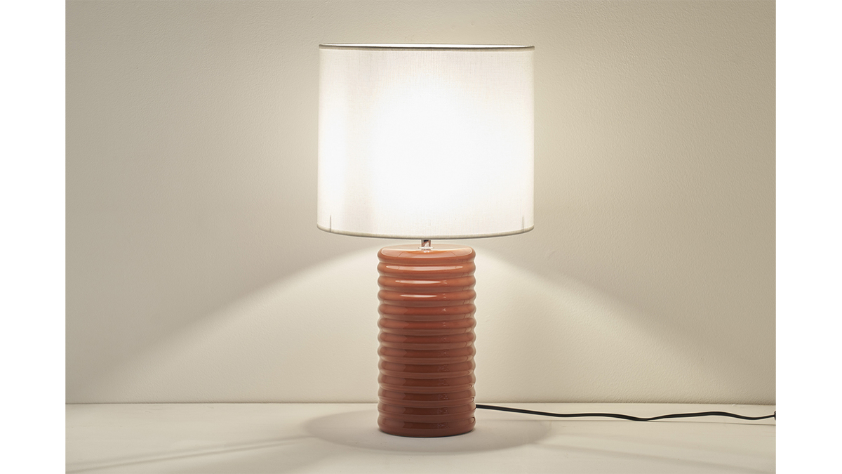 Coiffée d'un abat-jour cylindrique en coton écru bordé d'un liseré naturel, sa base élancée en céramique émaillée se pare d'une belle couleur terracotta: un tandem du plus bel effet ! La lumière est principalement orientée vers le haut et filtre également à travers l'abat-jour créant une atmosphère reposante et feutrée.