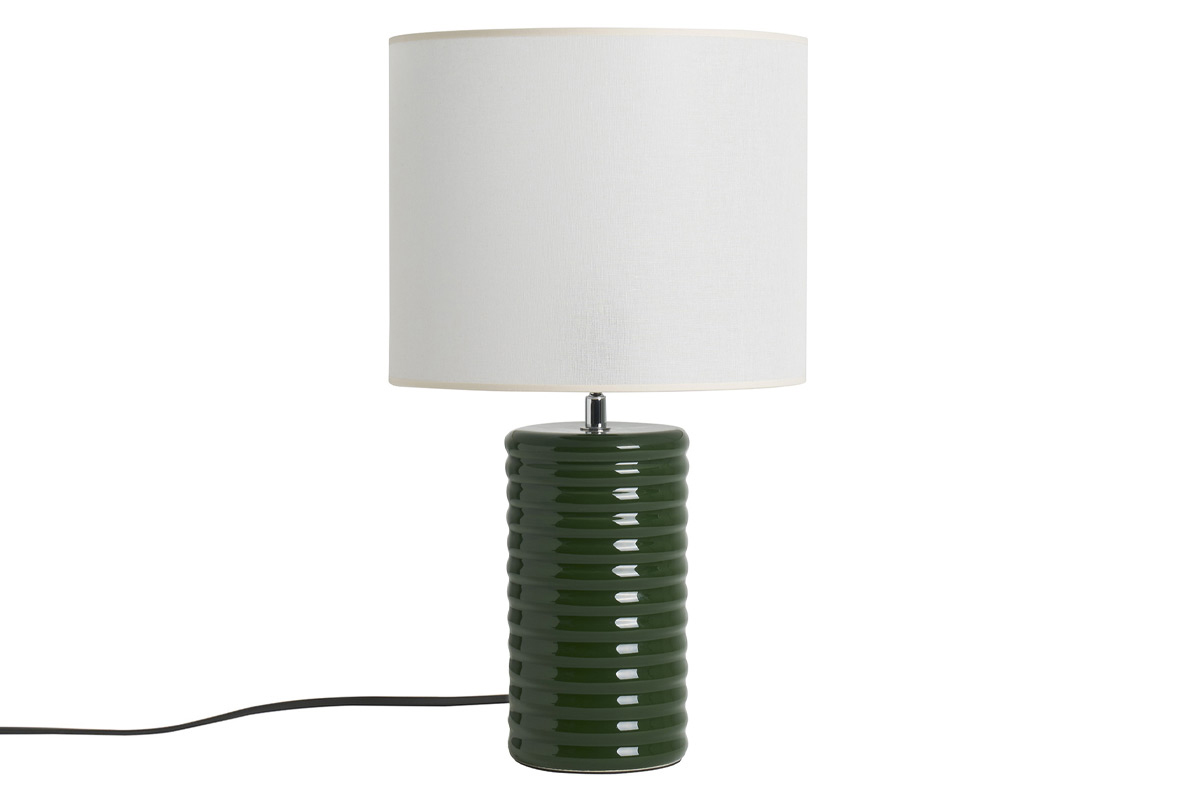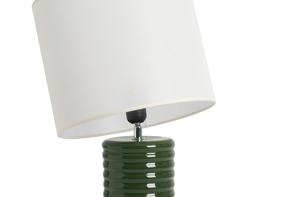 Coiffée d'un abat-jour cylindrique en coton écru bordé d'un liseré naturel, sa base élancée en céramique émaillée se pare d'une douce couleur verte : un tandem du plus bel effet ! La lumière est principalement orientée vers le haut et filtrée également à travers l'abat-jour créant une atmosphère reposante et feutrée.