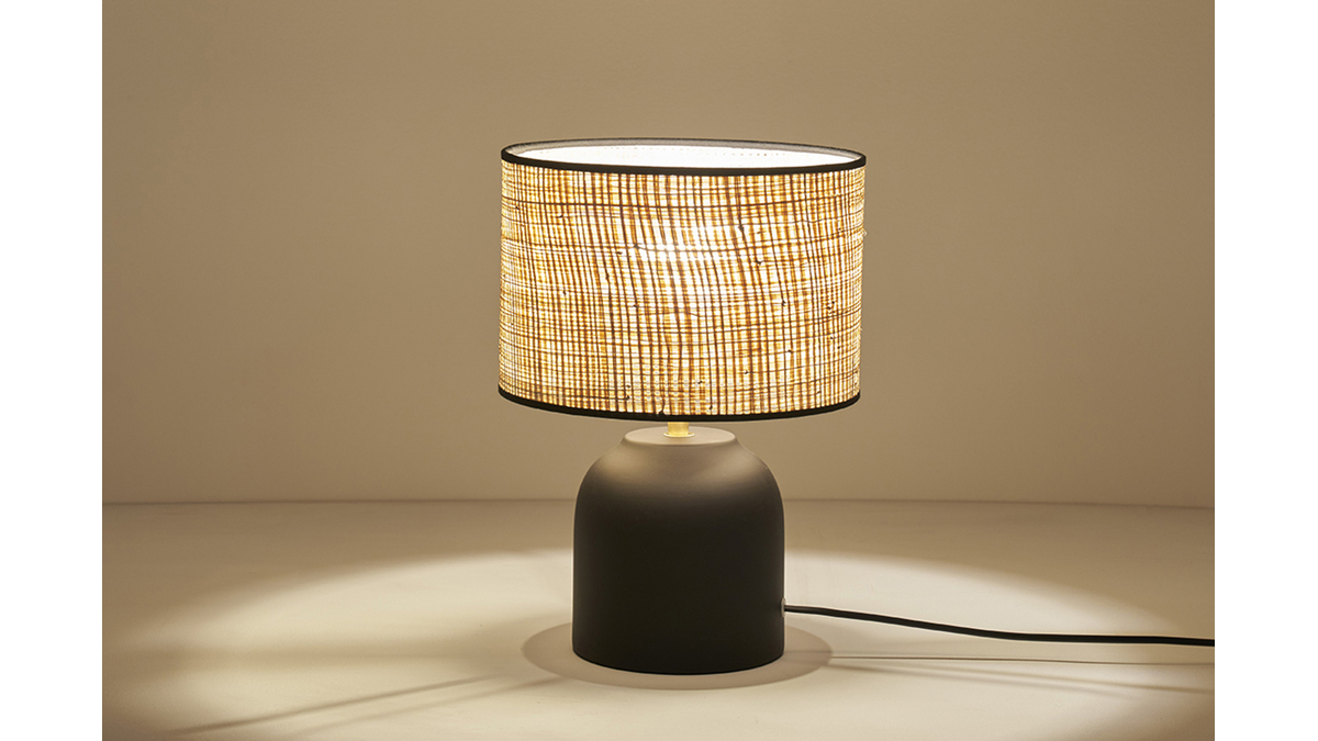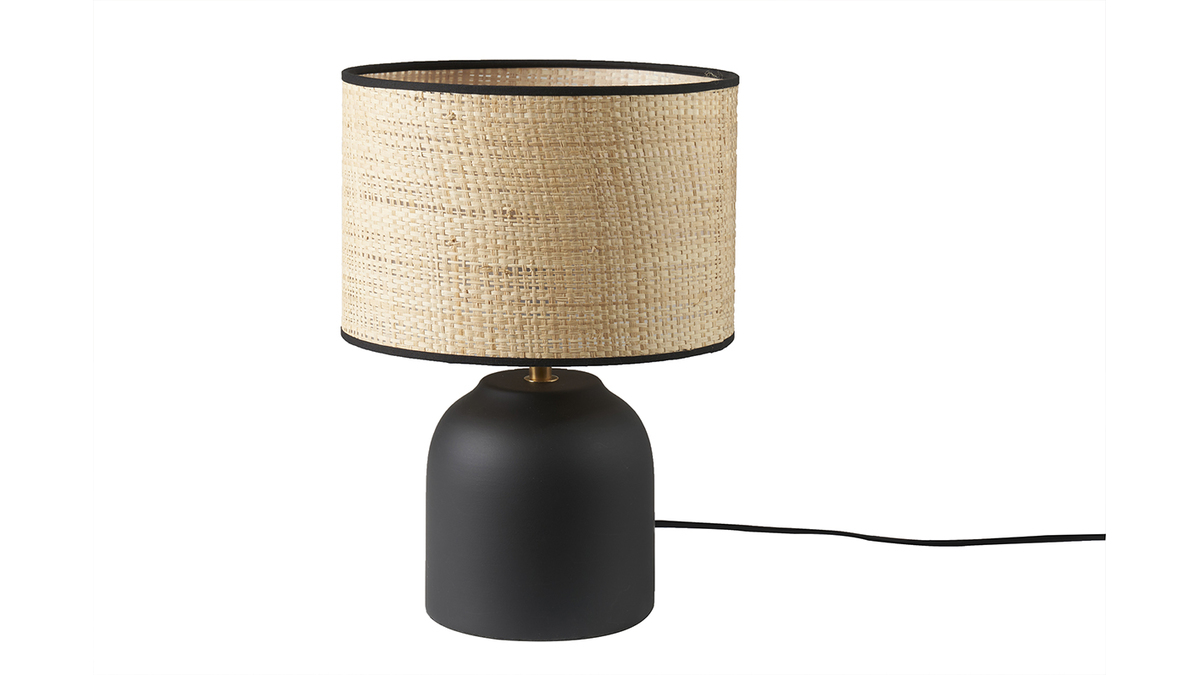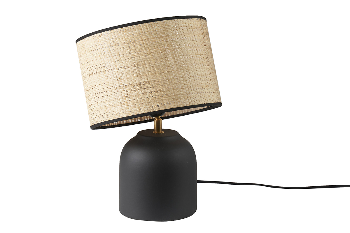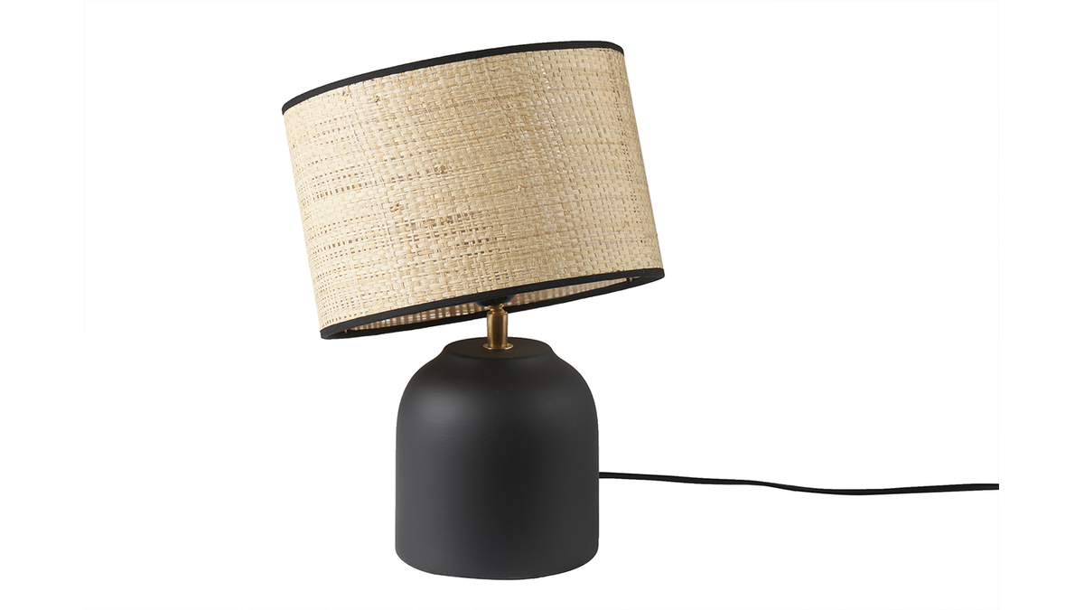 Avec la lampe à poser ROCHA, un superbe jeu de textures s'opère entre une base en céramique noire à la finition mate et un abat-jour en raphia souligné par un biais en coton noir.