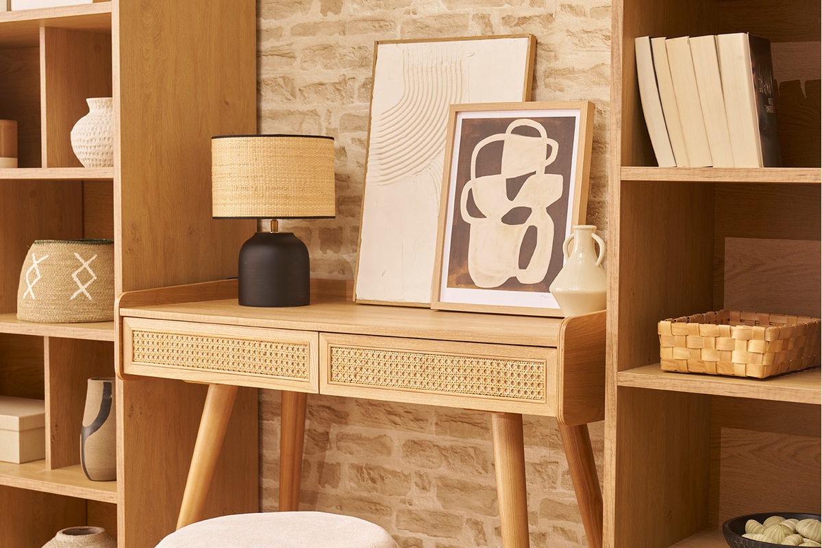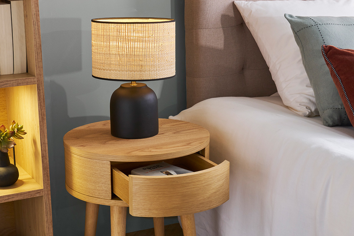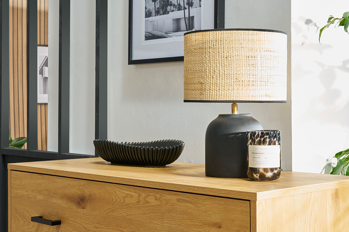 Avec la lampe à poser ROCHA, un superbe jeu de textures s'opère entre une base en céramique noire à la finition mate et un abat-jour en raphia souligné par un biais en coton noir.