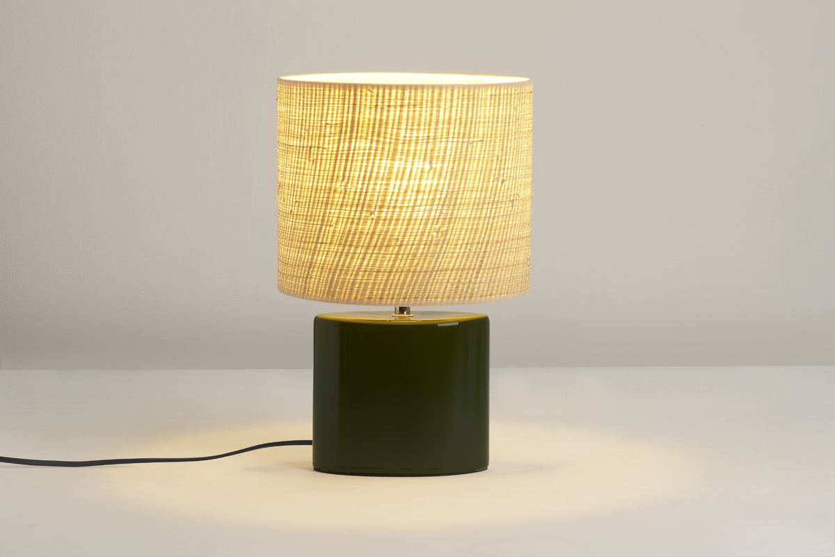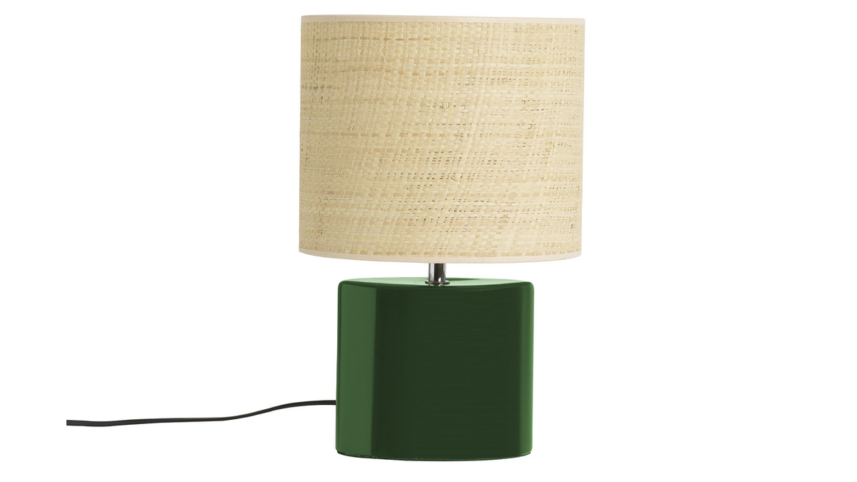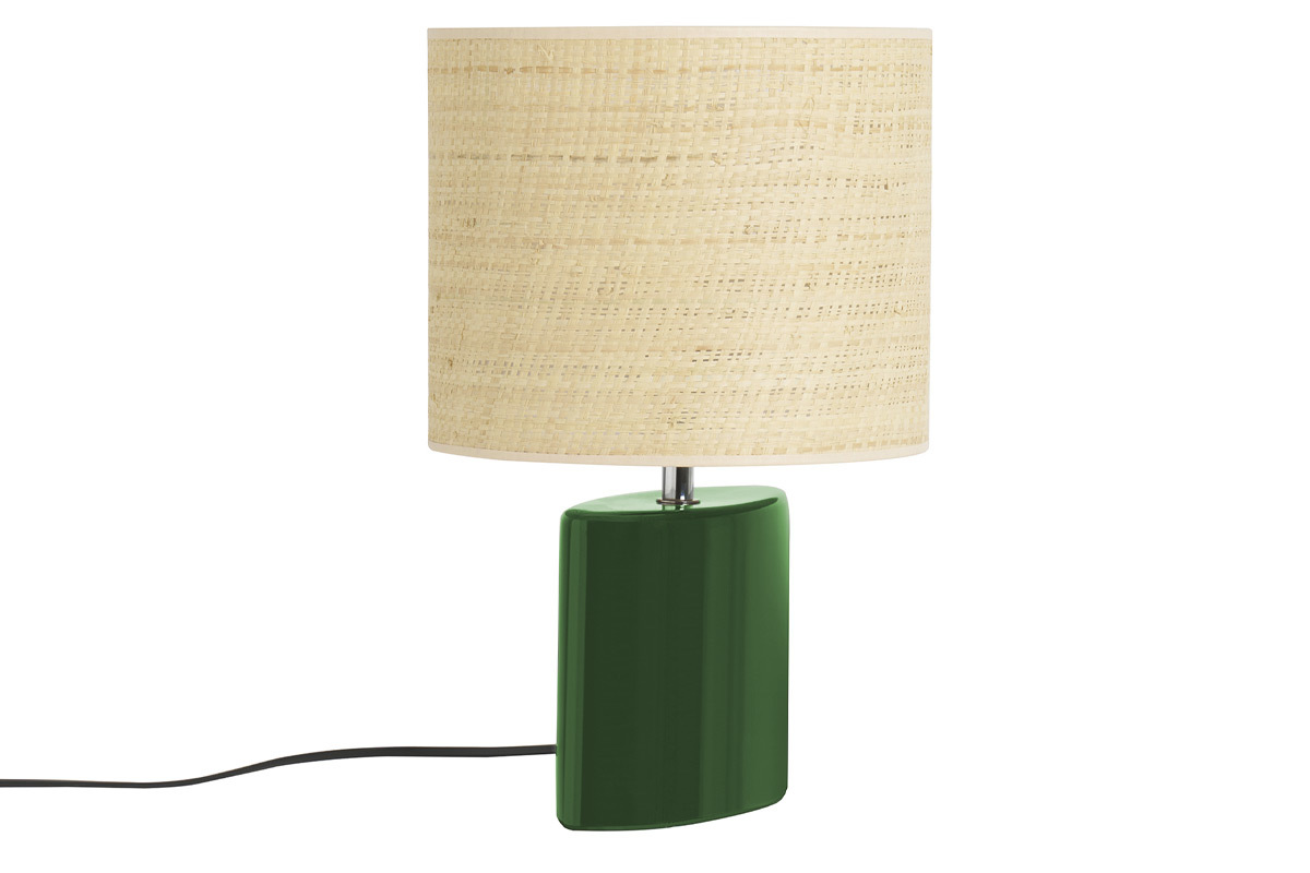 Ici, la base elliptique en céramique vert s'harmonise avec un abat-jour cylindrique, dont les biais en coton naturel se fondent au raphia texturé. Des matières naturelles et un élégant jeu de couleurs qui apporteront charme et authenticité à votre intérieur. Pour le plus grand bonheur des amateurs de déco ethnique chic, sa silhouette s'intégra volontiers dans un intérieur mêlant mobiliers exotiques et souvenirs de voyages...
