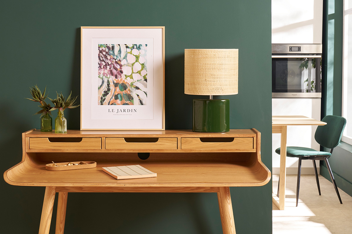 Aussi fonctionnelle que décorative, cette petite lampe à poser verte effet laqué sera également parfaite pour habiller un meuble de rangement ou une console dans une entrée. Son abat-jour en raphia apportera une lumière douce et cosy, parfaite pour créer une atmosphère tamisée et propice à la détente.