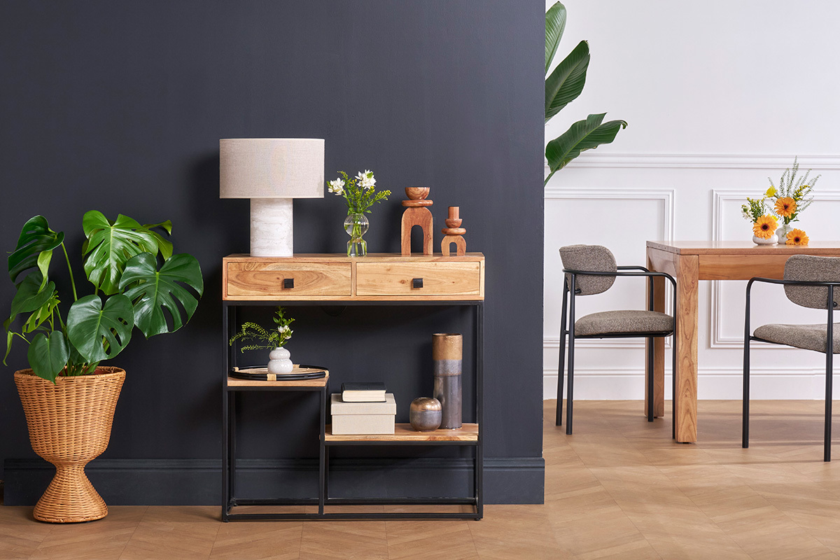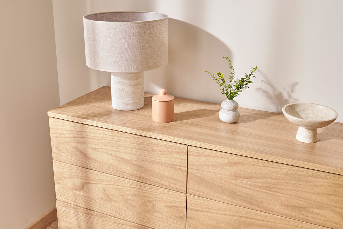 Quant à la silhouette de cette lampe à poser, elle mise sur des lignes simples et arrondies pour mettre en lumière le mix & match de matières.