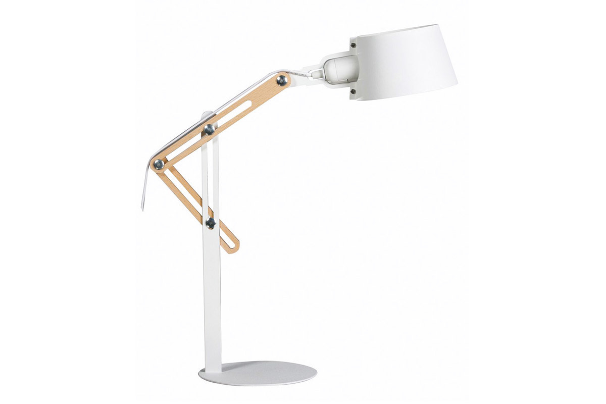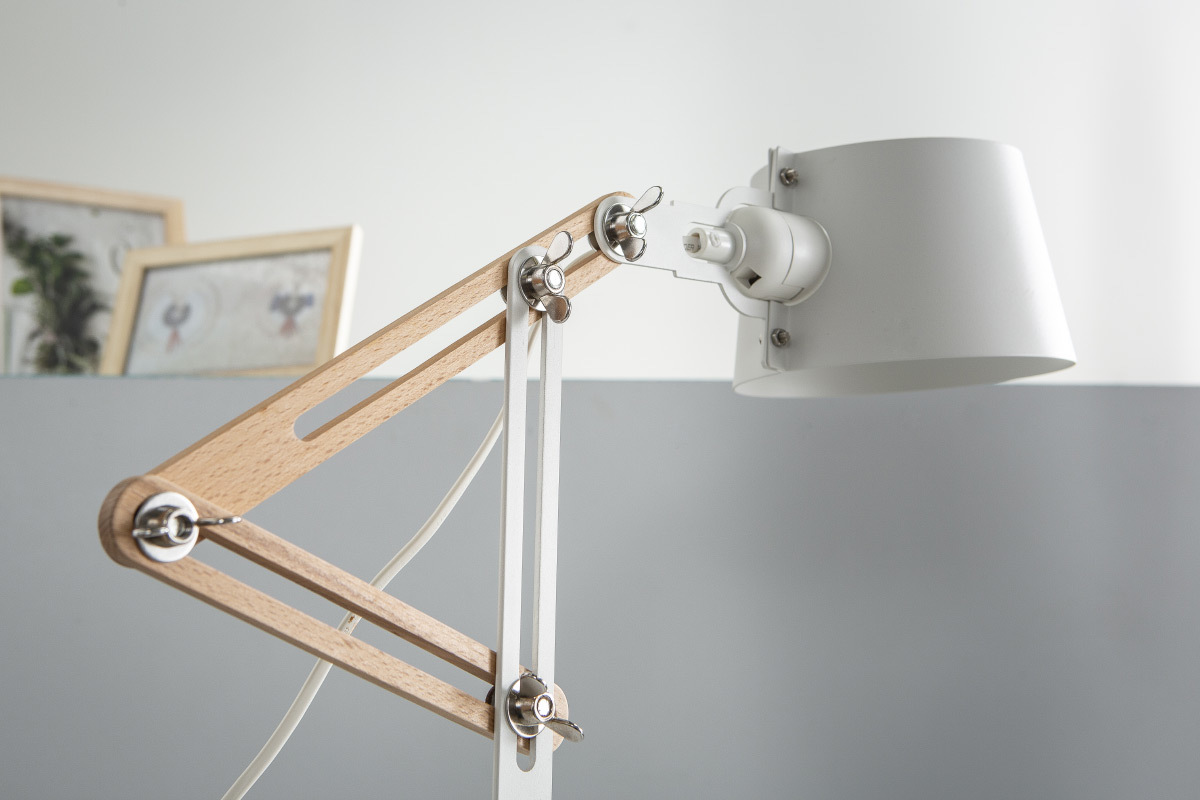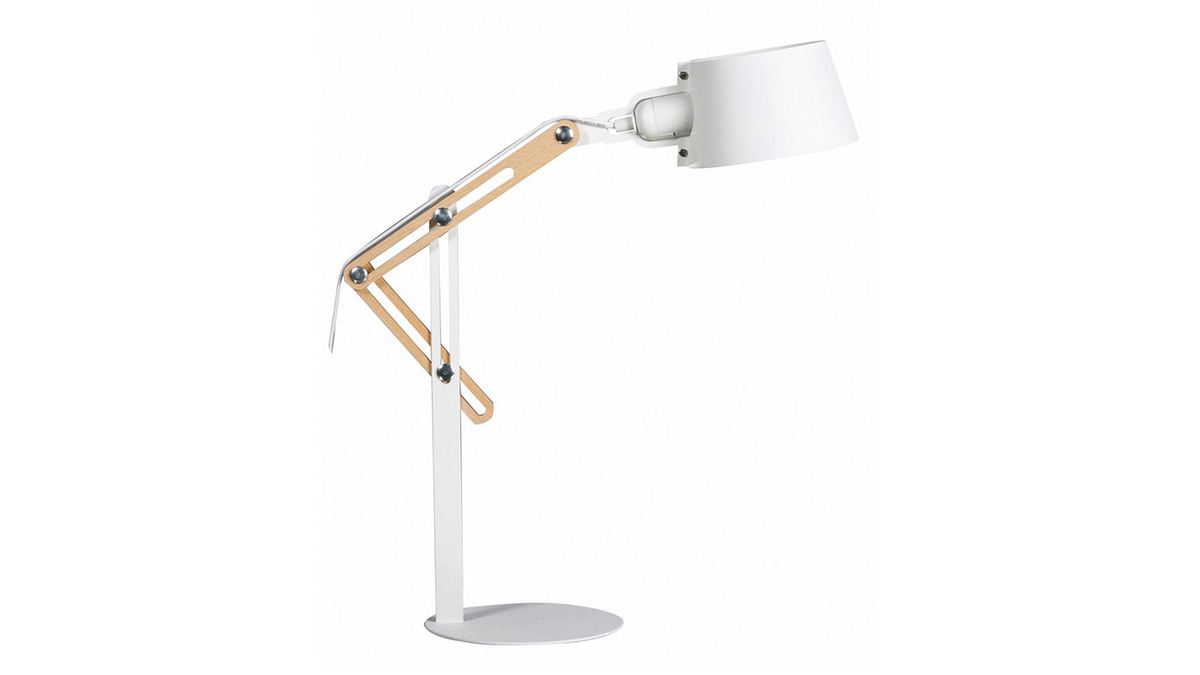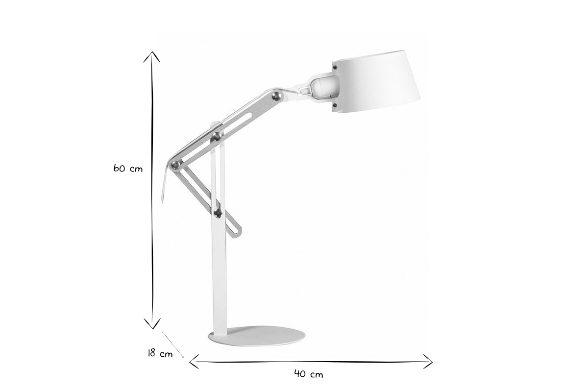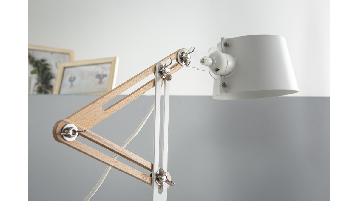 Son apparence, à la fois contemporaine et industrielle, lui permettra de s'intégrer facilement à votre intérieur. Composée de métal, elle possède également une partie de sa structure en bois clair qui permet de régler la hauteur et inclinaison de l'abat-jour. Cette petite lampe à poser blanche avec ses dimensions L40 x P18 x H60 cm sera donc idéale pour votre espace de travail comme sur une table de chevet en liseuse. Ultra pratique et esthétique.