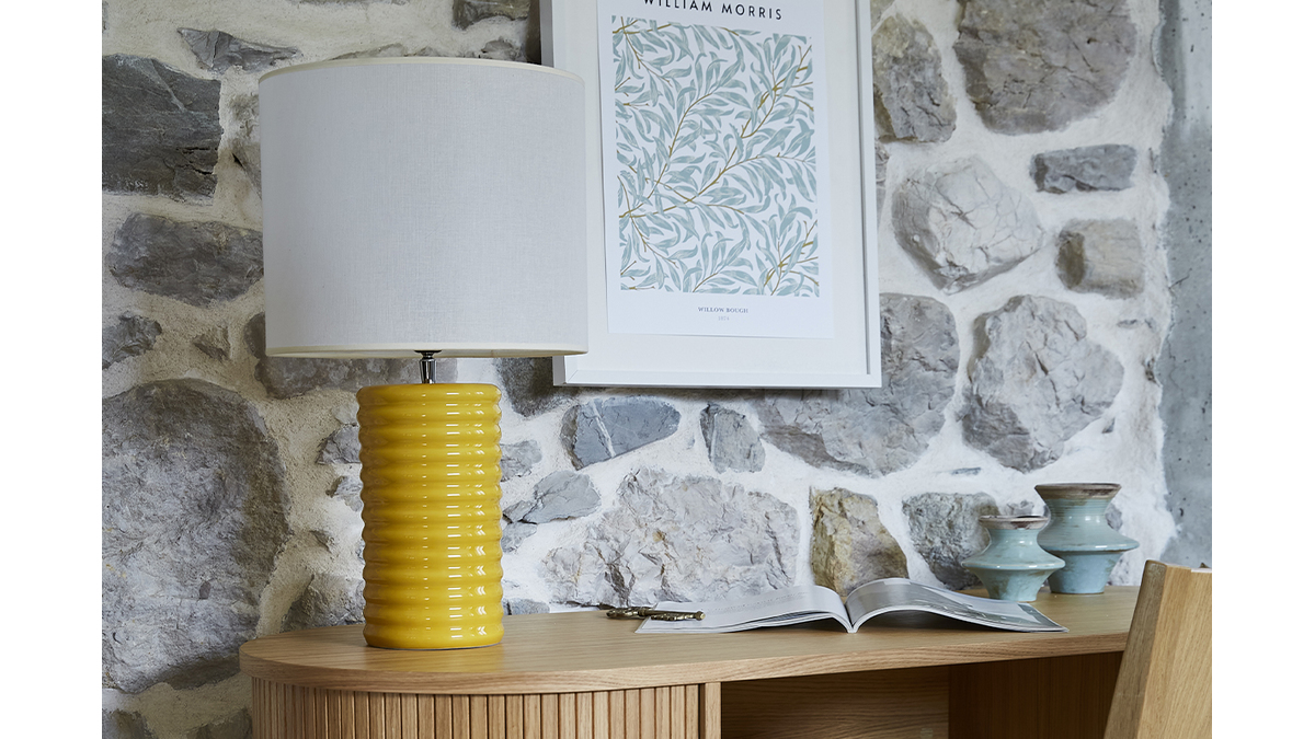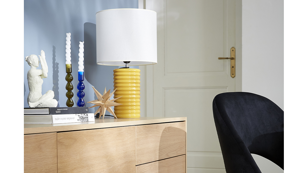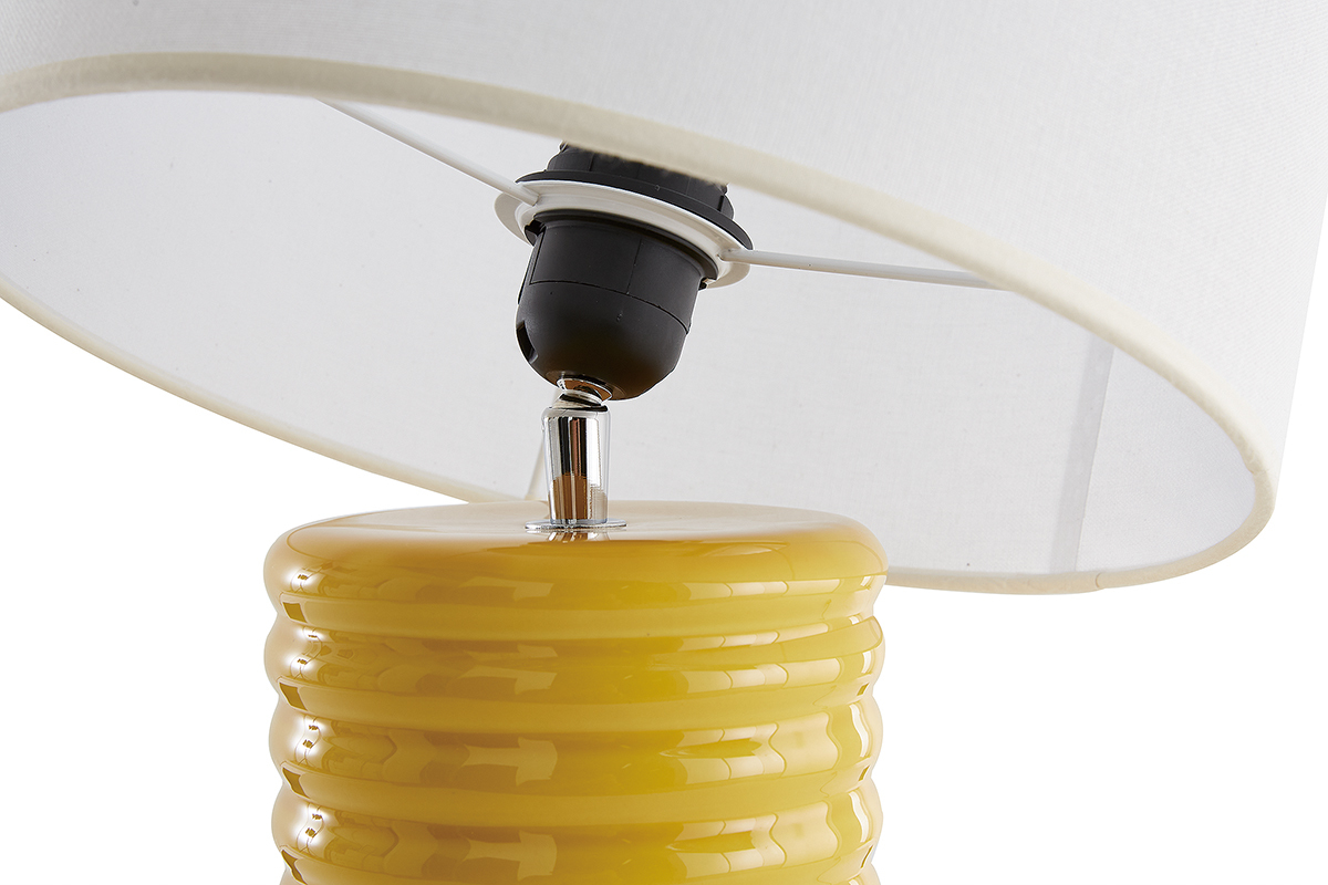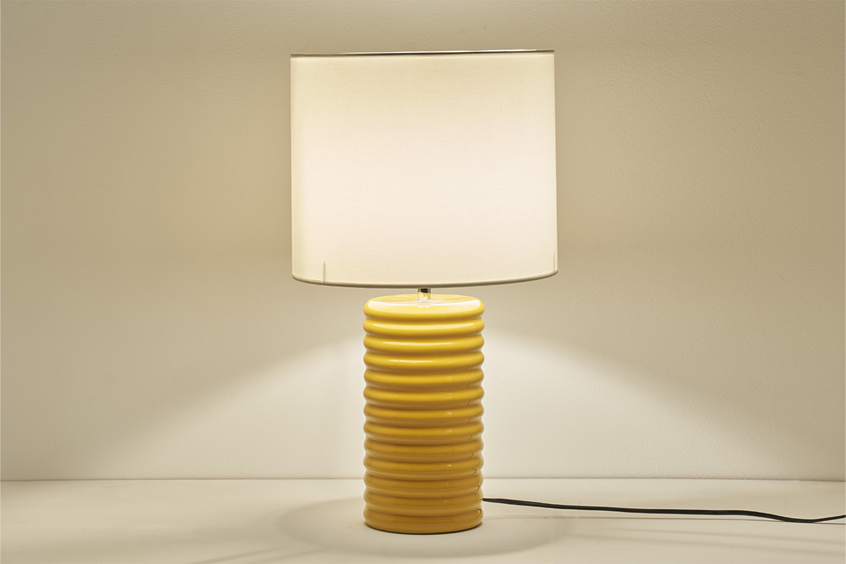 Coiffée d'un abat-jour cylindrique en coton écru bordé d'un liseré naturel, sa base élancée en céramique émaillée se pare d'un jaune vif : un tandem du plus bel effet ! La lumière est principalement orientée vers le haut et filtre également à travers l'abat-jour créant une atmosphère reposante et feutrée.