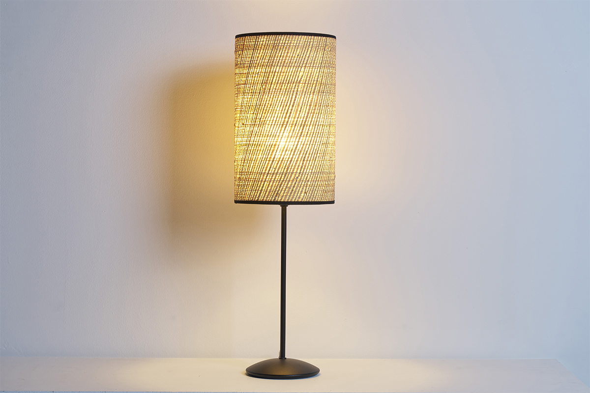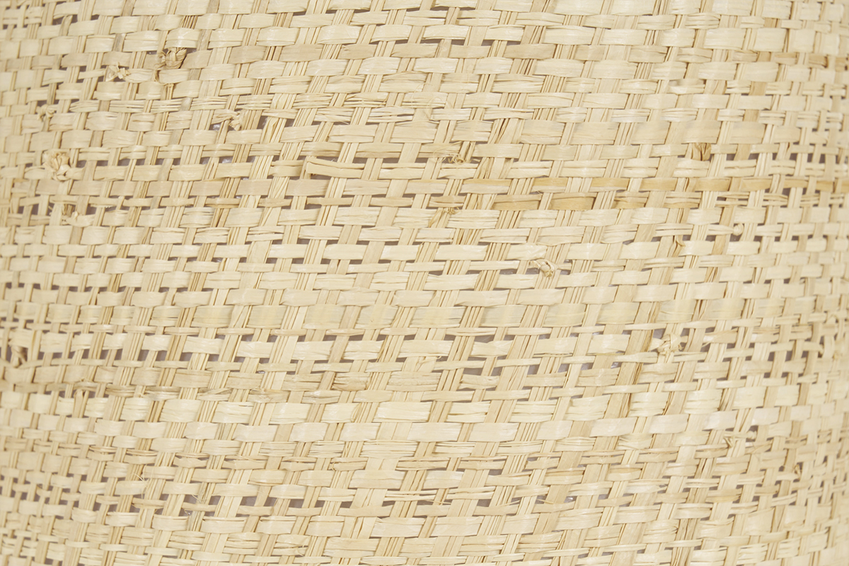 Matière : base en métal, abat-jour en rabane, biais en coton