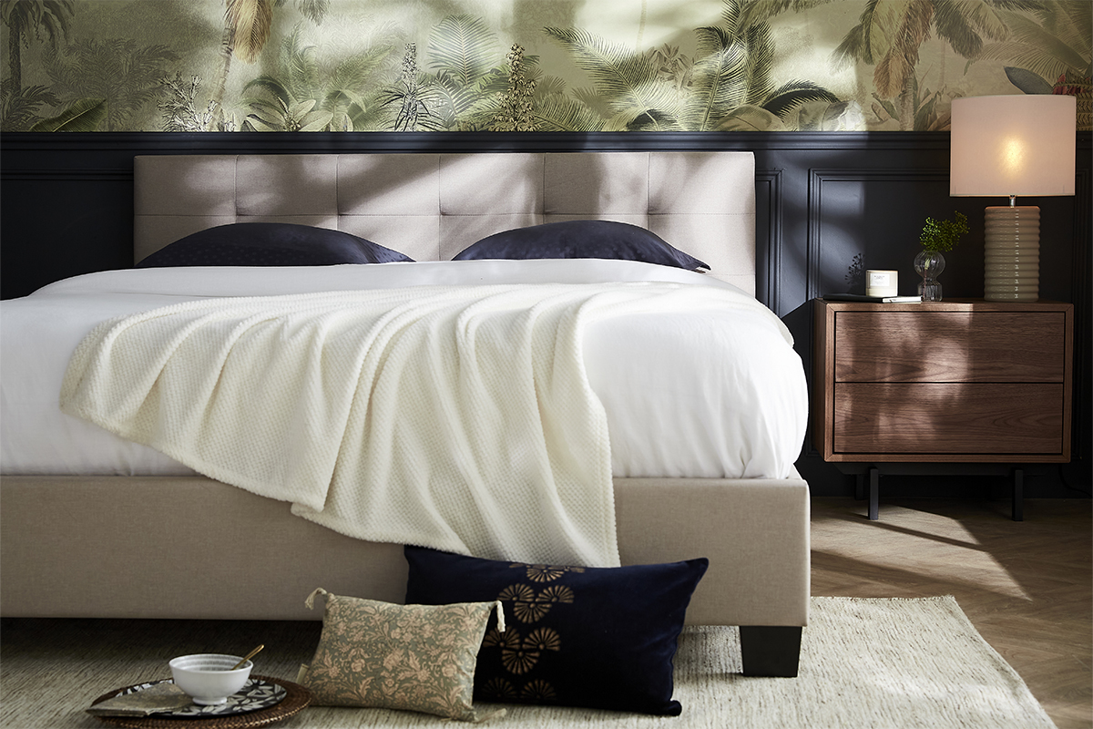 Si la tête de lit capitonnée est inspirée de la tendance classique chic, coloris beige et piètement large peint en noir évoquent un style moderne et sophistiqué caractéristique d'un style plus contemporain. Grâce au mariage de ces deux univers, le lit 160 MARQUISE trouvera sa place aussi bien dans une chambre romantique que dans une ambiance simple et épurée.