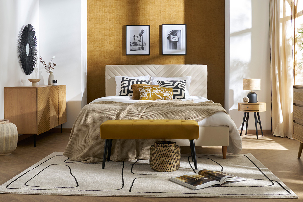 Associé à un confortable matelas 160x200 (vendu séparément), cadré par des luminaires design -comme un duo d'appliques murales ou de lampes à poser- ce lit 2 places beige 160x200 devient un véritable refuge...