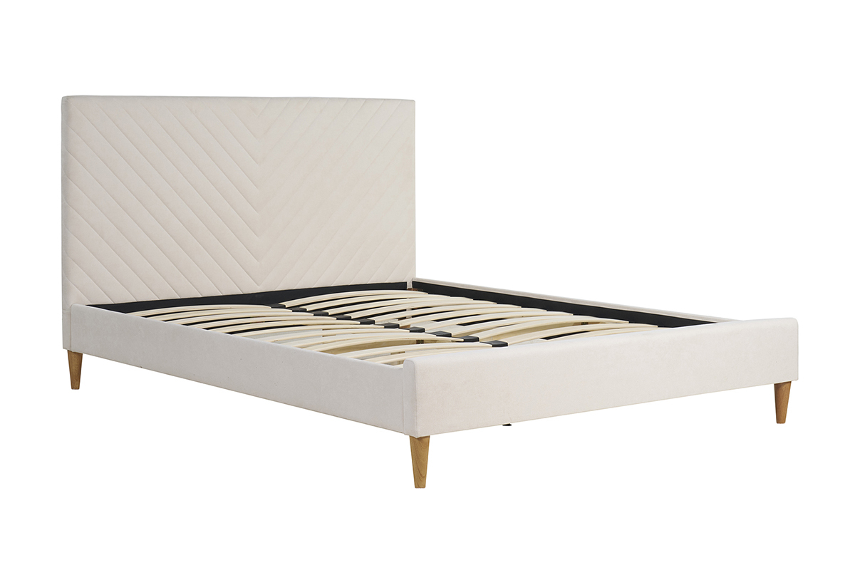 Composé d'un cadre et d'un sommier à lattes en bois, ce lit double 160x200 avec tête de lit intégrée se distingue par son revêtement en tissu beige (100% polyester).