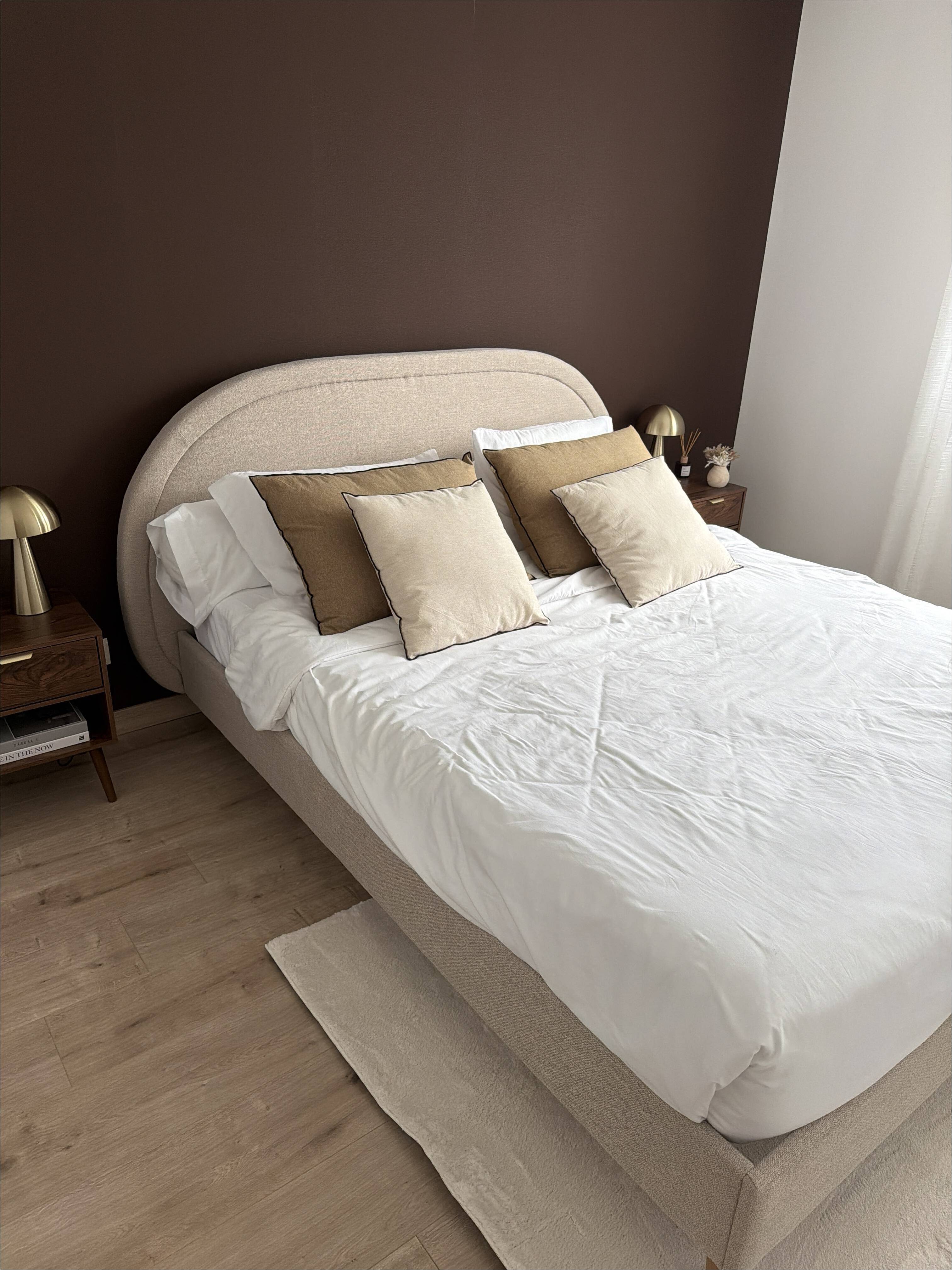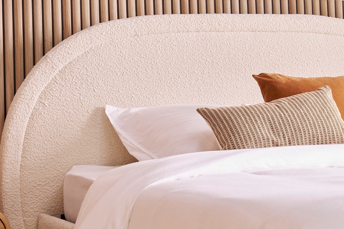 Hautement esthétique et véritable atout confort, la tête de lit ronde de ce lit queen size en tissu bouclette est caractérisée par son épais garnissage mousse. Adoptez ainsi la bonne posture pour visionner votre série préférée, profiter d'une lecture nocturne ou déguster votre petit-déjeuner au lit !