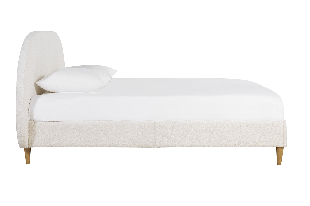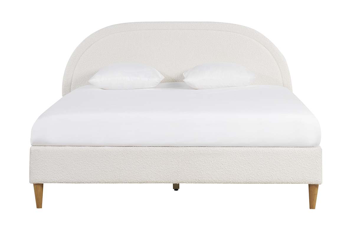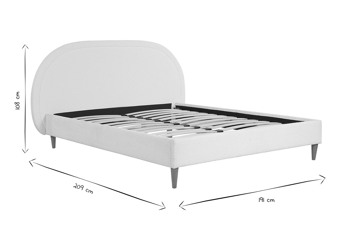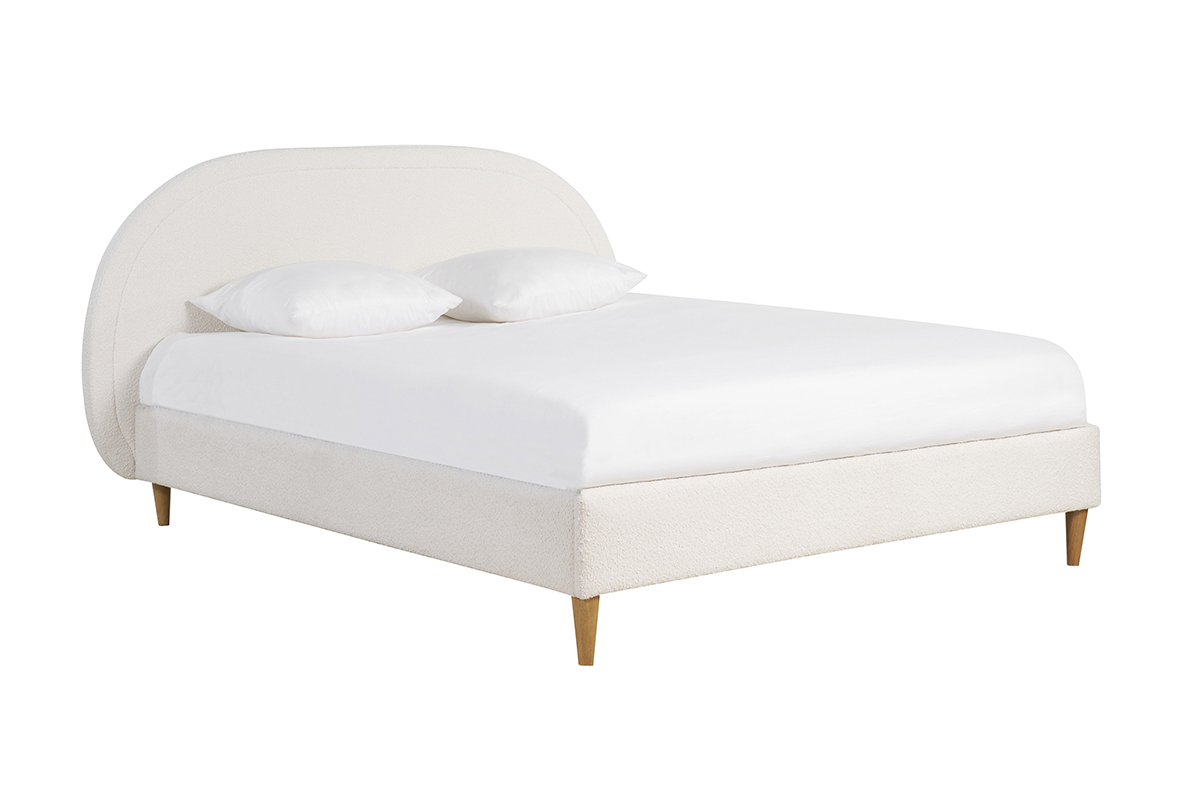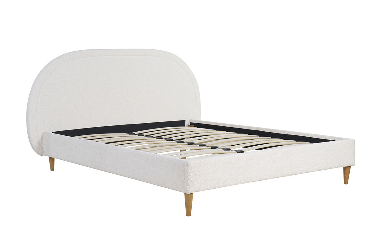 Composé d'une structure, d'un piètement et d'un sommier à lattes en bois, CHARLINE est un modèle de lit 2 places 160x200 qui se distingue par sa tête de lit arrondie et son revêtement en tissu effet laine bouclée.